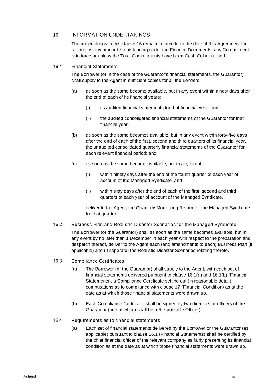 Ashurst 55 16. INFORMATION UNDERTAKINGS The undertakings in this clause 16 remain in force from the date of this Agreement for so long as any amount is outstanding under the Finance Documents, any Commitment is in force or unless the Total Commitments have been Cash Collateralised. Financial Statements The Borrower (or in the case of the Guarantor's financial statements, the Guarantor) shall supply to the Agent in sufficient copies for all the Lenders: (a) as soon as the same become available, but in any event within ninety days after the end of each of its financial years: (i) its audited financial statements for that financial year; and (ii) the audited consolidated financial statements of the Guarantor for that financial year; (b) as soon as the same becomes available, but in any event within forty-five days after the end of each of the first, second and third quarters of its financial year, the unaudited consolidated quarterly financial statements of the Guarantor for each relevant financial period; and (c) as soon as the same become available, but in any event: (i) within ninety days after the end of the fourth quarter of each year of account of the Managed Syndicate, and (ii) within sixty days after the end of each of the first, second and third quarters of each year of account of the Managed Syndicate, deliver to the Agent, the Quarterly Monitoring Return for the Managed Syndicate for that quarter. Business Plan and Realistic Disaster Scenarios for the Managed Syndicate The Borrower (or the Guarantor) shall as soon as the same becomes available, but in any event by no later than 1 December in each year with respect to the preparation and despatch thereof, deliver to the Agent each (and amendments to each) Business Plan (if applicable) and (if separate) the Realistic Disaster Scenarios relating thereto. Compliance Certificates (a) The Borrower (or the Guarantor) shall supply to the Agent, with each set of financial statements delivered pursuant to clause 16.1(a) and 16.1(b) (Financial Statements), a Compliance Certificate setting out (in reasonable detail) computations as to compliance with clause 17 (Financial Condition) as at the date as at which those financial statements were drawn up. (b) Each Compliance Certificate shall be signed by two directors or officers of the Guarantor (one of whom shall be a Responsible Officer). Requirements as to financial statements (a) Each set of financial statements delivered by the Borrower or the Guarantor (as applicable) pursuant to clause 16.1 (Financial Statements) shall be certified by the chief financial officer of the relevant company as fairly presenting its financial condition as at the date as at which those financial statements were drawn up.