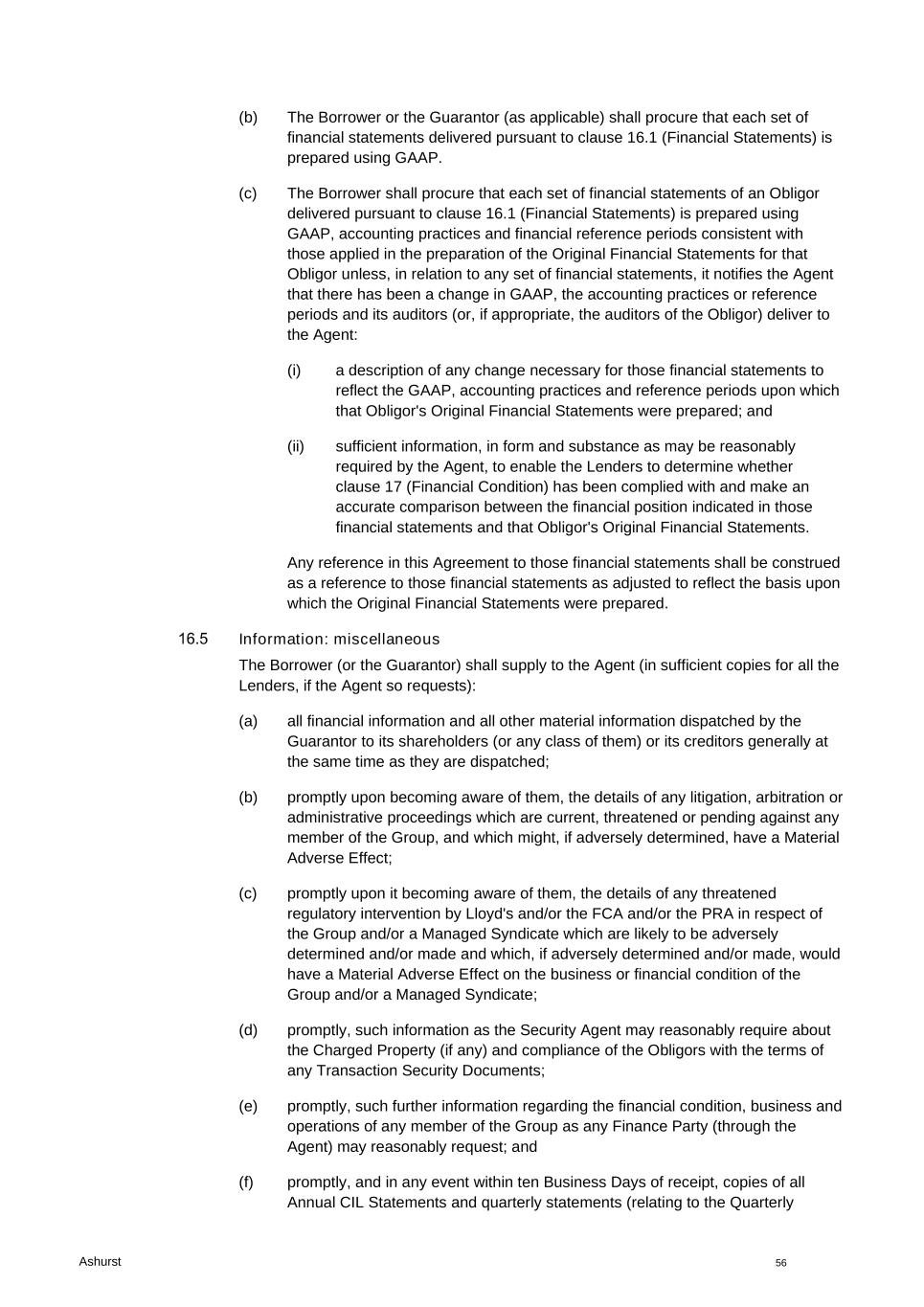 Ashurst 56 (b) The Borrower or the Guarantor (as applicable) shall procure that each set of financial statements delivered pursuant to clause 16.1 (Financial Statements) is prepared using GAAP. (c) The Borrower shall procure that each set of financial statements of an Obligor delivered pursuant to clause 16.1 (Financial Statements) is prepared using GAAP, accounting practices and financial reference periods consistent with those applied in the preparation of the Original Financial Statements for that Obligor unless, in relation to any set of financial statements, it notifies the Agent that there has been a change in GAAP, the accounting practices or reference periods and its auditors (or, if appropriate, the auditors of the Obligor) deliver to the Agent: (i) a description of any change necessary for those financial statements to reflect the GAAP, accounting practices and reference periods upon which that Obligor's Original Financial Statements were prepared; and (ii) sufficient information, in form and substance as may be reasonably required by the Agent, to enable the Lenders to determine whether clause 17 (Financial Condition) has been complied with and make an accurate comparison between the financial position indicated in those financial statements and that Obligor's Original Financial Statements. Any reference in this Agreement to those financial statements shall be construed as a reference to those financial statements as adjusted to reflect the basis upon which the Original Financial Statements were prepared. Information: miscellaneous The Borrower (or the Guarantor) shall supply to the Agent (in sufficient copies for all the Lenders, if the Agent so requests): (a) all financial information and all other material information dispatched by the Guarantor to its shareholders (or any class of them) or its creditors generally at the same time as they are dispatched; (b) promptly upon becoming aware of them, the details of any litigation, arbitration or administrative proceedings which are current, threatened or pending against any member of the Group, and which might, if adversely determined, have a Material Adverse Effect; (c) promptly upon it becoming aware of them, the details of any threatened regulatory intervention by Lloyd's and/or the FCA and/or the PRA in respect of the Group and/or a Managed Syndicate which are likely to be adversely determined and/or made and which, if adversely determined and/or made, would have a Material Adverse Effect on the business or financial condition of the Group and/or a Managed Syndicate; (d) promptly, such information as the Security Agent may reasonably require about the Charged Property (if any) and compliance of the Obligors with the terms of any Transaction Security Documents; (e) promptly, such further information regarding the financial condition, business and operations of any member of the Group as any Finance Party (through the Agent) may reasonably request; and (f) promptly, and in any event within ten Business Days of receipt, copies of all Annual CIL Statements and quarterly statements (relating to the Quarterly