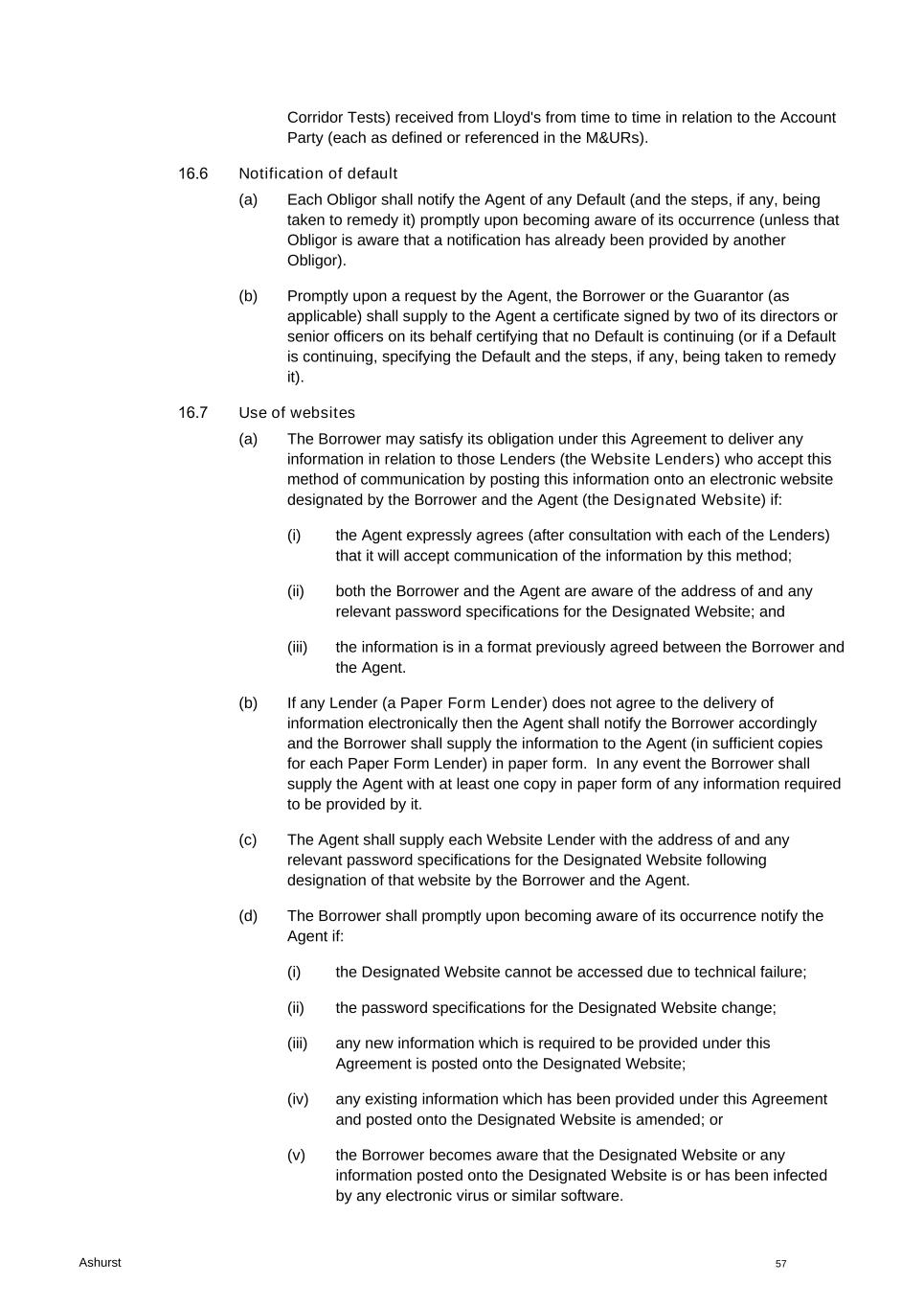 Ashurst 57 Corridor Tests) received from Lloyd's from time to time in relation to the Account Party (each as defined or referenced in the M&URs). Notification of default (a) Each Obligor shall notify the Agent of any Default (and the steps, if any, being taken to remedy it) promptly upon becoming aware of its occurrence (unless that Obligor is aware that a notification has already been provided by another Obligor). (b) Promptly upon a request by the Agent, the Borrower or the Guarantor (as applicable) shall supply to the Agent a certificate signed by two of its directors or senior officers on its behalf certifying that no Default is continuing (or if a Default is continuing, specifying the Default and the steps, if any, being taken to remedy it). Use of websites (a) The Borrower may satisfy its obligation under this Agreement to deliver any information in relation to those Lenders (the Website Lenders) who accept this method of communication by posting this information onto an electronic website designated by the Borrower and the Agent (the Designated Website) if: (i) the Agent expressly agrees (after consultation with each of the Lenders) that it will accept communication of the information by this method; (ii) both the Borrower and the Agent are aware of the address of and any relevant password specifications for the Designated Website; and (iii) the information is in a format previously agreed between the Borrower and the Agent. (b) If any Lender (a Paper Form Lender) does not agree to the delivery of information electronically then the Agent shall notify the Borrower accordingly and the Borrower shall supply the information to the Agent (in sufficient copies for each Paper Form Lender) in paper form. In any event the Borrower shall supply the Agent with at least one copy in paper form of any information required to be provided by it. (c) The Agent shall supply each Website Lender with the address of and any relevant password specifications for the Designated Website following designation of that website by the Borrower and the Agent. (d) The Borrower shall promptly upon becoming aware of its occurrence notify the Agent if: (i) the Designated Website cannot be accessed due to technical failure; (ii) the password specifications for the Designated Website change; (iii) any new information which is required to be provided under this Agreement is posted onto the Designated Website; (iv) any existing information which has been provided under this Agreement and posted onto the Designated Website is amended; or (v) the Borrower becomes aware that the Designated Website or any information posted onto the Designated Website is or has been infected by any electronic virus or similar software.
