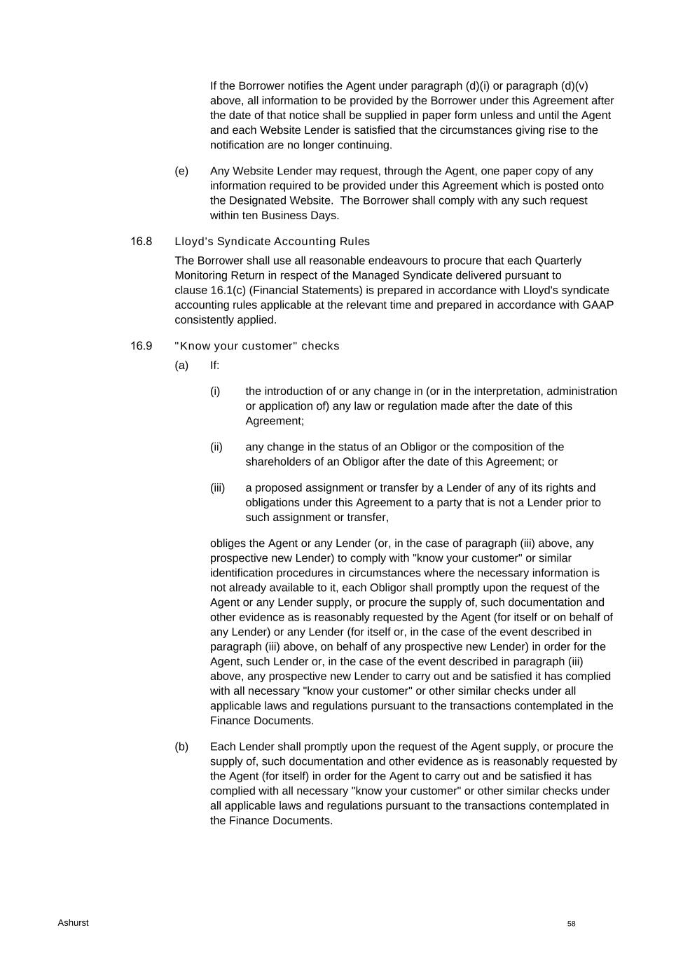 Ashurst 58 If the Borrower notifies the Agent under paragraph (d)(i) or paragraph (d)(v) above, all information to be provided by the Borrower under this Agreement after the date of that notice shall be supplied in paper form unless and until the Agent and each Website Lender is satisfied that the circumstances giving rise to the notification are no longer continuing. (e) Any Website Lender may request, through the Agent, one paper copy of any information required to be provided under this Agreement which is posted onto the Designated Website. The Borrower shall comply with any such request within ten Business Days. Lloyd's Syndicate Accounting Rules The Borrower shall use all reasonable endeavours to procure that each Quarterly Monitoring Return in respect of the Managed Syndicate delivered pursuant to clause 16.1(c) (Financial Statements) is prepared in accordance with Lloyd's syndicate accounting rules applicable at the relevant time and prepared in accordance with GAAP consistently applied. "Know your customer" checks (a) If: (i) the introduction of or any change in (or in the interpretation, administration or application of) any law or regulation made after the date of this Agreement; (ii) any change in the status of an Obligor or the composition of the shareholders of an Obligor after the date of this Agreement; or (iii) a proposed assignment or transfer by a Lender of any of its rights and obligations under this Agreement to a party that is not a Lender prior to such assignment or transfer, obliges the Agent or any Lender (or, in the case of paragraph (iii) above, any prospective new Lender) to comply with "know your customer" or similar identification procedures in circumstances where the necessary information is not already available to it, each Obligor shall promptly upon the request of the Agent or any Lender supply, or procure the supply of, such documentation and other evidence as is reasonably requested by the Agent (for itself or on behalf of any Lender) or any Lender (for itself or, in the case of the event described in paragraph (iii) above, on behalf of any prospective new Lender) in order for the Agent, such Lender or, in the case of the event described in paragraph (iii) above, any prospective new Lender to carry out and be satisfied it has complied with all necessary "know your customer" or other similar checks under all applicable laws and regulations pursuant to the transactions contemplated in the Finance Documents. (b) Each Lender shall promptly upon the request of the Agent supply, or procure the supply of, such documentation and other evidence as is reasonably requested by the Agent (for itself) in order for the Agent to carry out and be satisfied it has complied with all necessary "know your customer" or other similar checks under all applicable laws and regulations pursuant to the transactions contemplated in the Finance Documents.