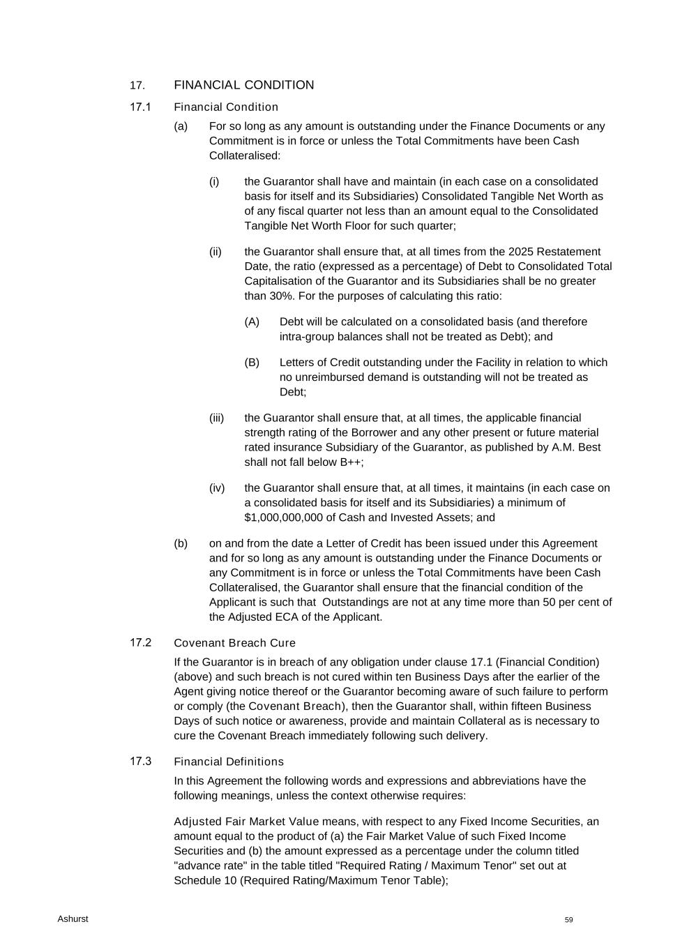 Ashurst 59 17. FINANCIAL CONDITION Financial Condition (a) For so long as any amount is outstanding under the Finance Documents or any Commitment is in force or unless the Total Commitments have been Cash Collateralised: (i) the Guarantor shall have and maintain (in each case on a consolidated basis for itself and its Subsidiaries) Consolidated Tangible Net Worth as of any fiscal quarter not less than an amount equal to the Consolidated Tangible Net Worth Floor for such quarter; (ii) the Guarantor shall ensure that, at all times from the 2025 Restatement Date, the ratio (expressed as a percentage) of Debt to Consolidated Total Capitalisation of the Guarantor and its Subsidiaries shall be no greater than 30%. For the purposes of calculating this ratio: (A) Debt will be calculated on a consolidated basis (and therefore intra-group balances shall not be treated as Debt); and (B) Letters of Credit outstanding under the Facility in relation to which no unreimbursed demand is outstanding will not be treated as Debt; (iii) the Guarantor shall ensure that, at all times, the applicable financial strength rating of the Borrower and any other present or future material rated insurance Subsidiary of the Guarantor, as published by A.M. Best shall not fall below B++; (iv) the Guarantor shall ensure that, at all times, it maintains (in each case on a consolidated basis for itself and its Subsidiaries) a minimum of $1,000,000,000 of Cash and Invested Assets; and (b) on and from the date a Letter of Credit has been issued under this Agreement and for so long as any amount is outstanding under the Finance Documents or any Commitment is in force or unless the Total Commitments have been Cash Collateralised, the Guarantor shall ensure that the financial condition of the Applicant is such that Outstandings are not at any time more than 50 per cent of the Adjusted ECA of the Applicant. Covenant Breach Cure If the Guarantor is in breach of any obligation under clause 17.1 (Financial Condition) (above) and such breach is not cured within ten Business Days after the earlier of the Agent giving notice thereof or the Guarantor becoming aware of such failure to perform or comply (the Covenant Breach), then the Guarantor shall, within fifteen Business Days of such notice or awareness, provide and maintain Collateral as is necessary to cure the Covenant Breach immediately following such delivery. Financial Definitions In this Agreement the following words and expressions and abbreviations have the following meanings, unless the context otherwise requires: Adjusted Fair Market Value means, with respect to any Fixed Income Securities, an amount equal to the product of (a) the Fair Market Value of such Fixed Income Securities and (b) the amount expressed as a percentage under the column titled "advance rate" in the table titled "Required Rating / Maximum Tenor" set out at Schedule 10 (Required Rating/Maximum Tenor Table);