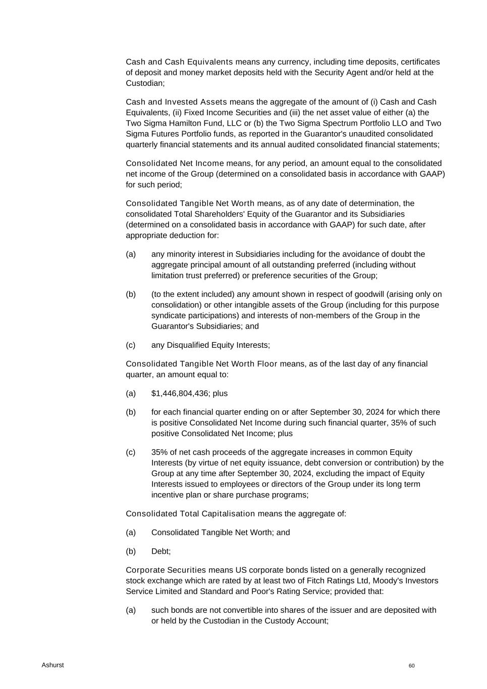 Ashurst 60 Cash and Cash Equivalents means any currency, including time deposits, certificates of deposit and money market deposits held with the Security Agent and/or held at the Custodian; Cash and Invested Assets means the aggregate of the amount of (i) Cash and Cash Equivalents, (ii) Fixed Income Securities and (iii) the net asset value of either (a) the Two Sigma Hamilton Fund, LLC or (b) the Two Sigma Spectrum Portfolio LLO and Two Sigma Futures Portfolio funds, as reported in the Guarantor's unaudited consolidated quarterly financial statements and its annual audited consolidated financial statements; Consolidated Net Income means, for any period, an amount equal to the consolidated net income of the Group (determined on a consolidated basis in accordance with GAAP) for such period; Consolidated Tangible Net Worth means, as of any date of determination, the consolidated Total Shareholders' Equity of the Guarantor and its Subsidiaries (determined on a consolidated basis in accordance with GAAP) for such date, after appropriate deduction for: (a) any minority interest in Subsidiaries including for the avoidance of doubt the aggregate principal amount of all outstanding preferred (including without limitation trust preferred) or preference securities of the Group; (b) (to the extent included) any amount shown in respect of goodwill (arising only on consolidation) or other intangible assets of the Group (including for this purpose syndicate participations) and interests of non-members of the Group in the Guarantor's Subsidiaries; and (c) any Disqualified Equity Interests; Consolidated Tangible Net Worth Floor means, as of the last day of any financial quarter, an amount equal to: (a) $1,446,804,436; plus (b) for each financial quarter ending on or after September 30, 2024 for which there is positive Consolidated Net Income during such financial quarter, 35% of such positive Consolidated Net Income; plus (c) 35% of net cash proceeds of the aggregate increases in common Equity Interests (by virtue of net equity issuance, debt conversion or contribution) by the Group at any time after September 30, 2024, excluding the impact of Equity Interests issued to employees or directors of the Group under its long term incentive plan or share purchase programs; Consolidated Total Capitalisation means the aggregate of: (a) Consolidated Tangible Net Worth; and (b) Debt; Corporate Securities means US corporate bonds listed on a generally recognized stock exchange which are rated by at least two of Fitch Ratings Ltd, Moody's Investors Service Limited and Standard and Poor's Rating Service; provided that: (a) such bonds are not convertible into shares of the issuer and are deposited with or held by the Custodian in the Custody Account;