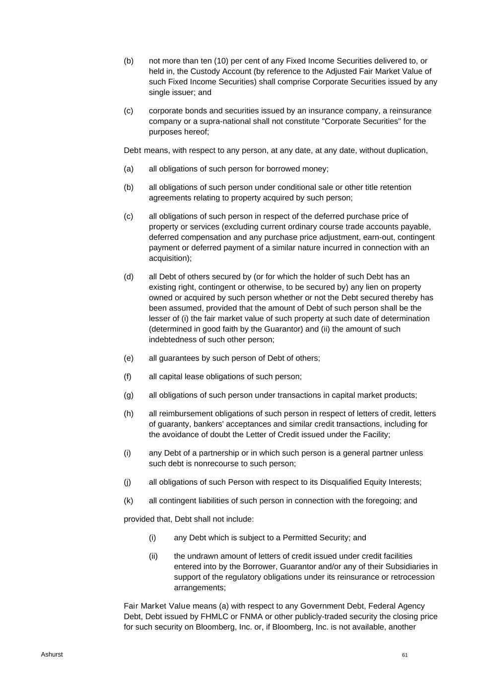 Ashurst 61 (b) not more than ten (10) per cent of any Fixed Income Securities delivered to, or held in, the Custody Account (by reference to the Adjusted Fair Market Value of such Fixed Income Securities) shall comprise Corporate Securities issued by any single issuer; and (c) corporate bonds and securities issued by an insurance company, a reinsurance company or a supra-national shall not constitute "Corporate Securities" for the purposes hereof; Debt means, with respect to any person, at any date, at any date, without duplication, (a) all obligations of such person for borrowed money; (b) all obligations of such person under conditional sale or other title retention agreements relating to property acquired by such person; (c) all obligations of such person in respect of the deferred purchase price of property or services (excluding current ordinary course trade accounts payable, deferred compensation and any purchase price adjustment, earn-out, contingent payment or deferred payment of a similar nature incurred in connection with an acquisition); (d) all Debt of others secured by (or for which the holder of such Debt has an existing right, contingent or otherwise, to be secured by) any lien on property owned or acquired by such person whether or not the Debt secured thereby has been assumed, provided that the amount of Debt of such person shall be the lesser of (i) the fair market value of such property at such date of determination (determined in good faith by the Guarantor) and (ii) the amount of such indebtedness of such other person; (e) all guarantees by such person of Debt of others; (f) all capital lease obligations of such person; (g) all obligations of such person under transactions in capital market products; (h) all reimbursement obligations of such person in respect of letters of credit, letters of guaranty, bankers' acceptances and similar credit transactions, including for the avoidance of doubt the Letter of Credit issued under the Facility; (i) any Debt of a partnership or in which such person is a general partner unless such debt is nonrecourse to such person; (j) all obligations of such Person with respect to its Disqualified Equity Interests; (k) all contingent liabilities of such person in connection with the foregoing; and provided that, Debt shall not include: (i) any Debt which is subject to a Permitted Security; and (ii) the undrawn amount of letters of credit issued under credit facilities entered into by the Borrower, Guarantor and/or any of their Subsidiaries in support of the regulatory obligations under its reinsurance or retrocession arrangements; Fair Market Value means (a) with respect to any Government Debt, Federal Agency Debt, Debt issued by FHMLC or FNMA or other publicly-traded security the closing price for such security on Bloomberg, Inc. or, if Bloomberg, Inc. is not available, another