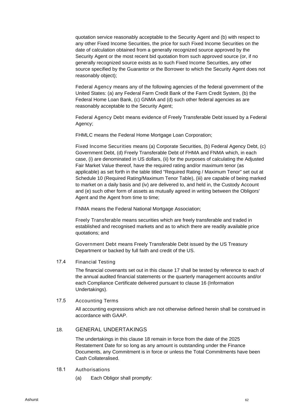Ashurst 62 quotation service reasonably acceptable to the Security Agent and (b) with respect to any other Fixed Income Securities, the price for such Fixed Income Securities on the date of calculation obtained from a generally recognized source approved by the Security Agent or the most recent bid quotation from such approved source (or, if no generally recognized source exists as to such Fixed Income Securities, any other source specified by the Guarantor or the Borrower to which the Security Agent does not reasonably object); Federal Agency means any of the following agencies of the federal government of the United States: (a) any Federal Farm Credit Bank of the Farm Credit System, (b) the Federal Home Loan Bank, (c) GNMA and (d) such other federal agencies as are reasonably acceptable to the Security Agent; Federal Agency Debt means evidence of Freely Transferable Debt issued by a Federal Agency; FHMLC means the Federal Home Mortgage Loan Corporation; Fixed Income Securities means (a) Corporate Securities, (b) Federal Agency Debt, (c) Government Debt, (d) Freely Transferable Debt of FHMA and FNMA which, in each case, (i) are denominated in US dollars, (ii) for the purposes of calculating the Adjusted Fair Market Value thereof, have the required rating and/or maximum tenor (as applicable) as set forth in the table titled "Required Rating / Maximum Tenor" set out at Schedule 10 (Required Rating/Maximum Tenor Table), (iii) are capable of being marked to market on a daily basis and (iv) are delivered to, and held in, the Custody Account and (e) such other form of assets as mutually agreed in writing between the Obligors' Agent and the Agent from time to time; FNMA means the Federal National Mortgage Association; Freely Transferable means securities which are freely transferable and traded in established and recognised markets and as to which there are readily available price quotations; and Government Debt means Freely Transferable Debt issued by the US Treasury Department or backed by full faith and credit of the US. Financial Testing The financial covenants set out in this clause 17 shall be tested by reference to each of the annual audited financial statements or the quarterly management accounts and/or each Compliance Certificate delivered pursuant to clause 16 (Information Undertakings). Accounting Terms All accounting expressions which are not otherwise defined herein shall be construed in accordance with GAAP. 18. GENERAL UNDERTAKINGS The undertakings in this clause 18 remain in force from the date of the 2025 Restatement Date for so long as any amount is outstanding under the Finance Documents, any Commitment is in force or unless the Total Commitments have been Cash Collateralised. Authorisations (a) Each Obligor shall promptly: