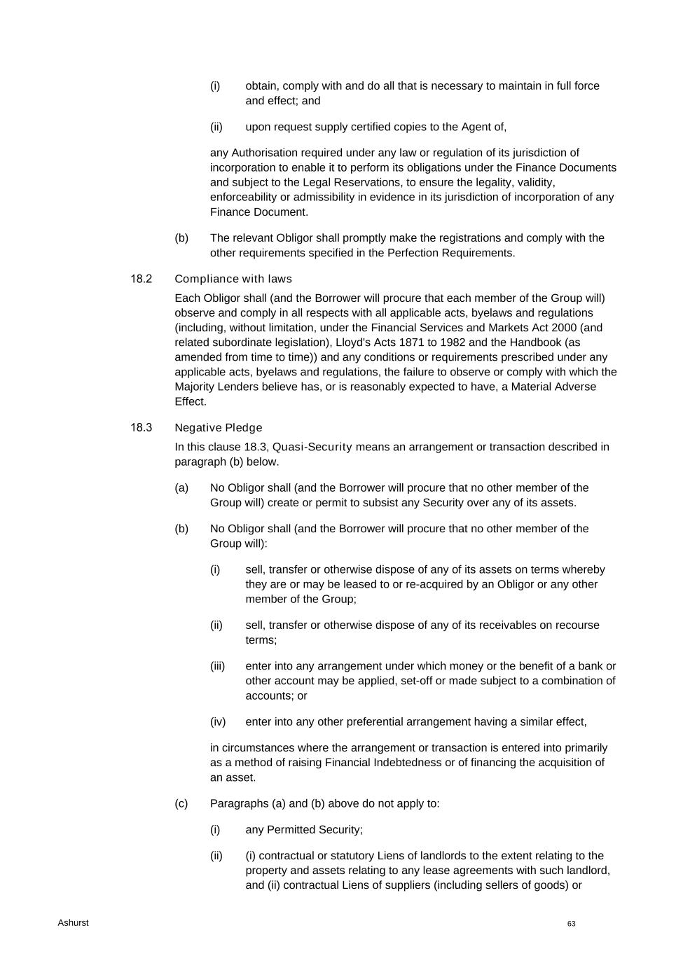 Ashurst 63 (i) obtain, comply with and do all that is necessary to maintain in full force and effect; and (ii) upon request supply certified copies to the Agent of, any Authorisation required under any law or regulation of its jurisdiction of incorporation to enable it to perform its obligations under the Finance Documents and subject to the Legal Reservations, to ensure the legality, validity, enforceability or admissibility in evidence in its jurisdiction of incorporation of any Finance Document. (b) The relevant Obligor shall promptly make the registrations and comply with the other requirements specified in the Perfection Requirements. Compliance with laws Each Obligor shall (and the Borrower will procure that each member of the Group will) observe and comply in all respects with all applicable acts, byelaws and regulations (including, without limitation, under the Financial Services and Markets Act 2000 (and related subordinate legislation), Lloyd's Acts 1871 to 1982 and the Handbook (as amended from time to time)) and any conditions or requirements prescribed under any applicable acts, byelaws and regulations, the failure to observe or comply with which the Majority Lenders believe has, or is reasonably expected to have, a Material Adverse Effect. Negative Pledge In this clause 18.3, Quasi-Security means an arrangement or transaction described in paragraph (b) below. (a) No Obligor shall (and the Borrower will procure that no other member of the Group will) create or permit to subsist any Security over any of its assets. (b) No Obligor shall (and the Borrower will procure that no other member of the Group will): (i) sell, transfer or otherwise dispose of any of its assets on terms whereby they are or may be leased to or re-acquired by an Obligor or any other member of the Group; (ii) sell, transfer or otherwise dispose of any of its receivables on recourse terms; (iii) enter into any arrangement under which money or the benefit of a bank or other account may be applied, set-off or made subject to a combination of accounts; or (iv) enter into any other preferential arrangement having a similar effect, in circumstances where the arrangement or transaction is entered into primarily as a method of raising Financial Indebtedness or of financing the acquisition of an asset. (c) Paragraphs (a) and (b) above do not apply to: (i) any Permitted Security; (ii) (i) contractual or statutory Liens of landlords to the extent relating to the property and assets relating to any lease agreements with such landlord, and (ii) contractual Liens of suppliers (including sellers of goods) or