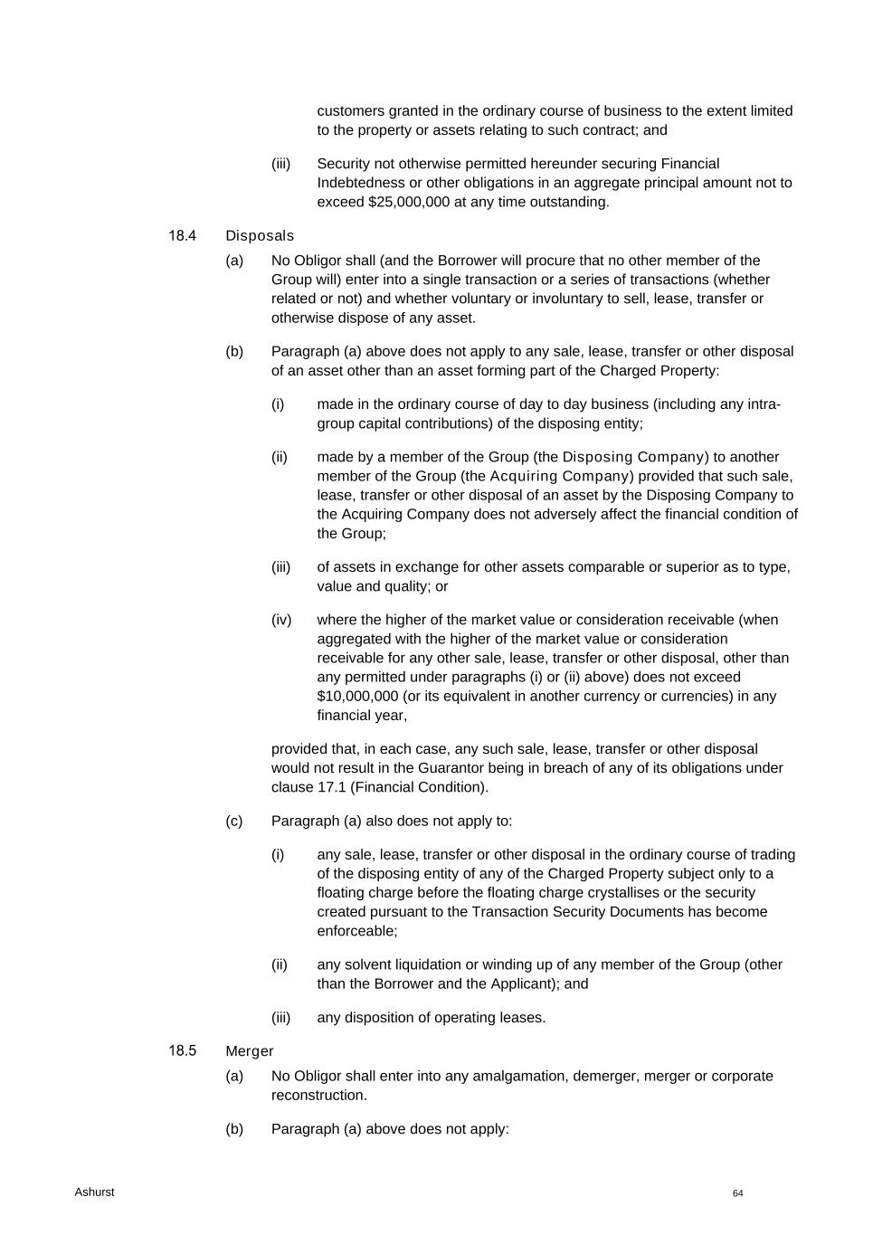 Ashurst 64 customers granted in the ordinary course of business to the extent limited to the property or assets relating to such contract; and (iii) Security not otherwise permitted hereunder securing Financial Indebtedness or other obligations in an aggregate principal amount not to exceed $25,000,000 at any time outstanding. Disposals (a) No Obligor shall (and the Borrower will procure that no other member of the Group will) enter into a single transaction or a series of transactions (whether related or not) and whether voluntary or involuntary to sell, lease, transfer or otherwise dispose of any asset. (b) Paragraph (a) above does not apply to any sale, lease, transfer or other disposal of an asset other than an asset forming part of the Charged Property: (i) made in the ordinary course of day to day business (including any intra- group capital contributions) of the disposing entity; (ii) made by a member of the Group (the Disposing Company) to another member of the Group (the Acquiring Company) provided that such sale, lease, transfer or other disposal of an asset by the Disposing Company to the Acquiring Company does not adversely affect the financial condition of the Group; (iii) of assets in exchange for other assets comparable or superior as to type, value and quality; or (iv) where the higher of the market value or consideration receivable (when aggregated with the higher of the market value or consideration receivable for any other sale, lease, transfer or other disposal, other than any permitted under paragraphs (i) or (ii) above) does not exceed $10,000,000 (or its equivalent in another currency or currencies) in any financial year, provided that, in each case, any such sale, lease, transfer or other disposal would not result in the Guarantor being in breach of any of its obligations under clause 17.1 (Financial Condition). (c) Paragraph (a) also does not apply to: (i) any sale, lease, transfer or other disposal in the ordinary course of trading of the disposing entity of any of the Charged Property subject only to a floating charge before the floating charge crystallises or the security created pursuant to the Transaction Security Documents has become enforceable; (ii) any solvent liquidation or winding up of any member of the Group (other than the Borrower and the Applicant); and (iii) any disposition of operating leases. Merger (a) No Obligor shall enter into any amalgamation, demerger, merger or corporate reconstruction. (b) Paragraph (a) above does not apply: