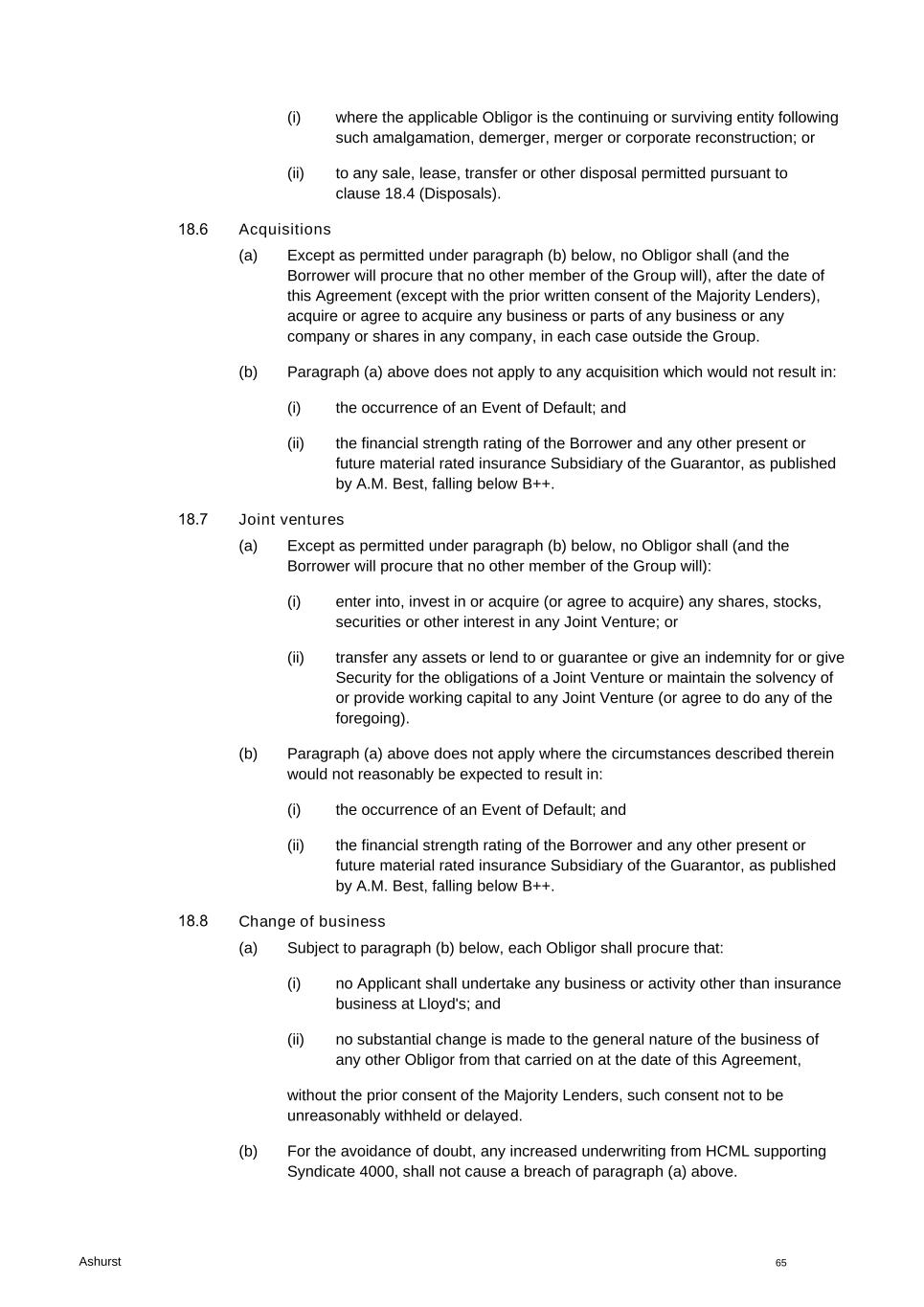 Ashurst 65 (i) where the applicable Obligor is the continuing or surviving entity following such amalgamation, demerger, merger or corporate reconstruction; or (ii) to any sale, lease, transfer or other disposal permitted pursuant to clause 18.4 (Disposals). Acquisitions (a) Except as permitted under paragraph (b) below, no Obligor shall (and the Borrower will procure that no other member of the Group will), after the date of this Agreement (except with the prior written consent of the Majority Lenders), acquire or agree to acquire any business or parts of any business or any company or shares in any company, in each case outside the Group. (b) Paragraph (a) above does not apply to any acquisition which would not result in: (i) the occurrence of an Event of Default; and (ii) the financial strength rating of the Borrower and any other present or future material rated insurance Subsidiary of the Guarantor, as published by A.M. Best, falling below B++. Joint ventures (a) Except as permitted under paragraph (b) below, no Obligor shall (and the Borrower will procure that no other member of the Group will): (i) enter into, invest in or acquire (or agree to acquire) any shares, stocks, securities or other interest in any Joint Venture; or (ii) transfer any assets or lend to or guarantee or give an indemnity for or give Security for the obligations of a Joint Venture or maintain the solvency of or provide working capital to any Joint Venture (or agree to do any of the foregoing). (b) Paragraph (a) above does not apply where the circumstances described therein would not reasonably be expected to result in: (i) the occurrence of an Event of Default; and (ii) the financial strength rating of the Borrower and any other present or future material rated insurance Subsidiary of the Guarantor, as published by A.M. Best, falling below B++. Change of business (a) Subject to paragraph (b) below, each Obligor shall procure that: (i) no Applicant shall undertake any business or activity other than insurance business at Lloyd's; and (ii) no substantial change is made to the general nature of the business of any other Obligor from that carried on at the date of this Agreement, without the prior consent of the Majority Lenders, such consent not to be unreasonably withheld or delayed. (b) For the avoidance of doubt, any increased underwriting from HCML supporting Syndicate 4000, shall not cause a breach of paragraph (a) above.