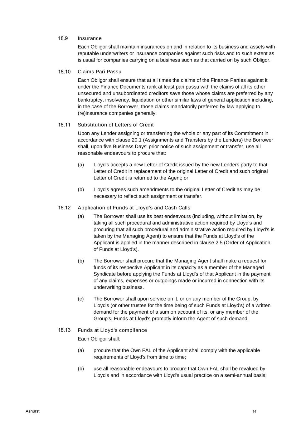 Ashurst 66 Insurance Each Obligor shall maintain insurances on and in relation to its business and assets with reputable underwriters or insurance companies against such risks and to such extent as is usual for companies carrying on a business such as that carried on by such Obligor. Claims Pari Passu Each Obligor shall ensure that at all times the claims of the Finance Parties against it under the Finance Documents rank at least pari passu with the claims of all its other unsecured and unsubordinated creditors save those whose claims are preferred by any bankruptcy, insolvency, liquidation or other similar laws of general application including, in the case of the Borrower, those claims mandatorily preferred by law applying to (re)insurance companies generally. Substitution of Letters of Credit Upon any Lender assigning or transferring the whole or any part of its Commitment in accordance with clause 20.1 (Assignments and Transfers by the Lenders) the Borrower shall, upon five Business Days' prior notice of such assignment or transfer, use all reasonable endeavours to procure that: (a) Lloyd's accepts a new Letter of Credit issued by the new Lenders party to that Letter of Credit in replacement of the original Letter of Credit and such original Letter of Credit is returned to the Agent; or (b) Lloyd's agrees such amendments to the original Letter of Credit as may be necessary to reflect such assignment or transfer. Application of Funds at Lloyd's and Cash Calls (a) The Borrower shall use its best endeavours (including, without limitation, by taking all such procedural and administrative action required by Lloyd's and procuring that all such procedural and administrative action required by Lloyd's is taken by the Managing Agent) to ensure that the Funds at Lloyd's of the Applicant is applied in the manner described in clause 2.5 (Order of Application of Funds at Lloyd's). (b) The Borrower shall procure that the Managing Agent shall make a request for funds of its respective Applicant in its capacity as a member of the Managed Syndicate before applying the Funds at Lloyd's of that Applicant in the payment of any claims, expenses or outgoings made or incurred in connection with its underwriting business. (c) The Borrower shall upon service on it, or on any member of the Group, by Lloyd's (or other trustee for the time being of such Funds at Lloyd's) of a written demand for the payment of a sum on account of its, or any member of the Group's, Funds at Lloyd's promptly inform the Agent of such demand. Funds at Lloyd's compliance Each Obligor shall: (a) procure that the Own FAL of the Applicant shall comply with the applicable requirements of Lloyd's from time to time; (b) use all reasonable endeavours to procure that Own FAL shall be revalued by Lloyd's and in accordance with Lloyd's usual practice on a semi-annual basis;