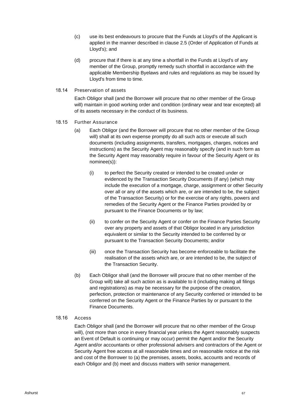 Ashurst 67 (c) use its best endeavours to procure that the Funds at Lloyd's of the Applicant is applied in the manner described in clause 2.5 (Order of Application of Funds at Lloyd's); and (d) procure that if there is at any time a shortfall in the Funds at Lloyd's of any member of the Group, promptly remedy such shortfall in accordance with the applicable Membership Byelaws and rules and regulations as may be issued by Lloyd's from time to time. Preservation of assets Each Obligor shall (and the Borrower will procure that no other member of the Group will) maintain in good working order and condition (ordinary wear and tear excepted) all of its assets necessary in the conduct of its business. Further Assurance (a) Each Obligor (and the Borrower will procure that no other member of the Group will) shall at its own expense promptly do all such acts or execute all such documents (including assignments, transfers, mortgages, charges, notices and instructions) as the Security Agent may reasonably specify (and in such form as the Security Agent may reasonably require in favour of the Security Agent or its nominee(s)): (i) to perfect the Security created or intended to be created under or evidenced by the Transaction Security Documents (if any) (which may include the execution of a mortgage, charge, assignment or other Security over all or any of the assets which are, or are intended to be, the subject of the Transaction Security) or for the exercise of any rights, powers and remedies of the Security Agent or the Finance Parties provided by or pursuant to the Finance Documents or by law; (ii) to confer on the Security Agent or confer on the Finance Parties Security over any property and assets of that Obligor located in any jurisdiction equivalent or similar to the Security intended to be conferred by or pursuant to the Transaction Security Documents; and/or (iii) once the Transaction Security has become enforceable to facilitate the realisation of the assets which are, or are intended to be, the subject of the Transaction Security. (b) Each Obligor shall (and the Borrower will procure that no other member of the Group will) take all such action as is available to it (including making all filings and registrations) as may be necessary for the purpose of the creation, perfection, protection or maintenance of any Security conferred or intended to be conferred on the Security Agent or the Finance Parties by or pursuant to the Finance Documents. Access Each Obligor shall (and the Borrower will procure that no other member of the Group will), (not more than once in every financial year unless the Agent reasonably suspects an Event of Default is continuing or may occur) permit the Agent and/or the Security Agent and/or accountants or other professional advisers and contractors of the Agent or Security Agent free access at all reasonable times and on reasonable notice at the risk and cost of the Borrower to (a) the premises, assets, books, accounts and records of each Obligor and (b) meet and discuss matters with senior management.