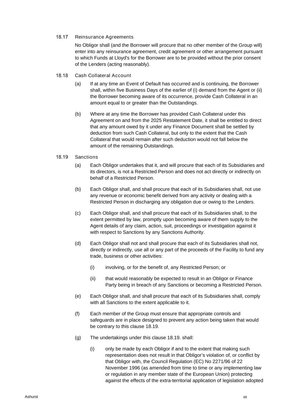 Ashurst 68 Reinsurance Agreements No Obligor shall (and the Borrower will procure that no other member of the Group will) enter into any reinsurance agreement, credit agreement or other arrangement pursuant to which Funds at Lloyd's for the Borrower are to be provided without the prior consent of the Lenders (acting reasonably). Cash Collateral Account (a) If at any time an Event of Default has occurred and is continuing, the Borrower shall, within five Business Days of the earlier of (i) demand from the Agent or (ii) the Borrower becoming aware of its occurrence, provide Cash Collateral in an amount equal to or greater than the Outstandings. (b) Where at any time the Borrower has provided Cash Collateral under this Agreement on and from the 2025 Restatement Date, it shall be entitled to direct that any amount owed by it under any Finance Document shall be settled by deduction from such Cash Collateral, but only to the extent that the Cash Collateral that would remain after such deduction would not fall below the amount of the remaining Outstandings. Sanctions (a) Each Obligor undertakes that it, and will procure that each of its Subsidiaries and its directors, is not a Restricted Person and does not act directly or indirectly on behalf of a Restricted Person. (b) Each Obligor shall, and shall procure that each of its Subsidiaries shall, not use any revenue or economic benefit derived from any activity or dealing with a Restricted Person in discharging any obligation due or owing to the Lenders. (c) Each Obligor shall, and shall procure that each of its Subsidiaries shall, to the extent permitted by law, promptly upon becoming aware of them supply to the Agent details of any claim, action, suit, proceedings or investigation against it with respect to Sanctions by any Sanctions Authority. (d) Each Obligor shall not and shall procure that each of its Subsidiaries shall not, directly or indirectly, use all or any part of the proceeds of the Facility to fund any trade, business or other activities: (i) involving, or for the benefit of, any Restricted Person; or (ii) that would reasonably be expected to result in an Obligor or Finance Party being in breach of any Sanctions or becoming a Restricted Person. (e) Each Obligor shall, and shall procure that each of its Subsidiaries shall, comply with all Sanctions to the extent applicable to it. (f) Each member of the Group must ensure that appropriate controls and safeguards are in place designed to prevent any action being taken that would be contrary to this clause 18.19. (g) The undertakings under this clause 18.19. shall: (i) only be made by each Obligor if and to the extent that making such representation does not result in that Obligor’s violation of, or conflict by that Obligor with, the Council Regulation (EC) No 2271/96 of 22 November 1996 (as amended from time to time or any implementing law or regulation in any member state of the European Union) protecting against the effects of the extra-territorial application of legislation adopted