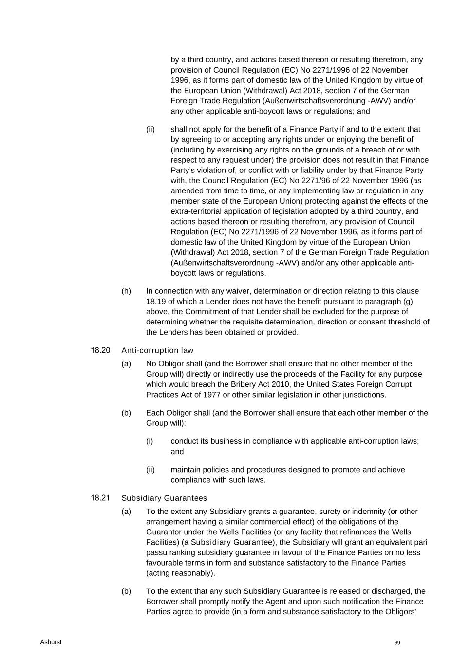 Ashurst 69 by a third country, and actions based thereon or resulting therefrom, any provision of Council Regulation (EC) No 2271/1996 of 22 November 1996, as it forms part of domestic law of the United Kingdom by virtue of the European Union (Withdrawal) Act 2018, section 7 of the German Foreign Trade Regulation (Außenwirtschaftsverordnung -AWV) and/or any other applicable anti-boycott laws or regulations; and (ii) shall not apply for the benefit of a Finance Party if and to the extent that by agreeing to or accepting any rights under or enjoying the benefit of (including by exercising any rights on the grounds of a breach of or with respect to any request under) the provision does not result in that Finance Party’s violation of, or conflict with or liability under by that Finance Party with, the Council Regulation (EC) No 2271/96 of 22 November 1996 (as amended from time to time, or any implementing law or regulation in any member state of the European Union) protecting against the effects of the extra-territorial application of legislation adopted by a third country, and actions based thereon or resulting therefrom, any provision of Council Regulation (EC) No 2271/1996 of 22 November 1996, as it forms part of domestic law of the United Kingdom by virtue of the European Union (Withdrawal) Act 2018, section 7 of the German Foreign Trade Regulation (Außenwirtschaftsverordnung -AWV) and/or any other applicable anti- boycott laws or regulations. (h) In connection with any waiver, determination or direction relating to this clause 18.19 of which a Lender does not have the benefit pursuant to paragraph (g) above, the Commitment of that Lender shall be excluded for the purpose of determining whether the requisite determination, direction or consent threshold of the Lenders has been obtained or provided. Anti-corruption law (a) No Obligor shall (and the Borrower shall ensure that no other member of the Group will) directly or indirectly use the proceeds of the Facility for any purpose which would breach the Bribery Act 2010, the United States Foreign Corrupt Practices Act of 1977 or other similar legislation in other jurisdictions. (b) Each Obligor shall (and the Borrower shall ensure that each other member of the Group will): (i) conduct its business in compliance with applicable anti-corruption laws; and (ii) maintain policies and procedures designed to promote and achieve compliance with such laws. Subsidiary Guarantees (a) To the extent any Subsidiary grants a guarantee, surety or indemnity (or other arrangement having a similar commercial effect) of the obligations of the Guarantor under the Wells Facilities (or any facility that refinances the Wells Facilities) (a Subsidiary Guarantee), the Subsidiary will grant an equivalent pari passu ranking subsidiary guarantee in favour of the Finance Parties on no less favourable terms in form and substance satisfactory to the Finance Parties (acting reasonably). (b) To the extent that any such Subsidiary Guarantee is released or discharged, the Borrower shall promptly notify the Agent and upon such notification the Finance Parties agree to provide (in a form and substance satisfactory to the Obligors'