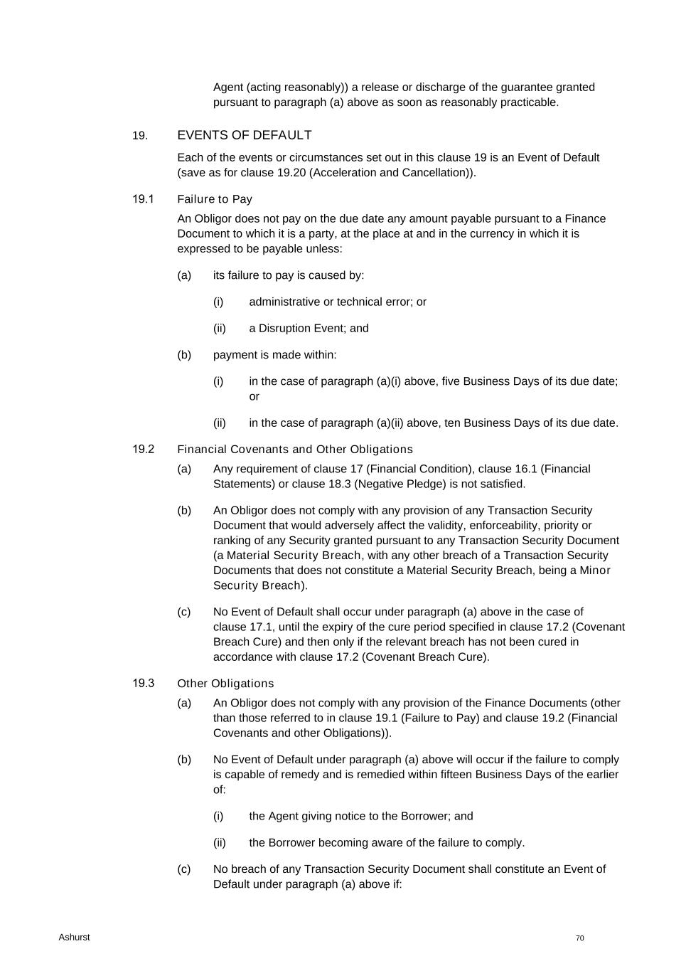 Ashurst 70 Agent (acting reasonably)) a release or discharge of the guarantee granted pursuant to paragraph (a) above as soon as reasonably practicable. 19. EVENTS OF DEFAULT Each of the events or circumstances set out in this clause 19 is an Event of Default (save as for clause 19.20 (Acceleration and Cancellation)). Failure to Pay An Obligor does not pay on the due date any amount payable pursuant to a Finance Document to which it is a party, at the place at and in the currency in which it is expressed to be payable unless: (a) its failure to pay is caused by: (i) administrative or technical error; or (ii) a Disruption Event; and (b) payment is made within: (i) in the case of paragraph (a)(i) above, five Business Days of its due date; or (ii) in the case of paragraph (a)(ii) above, ten Business Days of its due date. Financial Covenants and Other Obligations (a) Any requirement of clause 17 (Financial Condition), clause 16.1 (Financial Statements) or clause 18.3 (Negative Pledge) is not satisfied. (b) An Obligor does not comply with any provision of any Transaction Security Document that would adversely affect the validity, enforceability, priority or ranking of any Security granted pursuant to any Transaction Security Document (a Material Security Breach, with any other breach of a Transaction Security Documents that does not constitute a Material Security Breach, being a Minor Security Breach). (c) No Event of Default shall occur under paragraph (a) above in the case of clause 17.1, until the expiry of the cure period specified in clause 17.2 (Covenant Breach Cure) and then only if the relevant breach has not been cured in accordance with clause 17.2 (Covenant Breach Cure). Other Obligations (a) An Obligor does not comply with any provision of the Finance Documents (other than those referred to in clause 19.1 (Failure to Pay) and clause 19.2 (Financial Covenants and other Obligations)). (b) No Event of Default under paragraph (a) above will occur if the failure to comply is capable of remedy and is remedied within fifteen Business Days of the earlier of: (i) the Agent giving notice to the Borrower; and (ii) the Borrower becoming aware of the failure to comply. (c) No breach of any Transaction Security Document shall constitute an Event of Default under paragraph (a) above if: