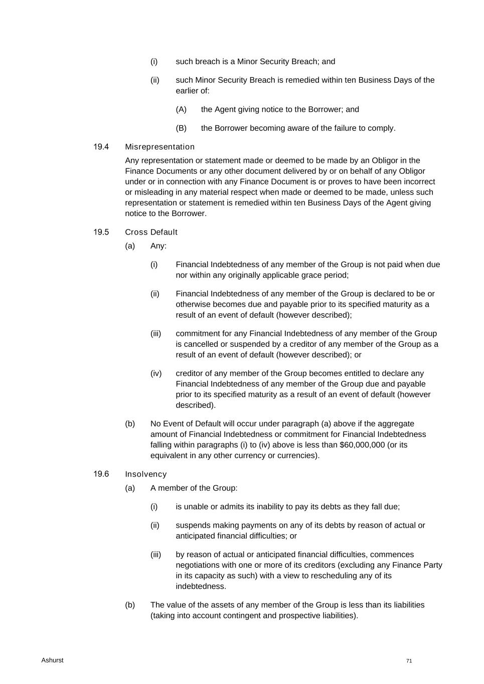 Ashurst 71 (i) such breach is a Minor Security Breach; and (ii) such Minor Security Breach is remedied within ten Business Days of the earlier of: (A) the Agent giving notice to the Borrower; and (B) the Borrower becoming aware of the failure to comply. Misrepresentation Any representation or statement made or deemed to be made by an Obligor in the Finance Documents or any other document delivered by or on behalf of any Obligor under or in connection with any Finance Document is or proves to have been incorrect or misleading in any material respect when made or deemed to be made, unless such representation or statement is remedied within ten Business Days of the Agent giving notice to the Borrower. Cross Default (a) Any: (i) Financial Indebtedness of any member of the Group is not paid when due nor within any originally applicable grace period; (ii) Financial Indebtedness of any member of the Group is declared to be or otherwise becomes due and payable prior to its specified maturity as a result of an event of default (however described); (iii) commitment for any Financial Indebtedness of any member of the Group is cancelled or suspended by a creditor of any member of the Group as a result of an event of default (however described); or (iv) creditor of any member of the Group becomes entitled to declare any Financial Indebtedness of any member of the Group due and payable prior to its specified maturity as a result of an event of default (however described). (b) No Event of Default will occur under paragraph (a) above if the aggregate amount of Financial Indebtedness or commitment for Financial Indebtedness falling within paragraphs (i) to (iv) above is less than $60,000,000 (or its equivalent in any other currency or currencies). Insolvency (a) A member of the Group: (i) is unable or admits its inability to pay its debts as they fall due; (ii) suspends making payments on any of its debts by reason of actual or anticipated financial difficulties; or (iii) by reason of actual or anticipated financial difficulties, commences negotiations with one or more of its creditors (excluding any Finance Party in its capacity as such) with a view to rescheduling any of its indebtedness. (b) The value of the assets of any member of the Group is less than its liabilities (taking into account contingent and prospective liabilities).