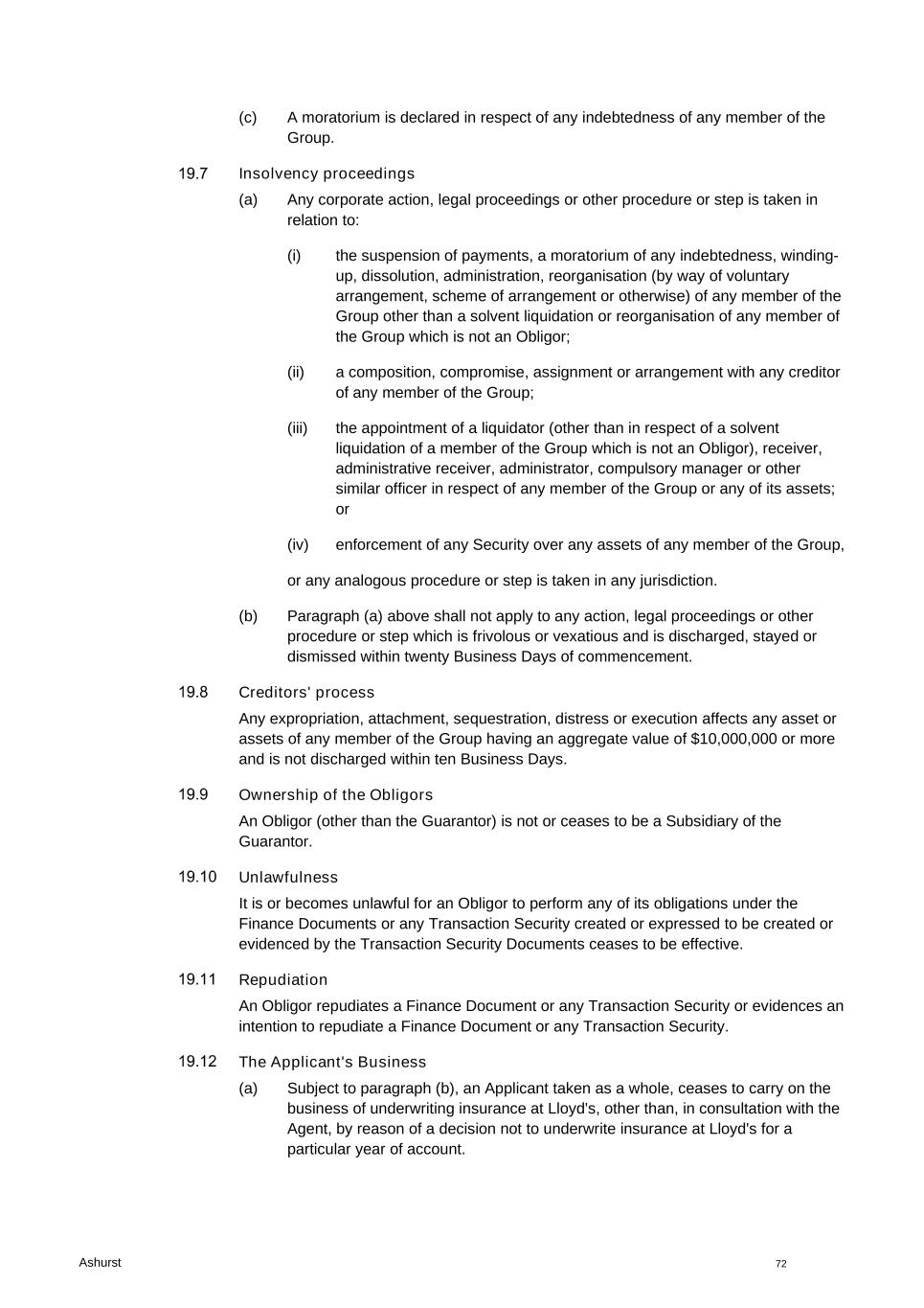Ashurst 72 (c) A moratorium is declared in respect of any indebtedness of any member of the Group. Insolvency proceedings (a) Any corporate action, legal proceedings or other procedure or step is taken in relation to: (i) the suspension of payments, a moratorium of any indebtedness, winding- up, dissolution, administration, reorganisation (by way of voluntary arrangement, scheme of arrangement or otherwise) of any member of the Group other than a solvent liquidation or reorganisation of any member of the Group which is not an Obligor; (ii) a composition, compromise, assignment or arrangement with any creditor of any member of the Group; (iii) the appointment of a liquidator (other than in respect of a solvent liquidation of a member of the Group which is not an Obligor), receiver, administrative receiver, administrator, compulsory manager or other similar officer in respect of any member of the Group or any of its assets; or (iv) enforcement of any Security over any assets of any member of the Group, or any analogous procedure or step is taken in any jurisdiction. (b) Paragraph (a) above shall not apply to any action, legal proceedings or other procedure or step which is frivolous or vexatious and is discharged, stayed or dismissed within twenty Business Days of commencement. Creditors' process Any expropriation, attachment, sequestration, distress or execution affects any asset or assets of any member of the Group having an aggregate value of $10,000,000 or more and is not discharged within ten Business Days. Ownership of the Obligors An Obligor (other than the Guarantor) is not or ceases to be a Subsidiary of the Guarantor. Unlawfulness It is or becomes unlawful for an Obligor to perform any of its obligations under the Finance Documents or any Transaction Security created or expressed to be created or evidenced by the Transaction Security Documents ceases to be effective. Repudiation An Obligor repudiates a Finance Document or any Transaction Security or evidences an intention to repudiate a Finance Document or any Transaction Security. The Applicant's Business (a) Subject to paragraph (b), an Applicant taken as a whole, ceases to carry on the business of underwriting insurance at Lloyd's, other than, in consultation with the Agent, by reason of a decision not to underwrite insurance at Lloyd's for a particular year of account.