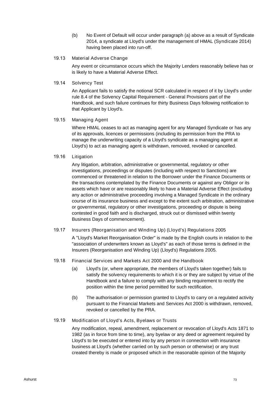 Ashurst 73 (b) No Event of Default will occur under paragraph (a) above as a result of Syndicate 2014, a syndicate at Lloyd's under the management of HMAL (Syndicate 2014) having been placed into run-off. Material Adverse Change Any event or circumstance occurs which the Majority Lenders reasonably believe has or is likely to have a Material Adverse Effect. Solvency Test An Applicant fails to satisfy the notional SCR calculated in respect of it by Lloyd's under rule 8.4 of the Solvency Capital Requirement - General Provisions part of the Handbook, and such failure continues for thirty Business Days following notification to that Applicant by Lloyd's. Managing Agent Where HMAL ceases to act as managing agent for any Managed Syndicate or has any of its approvals, licences or permissions (including its permission from the PRA to manage the underwriting capacity of a Lloyd's syndicate as a managing agent at Lloyd's) to act as managing agent is withdrawn, removed, revoked or cancelled. Litigation Any litigation, arbitration, administrative or governmental, regulatory or other investigations, proceedings or disputes (including with respect to Sanctions) are commenced or threatened in relation to the Borrower under the Finance Documents or the transactions contemplated by the Finance Documents or against any Obligor or its assets which have or are reasonably likely to have a Material Adverse Effect (excluding any action or administrative proceeding involving a Managed Syndicate in the ordinary course of its insurance business and except to the extent such arbitration, administrative or governmental, regulatory or other investigations, proceeding or dispute is being contested in good faith and is discharged, struck out or dismissed within twenty Business Days of commencement). Insurers (Reorganisation and Winding Up) (Lloyd's) Regulations 2005 A "Lloyd's Market Reorganisation Order" is made by the English courts in relation to the "association of underwriters known as Lloyd's" as each of those terms is defined in the Insurers (Reorganisation and Winding Up) (Lloyd's) Regulations 2005. Financial Services and Markets Act 2000 and the Handbook (a) Lloyd's (or, where appropriate, the members of Lloyd's taken together) fails to satisfy the solvency requirements to which it is or they are subject by virtue of the Handbook and a failure to comply with any binding requirement to rectify the position within the time period permitted for such rectification. (b) The authorisation or permission granted to Lloyd's to carry on a regulated activity pursuant to the Financial Markets and Services Act 2000 is withdrawn, removed, revoked or cancelled by the PRA. Modification of Lloyd's Acts, Byelaws or Trusts Any modification, repeal, amendment, replacement or revocation of Lloyd's Acts 1871 to 1982 (as in force from time to time), any byelaw or any deed or agreement required by Lloyd's to be executed or entered into by any person in connection with insurance business at Lloyd's (whether carried on by such person or otherwise) or any trust created thereby is made or proposed which in the reasonable opinion of the Majority