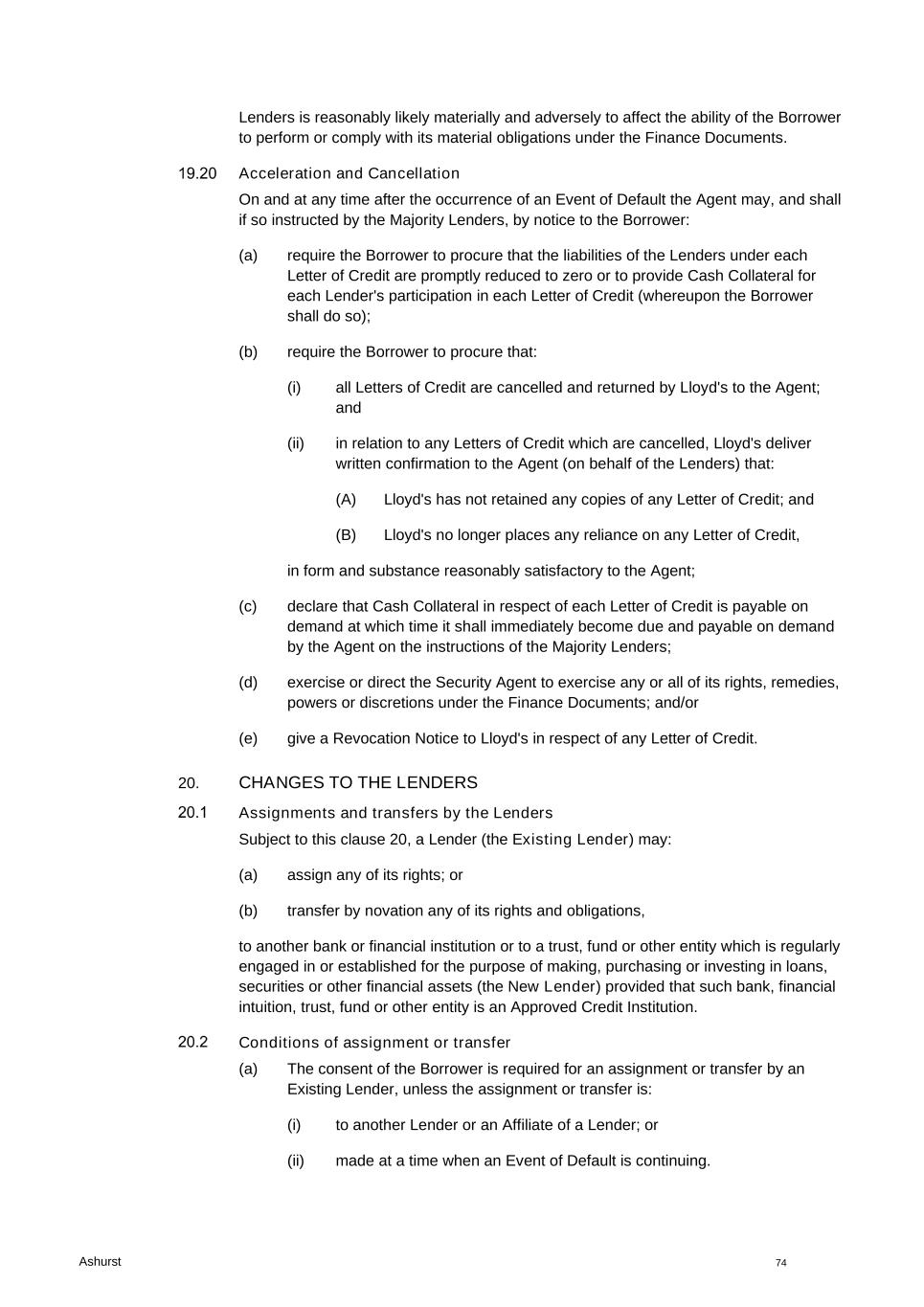Ashurst 74 Lenders is reasonably likely materially and adversely to affect the ability of the Borrower to perform or comply with its material obligations under the Finance Documents. Acceleration and Cancellation On and at any time after the occurrence of an Event of Default the Agent may, and shall if so instructed by the Majority Lenders, by notice to the Borrower: (a) require the Borrower to procure that the liabilities of the Lenders under each Letter of Credit are promptly reduced to zero or to provide Cash Collateral for each Lender's participation in each Letter of Credit (whereupon the Borrower shall do so); (b) require the Borrower to procure that: (i) all Letters of Credit are cancelled and returned by Lloyd's to the Agent; and (ii) in relation to any Letters of Credit which are cancelled, Lloyd's deliver written confirmation to the Agent (on behalf of the Lenders) that: (A) Lloyd's has not retained any copies of any Letter of Credit; and (B) Lloyd's no longer places any reliance on any Letter of Credit, in form and substance reasonably satisfactory to the Agent; (c) declare that Cash Collateral in respect of each Letter of Credit is payable on demand at which time it shall immediately become due and payable on demand by the Agent on the instructions of the Majority Lenders; (d) exercise or direct the Security Agent to exercise any or all of its rights, remedies, powers or discretions under the Finance Documents; and/or (e) give a Revocation Notice to Lloyd's in respect of any Letter of Credit. 20. CHANGES TO THE LENDERS Assignments and transfers by the Lenders Subject to this clause 20, a Lender (the Existing Lender) may: (a) assign any of its rights; or (b) transfer by novation any of its rights and obligations, to another bank or financial institution or to a trust, fund or other entity which is regularly engaged in or established for the purpose of making, purchasing or investing in loans, securities or other financial assets (the New Lender) provided that such bank, financial intuition, trust, fund or other entity is an Approved Credit Institution. Conditions of assignment or transfer (a) The consent of the Borrower is required for an assignment or transfer by an Existing Lender, unless the assignment or transfer is: (i) to another Lender or an Affiliate of a Lender; or (ii) made at a time when an Event of Default is continuing.