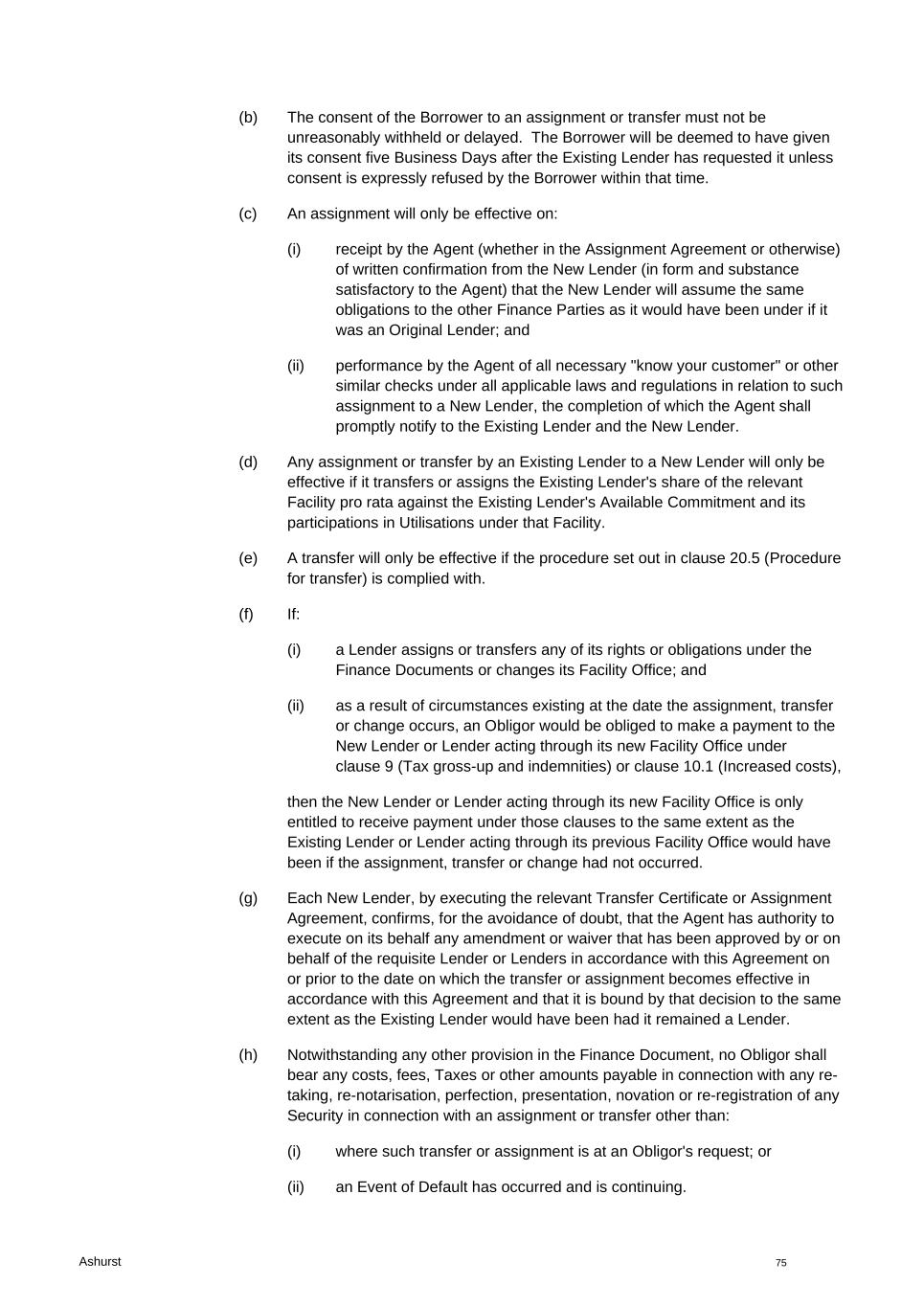 Ashurst 75 (b) The consent of the Borrower to an assignment or transfer must not be unreasonably withheld or delayed. The Borrower will be deemed to have given its consent five Business Days after the Existing Lender has requested it unless consent is expressly refused by the Borrower within that time. (c) An assignment will only be effective on: (i) receipt by the Agent (whether in the Assignment Agreement or otherwise) of written confirmation from the New Lender (in form and substance satisfactory to the Agent) that the New Lender will assume the same obligations to the other Finance Parties as it would have been under if it was an Original Lender; and (ii) performance by the Agent of all necessary "know your customer" or other similar checks under all applicable laws and regulations in relation to such assignment to a New Lender, the completion of which the Agent shall promptly notify to the Existing Lender and the New Lender. (d) Any assignment or transfer by an Existing Lender to a New Lender will only be effective if it transfers or assigns the Existing Lender's share of the relevant Facility pro rata against the Existing Lender's Available Commitment and its participations in Utilisations under that Facility. (e) A transfer will only be effective if the procedure set out in clause 20.5 (Procedure for transfer) is complied with. (f) If: (i) a Lender assigns or transfers any of its rights or obligations under the Finance Documents or changes its Facility Office; and (ii) as a result of circumstances existing at the date the assignment, transfer or change occurs, an Obligor would be obliged to make a payment to the New Lender or Lender acting through its new Facility Office under clause 9 (Tax gross-up and indemnities) or clause 10.1 (Increased costs), then the New Lender or Lender acting through its new Facility Office is only entitled to receive payment under those clauses to the same extent as the Existing Lender or Lender acting through its previous Facility Office would have been if the assignment, transfer or change had not occurred. (g) Each New Lender, by executing the relevant Transfer Certificate or Assignment Agreement, confirms, for the avoidance of doubt, that the Agent has authority to execute on its behalf any amendment or waiver that has been approved by or on behalf of the requisite Lender or Lenders in accordance with this Agreement on or prior to the date on which the transfer or assignment becomes effective in accordance with this Agreement and that it is bound by that decision to the same extent as the Existing Lender would have been had it remained a Lender. (h) Notwithstanding any other provision in the Finance Document, no Obligor shall bear any costs, fees, Taxes or other amounts payable in connection with any re- taking, re-notarisation, perfection, presentation, novation or re-registration of any Security in connection with an assignment or transfer other than: (i) where such transfer or assignment is at an Obligor's request; or (ii) an Event of Default has occurred and is continuing.
