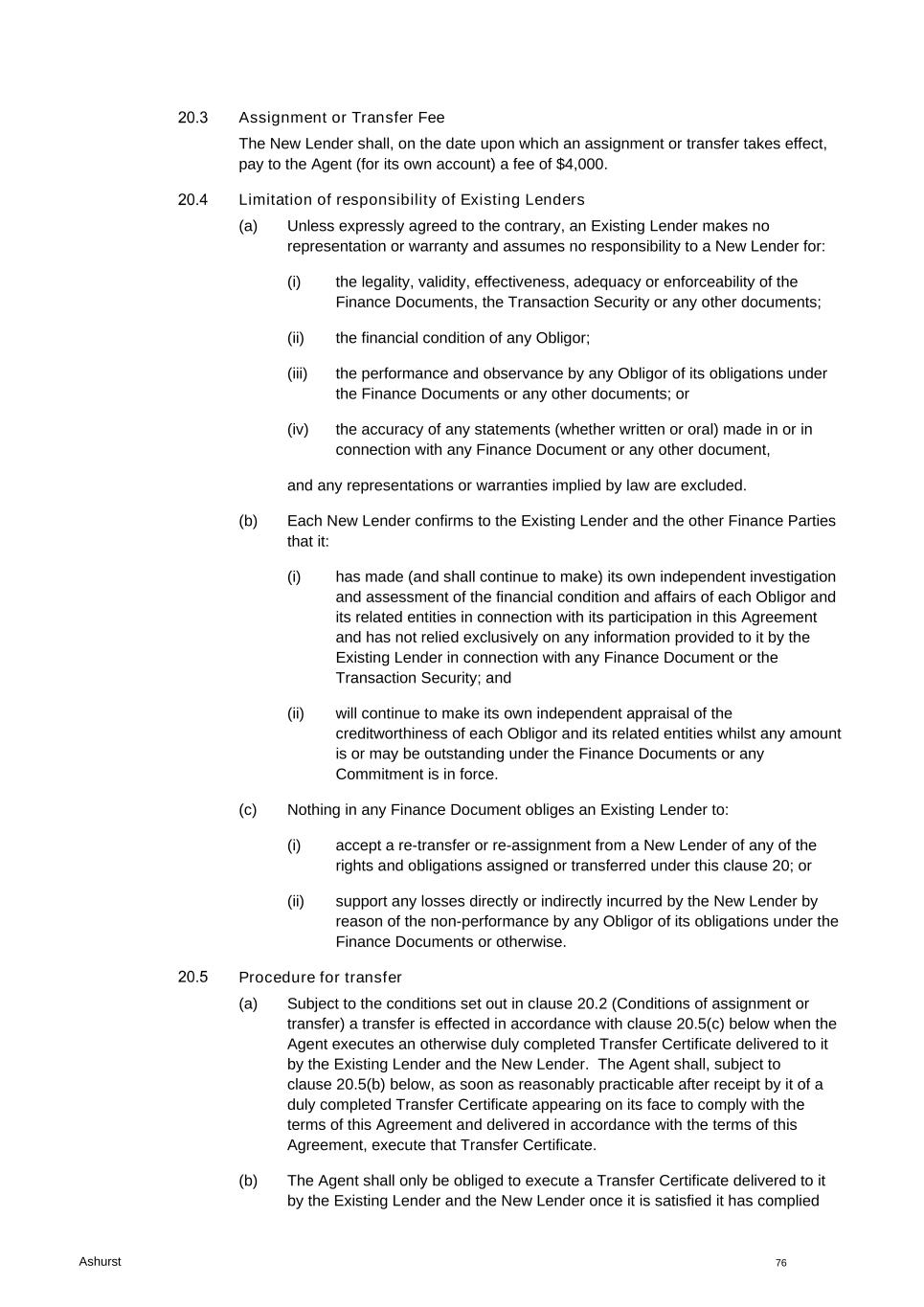 Ashurst 76 Assignment or Transfer Fee The New Lender shall, on the date upon which an assignment or transfer takes effect, pay to the Agent (for its own account) a fee of $4,000. Limitation of responsibility of Existing Lenders (a) Unless expressly agreed to the contrary, an Existing Lender makes no representation or warranty and assumes no responsibility to a New Lender for: (i) the legality, validity, effectiveness, adequacy or enforceability of the Finance Documents, the Transaction Security or any other documents; (ii) the financial condition of any Obligor; (iii) the performance and observance by any Obligor of its obligations under the Finance Documents or any other documents; or (iv) the accuracy of any statements (whether written or oral) made in or in connection with any Finance Document or any other document, and any representations or warranties implied by law are excluded. (b) Each New Lender confirms to the Existing Lender and the other Finance Parties that it: (i) has made (and shall continue to make) its own independent investigation and assessment of the financial condition and affairs of each Obligor and its related entities in connection with its participation in this Agreement and has not relied exclusively on any information provided to it by the Existing Lender in connection with any Finance Document or the Transaction Security; and (ii) will continue to make its own independent appraisal of the creditworthiness of each Obligor and its related entities whilst any amount is or may be outstanding under the Finance Documents or any Commitment is in force. (c) Nothing in any Finance Document obliges an Existing Lender to: (i) accept a re-transfer or re-assignment from a New Lender of any of the rights and obligations assigned or transferred under this clause 20; or (ii) support any losses directly or indirectly incurred by the New Lender by reason of the non-performance by any Obligor of its obligations under the Finance Documents or otherwise. Procedure for transfer (a) Subject to the conditions set out in clause 20.2 (Conditions of assignment or transfer) a transfer is effected in accordance with clause 20.5(c) below when the Agent executes an otherwise duly completed Transfer Certificate delivered to it by the Existing Lender and the New Lender. The Agent shall, subject to clause 20.5(b) below, as soon as reasonably practicable after receipt by it of a duly completed Transfer Certificate appearing on its face to comply with the terms of this Agreement and delivered in accordance with the terms of this Agreement, execute that Transfer Certificate. (b) The Agent shall only be obliged to execute a Transfer Certificate delivered to it by the Existing Lender and the New Lender once it is satisfied it has complied