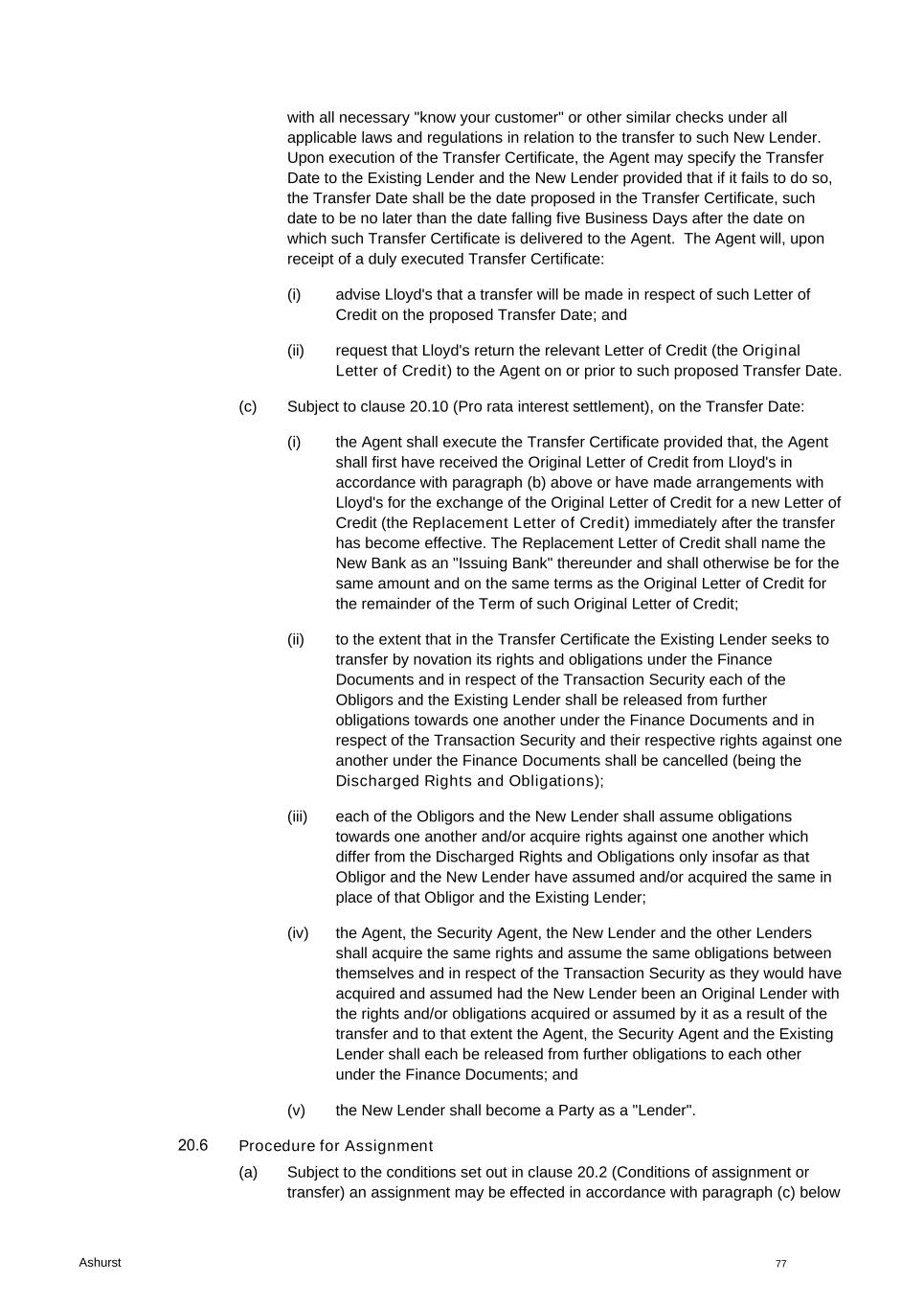 Ashurst 77 with all necessary "know your customer" or other similar checks under all applicable laws and regulations in relation to the transfer to such New Lender. Upon execution of the Transfer Certificate, the Agent may specify the Transfer Date to the Existing Lender and the New Lender provided that if it fails to do so, the Transfer Date shall be the date proposed in the Transfer Certificate, such date to be no later than the date falling five Business Days after the date on which such Transfer Certificate is delivered to the Agent. The Agent will, upon receipt of a duly executed Transfer Certificate: (i) advise Lloyd's that a transfer will be made in respect of such Letter of Credit on the proposed Transfer Date; and (ii) request that Lloyd's return the relevant Letter of Credit (the Original Letter of Credit) to the Agent on or prior to such proposed Transfer Date. (c) Subject to clause 20.10 (Pro rata interest settlement), on the Transfer Date: (i) the Agent shall execute the Transfer Certificate provided that, the Agent shall first have received the Original Letter of Credit from Lloyd's in accordance with paragraph (b) above or have made arrangements with Lloyd's for the exchange of the Original Letter of Credit for a new Letter of Credit (the Replacement Letter of Credit) immediately after the transfer has become effective. The Replacement Letter of Credit shall name the New Bank as an "Issuing Bank" thereunder and shall otherwise be for the same amount and on the same terms as the Original Letter of Credit for the remainder of the Term of such Original Letter of Credit; (ii) to the extent that in the Transfer Certificate the Existing Lender seeks to transfer by novation its rights and obligations under the Finance Documents and in respect of the Transaction Security each of the Obligors and the Existing Lender shall be released from further obligations towards one another under the Finance Documents and in respect of the Transaction Security and their respective rights against one another under the Finance Documents shall be cancelled (being the Discharged Rights and Obligations); (iii) each of the Obligors and the New Lender shall assume obligations towards one another and/or acquire rights against one another which differ from the Discharged Rights and Obligations only insofar as that Obligor and the New Lender have assumed and/or acquired the same in place of that Obligor and the Existing Lender; (iv) the Agent, the Security Agent, the New Lender and the other Lenders shall acquire the same rights and assume the same obligations between themselves and in respect of the Transaction Security as they would have acquired and assumed had the New Lender been an Original Lender with the rights and/or obligations acquired or assumed by it as a result of the transfer and to that extent the Agent, the Security Agent and the Existing Lender shall each be released from further obligations to each other under the Finance Documents; and (v) the New Lender shall become a Party as a "Lender". Procedure for Assignment (a) Subject to the conditions set out in clause 20.2 (Conditions of assignment or transfer) an assignment may be effected in accordance with paragraph (c) below