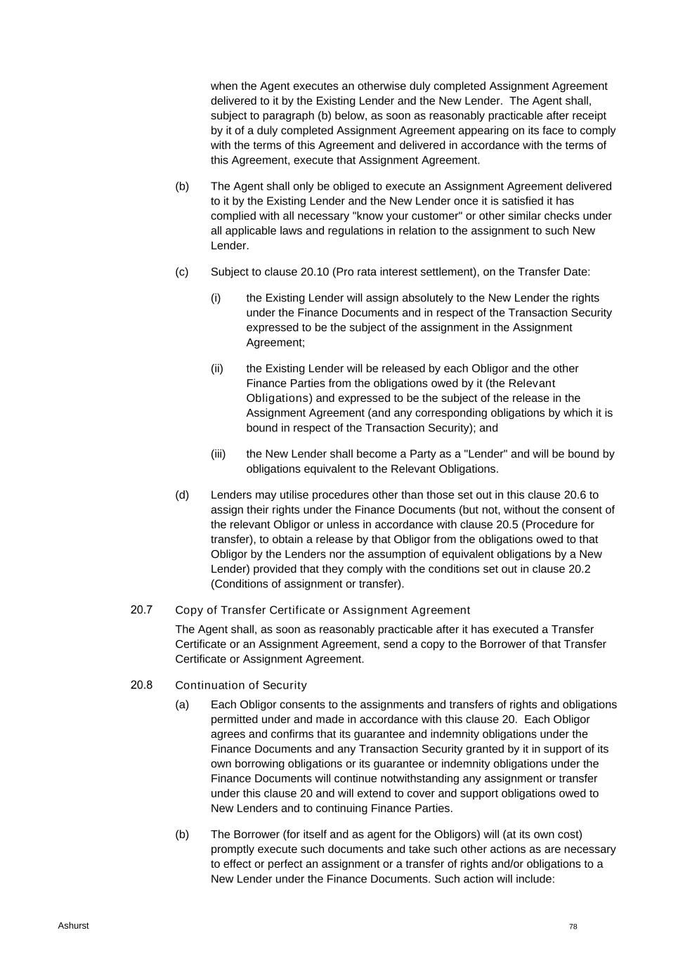 Ashurst 78 when the Agent executes an otherwise duly completed Assignment Agreement delivered to it by the Existing Lender and the New Lender. The Agent shall, subject to paragraph (b) below, as soon as reasonably practicable after receipt by it of a duly completed Assignment Agreement appearing on its face to comply with the terms of this Agreement and delivered in accordance with the terms of this Agreement, execute that Assignment Agreement. (b) The Agent shall only be obliged to execute an Assignment Agreement delivered to it by the Existing Lender and the New Lender once it is satisfied it has complied with all necessary "know your customer" or other similar checks under all applicable laws and regulations in relation to the assignment to such New Lender. (c) Subject to clause 20.10 (Pro rata interest settlement), on the Transfer Date: (i) the Existing Lender will assign absolutely to the New Lender the rights under the Finance Documents and in respect of the Transaction Security expressed to be the subject of the assignment in the Assignment Agreement; (ii) the Existing Lender will be released by each Obligor and the other Finance Parties from the obligations owed by it (the Relevant Obligations) and expressed to be the subject of the release in the Assignment Agreement (and any corresponding obligations by which it is bound in respect of the Transaction Security); and (iii) the New Lender shall become a Party as a "Lender" and will be bound by obligations equivalent to the Relevant Obligations. (d) Lenders may utilise procedures other than those set out in this clause 20.6 to assign their rights under the Finance Documents (but not, without the consent of the relevant Obligor or unless in accordance with clause 20.5 (Procedure for transfer), to obtain a release by that Obligor from the obligations owed to that Obligor by the Lenders nor the assumption of equivalent obligations by a New Lender) provided that they comply with the conditions set out in clause 20.2 (Conditions of assignment or transfer). Copy of Transfer Certificate or Assignment Agreement The Agent shall, as soon as reasonably practicable after it has executed a Transfer Certificate or an Assignment Agreement, send a copy to the Borrower of that Transfer Certificate or Assignment Agreement. Continuation of Security (a) Each Obligor consents to the assignments and transfers of rights and obligations permitted under and made in accordance with this clause 20. Each Obligor agrees and confirms that its guarantee and indemnity obligations under the Finance Documents and any Transaction Security granted by it in support of its own borrowing obligations or its guarantee or indemnity obligations under the Finance Documents will continue notwithstanding any assignment or transfer under this clause 20 and will extend to cover and support obligations owed to New Lenders and to continuing Finance Parties. (b) The Borrower (for itself and as agent for the Obligors) will (at its own cost) promptly execute such documents and take such other actions as are necessary to effect or perfect an assignment or a transfer of rights and/or obligations to a New Lender under the Finance Documents. Such action will include: