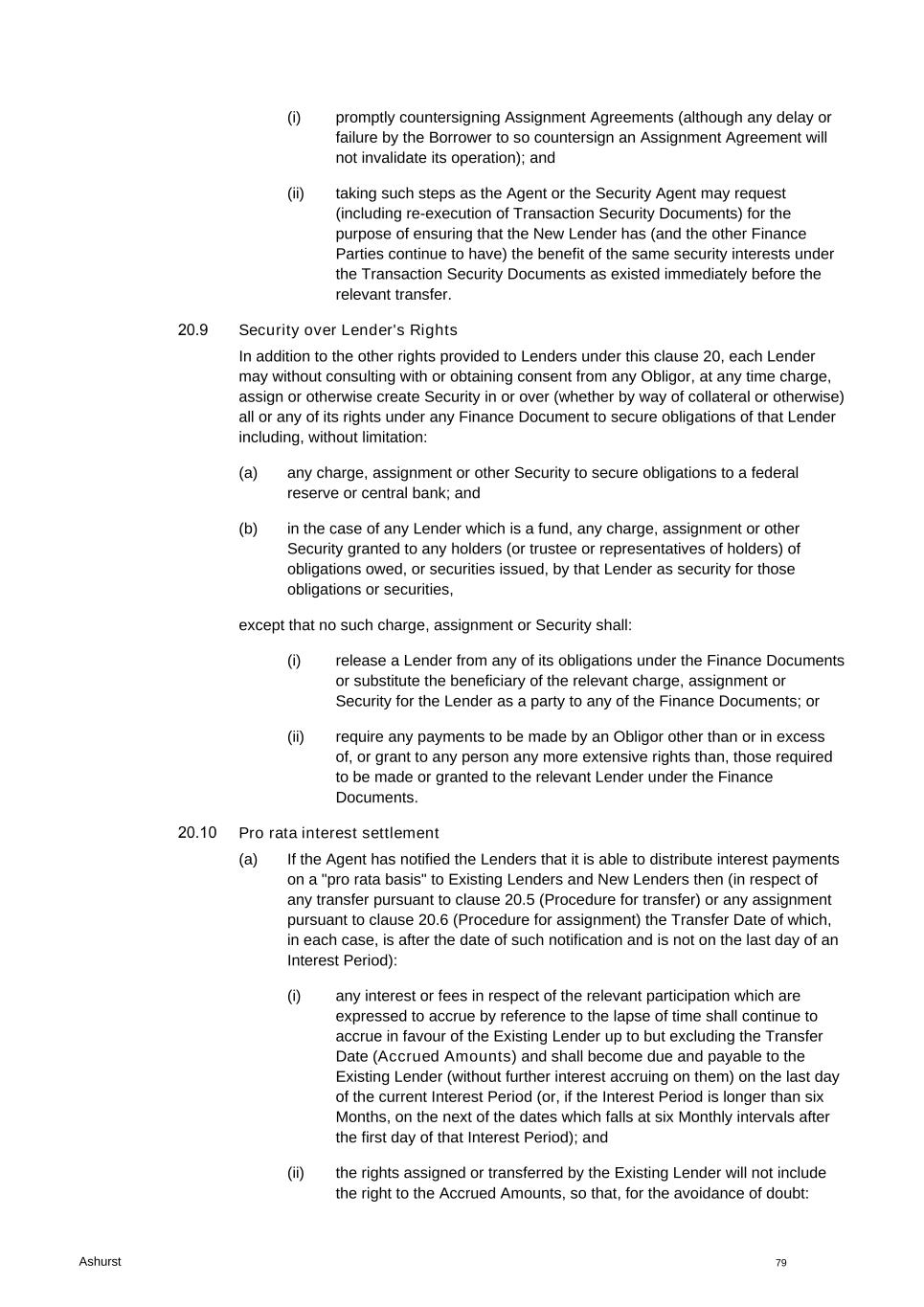 Ashurst 79 (i) promptly countersigning Assignment Agreements (although any delay or failure by the Borrower to so countersign an Assignment Agreement will not invalidate its operation); and (ii) taking such steps as the Agent or the Security Agent may request (including re-execution of Transaction Security Documents) for the purpose of ensuring that the New Lender has (and the other Finance Parties continue to have) the benefit of the same security interests under the Transaction Security Documents as existed immediately before the relevant transfer. Security over Lender's Rights In addition to the other rights provided to Lenders under this clause 20, each Lender may without consulting with or obtaining consent from any Obligor, at any time charge, assign or otherwise create Security in or over (whether by way of collateral or otherwise) all or any of its rights under any Finance Document to secure obligations of that Lender including, without limitation: (a) any charge, assignment or other Security to secure obligations to a federal reserve or central bank; and (b) in the case of any Lender which is a fund, any charge, assignment or other Security granted to any holders (or trustee or representatives of holders) of obligations owed, or securities issued, by that Lender as security for those obligations or securities, except that no such charge, assignment or Security shall: (i) release a Lender from any of its obligations under the Finance Documents or substitute the beneficiary of the relevant charge, assignment or Security for the Lender as a party to any of the Finance Documents; or (ii) require any payments to be made by an Obligor other than or in excess of, or grant to any person any more extensive rights than, those required to be made or granted to the relevant Lender under the Finance Documents. Pro rata interest settlement (a) If the Agent has notified the Lenders that it is able to distribute interest payments on a "pro rata basis" to Existing Lenders and New Lenders then (in respect of any transfer pursuant to clause 20.5 (Procedure for transfer) or any assignment pursuant to clause 20.6 (Procedure for assignment) the Transfer Date of which, in each case, is after the date of such notification and is not on the last day of an Interest Period): (i) any interest or fees in respect of the relevant participation which are expressed to accrue by reference to the lapse of time shall continue to accrue in favour of the Existing Lender up to but excluding the Transfer Date (Accrued Amounts) and shall become due and payable to the Existing Lender (without further interest accruing on them) on the last day of the current Interest Period (or, if the Interest Period is longer than six Months, on the next of the dates which falls at six Monthly intervals after the first day of that Interest Period); and (ii) the rights assigned or transferred by the Existing Lender will not include the right to the Accrued Amounts, so that, for the avoidance of doubt: