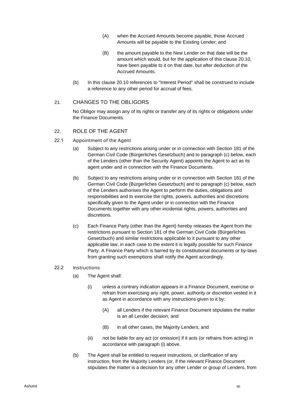Ashurst 80 (A) when the Accrued Amounts become payable, those Accrued Amounts will be payable to the Existing Lender; and (B) the amount payable to the New Lender on that date will be the amount which would, but for the application of this clause 20.10, have been payable to it on that date, but after deduction of the Accrued Amounts. (b) In this clause 20.10 references to "Interest Period" shall be construed to include a reference to any other period for accrual of fees. 21. CHANGES TO THE OBLIGORS No Obligor may assign any of its rights or transfer any of its rights or obligations under the Finance Documents. 22. ROLE OF THE AGENT Appointment of the Agent (a) Subject to any restrictions arising under or in connection with Section 181 of the German Civil Code (Bürgerliches Gesetzbuch) and to paragraph (c) below, each of the Lenders (other than the Security Agent) appoints the Agent to act as its agent under and in connection with the Finance Documents. (b) Subject to any restrictions arising under or in connection with Section 181 of the German Civil Code (Bürgerliches Gesetzbuch) and to paragraph (c) below, each of the Lenders authorises the Agent to perform the duties, obligations and responsibilities and to exercise the rights, powers, authorities and discretions specifically given to the Agent under or in connection with the Finance Documents together with any other incidental rights, powers, authorities and discretions. (c) Each Finance Party (other than the Agent) hereby releases the Agent from the restrictions pursuant to Section 181 of the German Civil Code (Bürgerliches Gesetzbuch) and similar restrictions applicable to it pursuant to any other applicable law, in each case to the extent it is legally possible for such Finance Party. A Finance Party which is barred by its constitutional documents or by-laws from granting such exemptions shall notify the Agent accordingly. Instructions (a) The Agent shall: (i) unless a contrary indication appears in a Finance Document, exercise or refrain from exercising any right, power, authority or discretion vested in it as Agent in accordance with any instructions given to it by: (A) all Lenders if the relevant Finance Document stipulates the matter is an all Lender decision; and (B) in all other cases, the Majority Lenders; and (ii) not be liable for any act (or omission) if it acts (or refrains from acting) in accordance with paragraph (i) above. (b) The Agent shall be entitled to request instructions, or clarification of any instruction, from the Majority Lenders (or, if the relevant Finance Document stipulates the matter is a decision for any other Lender or group of Lenders, from