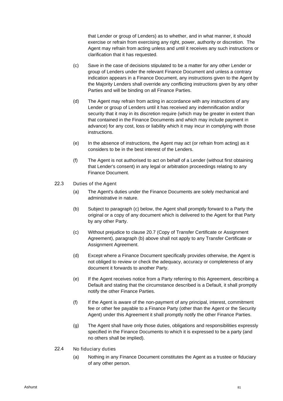 Ashurst 81 that Lender or group of Lenders) as to whether, and in what manner, it should exercise or refrain from exercising any right, power, authority or discretion. The Agent may refrain from acting unless and until it receives any such instructions or clarification that it has requested. (c) Save in the case of decisions stipulated to be a matter for any other Lender or group of Lenders under the relevant Finance Document and unless a contrary indication appears in a Finance Document, any instructions given to the Agent by the Majority Lenders shall override any conflicting instructions given by any other Parties and will be binding on all Finance Parties. (d) The Agent may refrain from acting in accordance with any instructions of any Lender or group of Lenders until it has received any indemnification and/or security that it may in its discretion require (which may be greater in extent than that contained in the Finance Documents and which may include payment in advance) for any cost, loss or liability which it may incur in complying with those instructions. (e) In the absence of instructions, the Agent may act (or refrain from acting) as it considers to be in the best interest of the Lenders. (f) The Agent is not authorised to act on behalf of a Lender (without first obtaining that Lender's consent) in any legal or arbitration proceedings relating to any Finance Document. Duties of the Agent (a) The Agent's duties under the Finance Documents are solely mechanical and administrative in nature. (b) Subject to paragraph (c) below, the Agent shall promptly forward to a Party the original or a copy of any document which is delivered to the Agent for that Party by any other Party. (c) Without prejudice to clause 20.7 (Copy of Transfer Certificate or Assignment Agreement), paragraph (b) above shall not apply to any Transfer Certificate or Assignment Agreement. (d) Except where a Finance Document specifically provides otherwise, the Agent is not obliged to review or check the adequacy, accuracy or completeness of any document it forwards to another Party. (e) If the Agent receives notice from a Party referring to this Agreement, describing a Default and stating that the circumstance described is a Default, it shall promptly notify the other Finance Parties. (f) If the Agent is aware of the non-payment of any principal, interest, commitment fee or other fee payable to a Finance Party (other than the Agent or the Security Agent) under this Agreement it shall promptly notify the other Finance Parties. (g) The Agent shall have only those duties, obligations and responsibilities expressly specified in the Finance Documents to which it is expressed to be a party (and no others shall be implied). No fiduciary duties (a) Nothing in any Finance Document constitutes the Agent as a trustee or fiduciary of any other person.