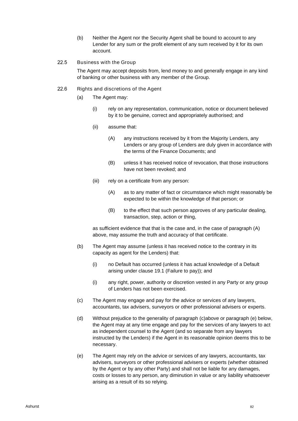 Ashurst 82 (b) Neither the Agent nor the Security Agent shall be bound to account to any Lender for any sum or the profit element of any sum received by it for its own account. Business with the Group The Agent may accept deposits from, lend money to and generally engage in any kind of banking or other business with any member of the Group. Rights and discretions of the Agent (a) The Agent may: (i) rely on any representation, communication, notice or document believed by it to be genuine, correct and appropriately authorised; and (ii) assume that: (A) any instructions received by it from the Majority Lenders, any Lenders or any group of Lenders are duly given in accordance with the terms of the Finance Documents; and (B) unless it has received notice of revocation, that those instructions have not been revoked; and (iii) rely on a certificate from any person: (A) as to any matter of fact or circumstance which might reasonably be expected to be within the knowledge of that person; or (B) to the effect that such person approves of any particular dealing, transaction, step, action or thing, as sufficient evidence that that is the case and, in the case of paragraph (A) above, may assume the truth and accuracy of that certificate. (b) The Agent may assume (unless it has received notice to the contrary in its capacity as agent for the Lenders) that: (i) no Default has occurred (unless it has actual knowledge of a Default arising under clause 19.1 (Failure to pay)); and (i) any right, power, authority or discretion vested in any Party or any group of Lenders has not been exercised. (c) The Agent may engage and pay for the advice or services of any lawyers, accountants, tax advisers, surveyors or other professional advisers or experts. (d) Without prejudice to the generality of paragraph (c)above or paragraph (e) below, the Agent may at any time engage and pay for the services of any lawyers to act as independent counsel to the Agent (and so separate from any lawyers instructed by the Lenders) if the Agent in its reasonable opinion deems this to be necessary. (e) The Agent may rely on the advice or services of any lawyers, accountants, tax advisers, surveyors or other professional advisers or experts (whether obtained by the Agent or by any other Party) and shall not be liable for any damages, costs or losses to any person, any diminution in value or any liability whatsoever arising as a result of its so relying.