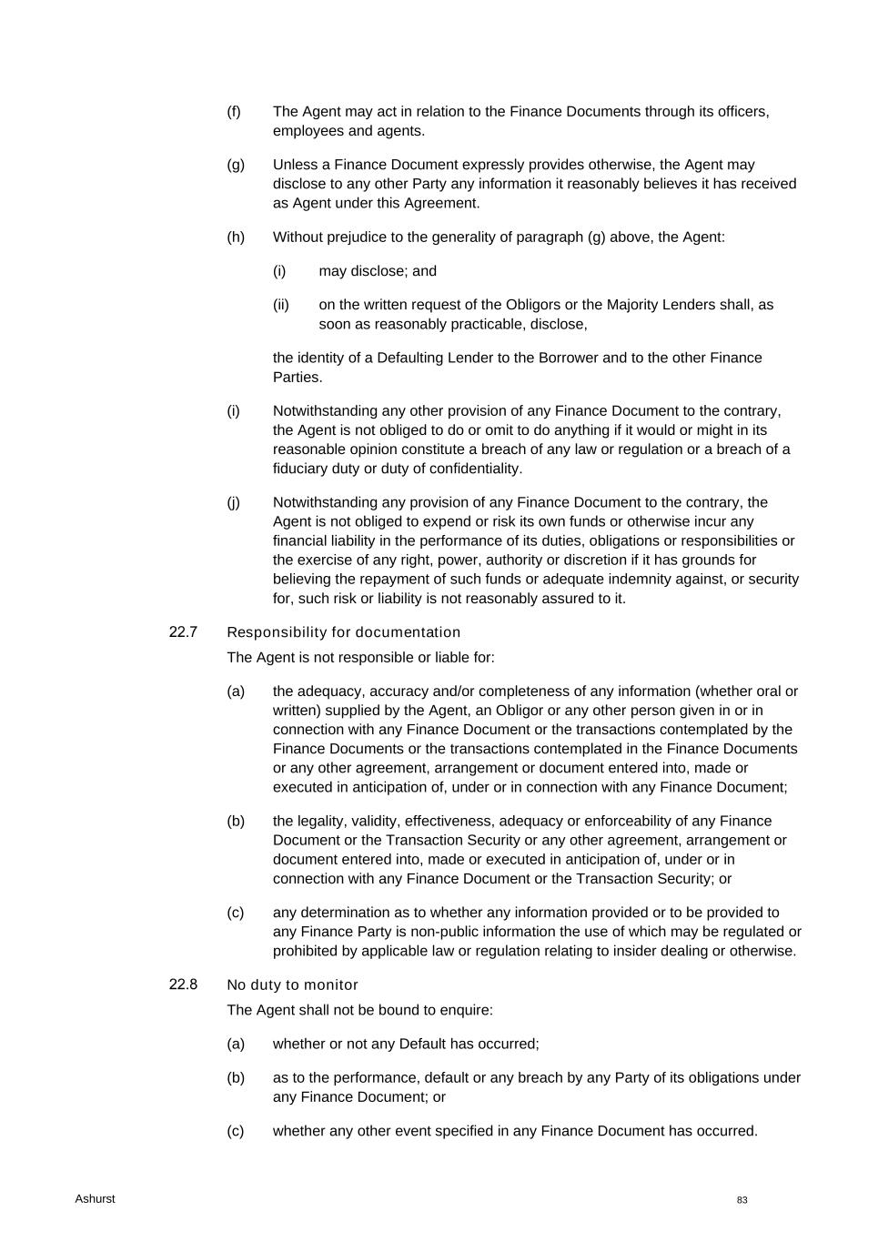 Ashurst 83 (f) The Agent may act in relation to the Finance Documents through its officers, employees and agents. (g) Unless a Finance Document expressly provides otherwise, the Agent may disclose to any other Party any information it reasonably believes it has received as Agent under this Agreement. (h) Without prejudice to the generality of paragraph (g) above, the Agent: (i) may disclose; and (ii) on the written request of the Obligors or the Majority Lenders shall, as soon as reasonably practicable, disclose, the identity of a Defaulting Lender to the Borrower and to the other Finance Parties. (i) Notwithstanding any other provision of any Finance Document to the contrary, the Agent is not obliged to do or omit to do anything if it would or might in its reasonable opinion constitute a breach of any law or regulation or a breach of a fiduciary duty or duty of confidentiality. (j) Notwithstanding any provision of any Finance Document to the contrary, the Agent is not obliged to expend or risk its own funds or otherwise incur any financial liability in the performance of its duties, obligations or responsibilities or the exercise of any right, power, authority or discretion if it has grounds for believing the repayment of such funds or adequate indemnity against, or security for, such risk or liability is not reasonably assured to it. Responsibility for documentation The Agent is not responsible or liable for: (a) the adequacy, accuracy and/or completeness of any information (whether oral or written) supplied by the Agent, an Obligor or any other person given in or in connection with any Finance Document or the transactions contemplated by the Finance Documents or the transactions contemplated in the Finance Documents or any other agreement, arrangement or document entered into, made or executed in anticipation of, under or in connection with any Finance Document; (b) the legality, validity, effectiveness, adequacy or enforceability of any Finance Document or the Transaction Security or any other agreement, arrangement or document entered into, made or executed in anticipation of, under or in connection with any Finance Document or the Transaction Security; or (c) any determination as to whether any information provided or to be provided to any Finance Party is non-public information the use of which may be regulated or prohibited by applicable law or regulation relating to insider dealing or otherwise. No duty to monitor The Agent shall not be bound to enquire: (a) whether or not any Default has occurred; (b) as to the performance, default or any breach by any Party of its obligations under any Finance Document; or (c) whether any other event specified in any Finance Document has occurred.