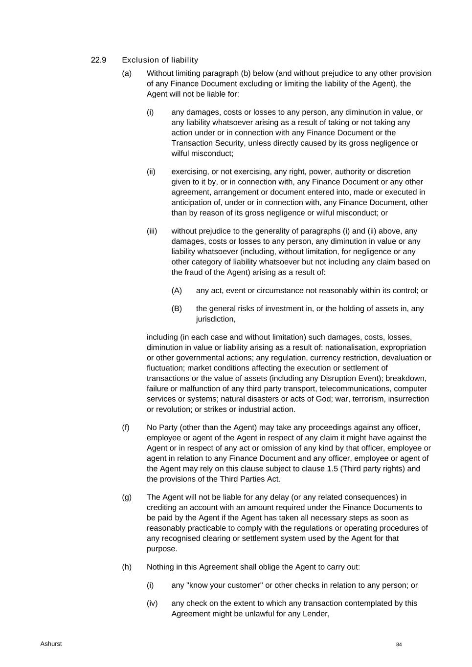 Ashurst 84 Exclusion of liability (a) Without limiting paragraph (b) below (and without prejudice to any other provision of any Finance Document excluding or limiting the liability of the Agent), the Agent will not be liable for: (i) any damages, costs or losses to any person, any diminution in value, or any liability whatsoever arising as a result of taking or not taking any action under or in connection with any Finance Document or the Transaction Security, unless directly caused by its gross negligence or wilful misconduct; (ii) exercising, or not exercising, any right, power, authority or discretion given to it by, or in connection with, any Finance Document or any other agreement, arrangement or document entered into, made or executed in anticipation of, under or in connection with, any Finance Document, other than by reason of its gross negligence or wilful misconduct; or (iii) without prejudice to the generality of paragraphs (i) and (ii) above, any damages, costs or losses to any person, any diminution in value or any liability whatsoever (including, without limitation, for negligence or any other category of liability whatsoever but not including any claim based on the fraud of the Agent) arising as a result of: (A) any act, event or circumstance not reasonably within its control; or (B) the general risks of investment in, or the holding of assets in, any jurisdiction, including (in each case and without limitation) such damages, costs, losses, diminution in value or liability arising as a result of: nationalisation, expropriation or other governmental actions; any regulation, currency restriction, devaluation or fluctuation; market conditions affecting the execution or settlement of transactions or the value of assets (including any Disruption Event); breakdown, failure or malfunction of any third party transport, telecommunications, computer services or systems; natural disasters or acts of God; war, terrorism, insurrection or revolution; or strikes or industrial action. (f) No Party (other than the Agent) may take any proceedings against any officer, employee or agent of the Agent in respect of any claim it might have against the Agent or in respect of any act or omission of any kind by that officer, employee or agent in relation to any Finance Document and any officer, employee or agent of the Agent may rely on this clause subject to clause 1.5 (Third party rights) and the provisions of the Third Parties Act. (g) The Agent will not be liable for any delay (or any related consequences) in crediting an account with an amount required under the Finance Documents to be paid by the Agent if the Agent has taken all necessary steps as soon as reasonably practicable to comply with the regulations or operating procedures of any recognised clearing or settlement system used by the Agent for that purpose. (h) Nothing in this Agreement shall oblige the Agent to carry out: (i) any "know your customer" or other checks in relation to any person; or (iv) any check on the extent to which any transaction contemplated by this Agreement might be unlawful for any Lender,