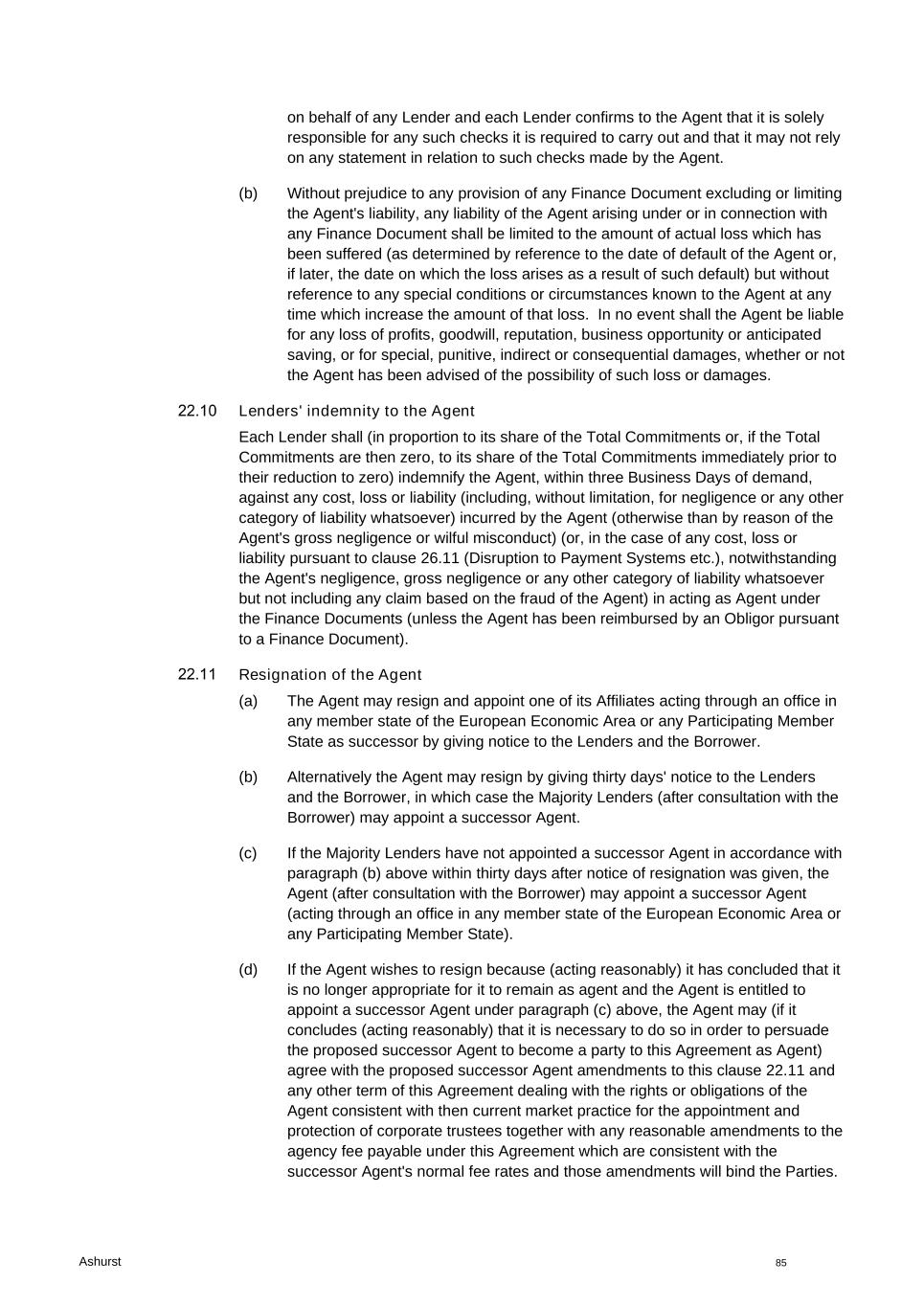 Ashurst 85 on behalf of any Lender and each Lender confirms to the Agent that it is solely responsible for any such checks it is required to carry out and that it may not rely on any statement in relation to such checks made by the Agent. (b) Without prejudice to any provision of any Finance Document excluding or limiting the Agent's liability, any liability of the Agent arising under or in connection with any Finance Document shall be limited to the amount of actual loss which has been suffered (as determined by reference to the date of default of the Agent or, if later, the date on which the loss arises as a result of such default) but without reference to any special conditions or circumstances known to the Agent at any time which increase the amount of that loss. In no event shall the Agent be liable for any loss of profits, goodwill, reputation, business opportunity or anticipated saving, or for special, punitive, indirect or consequential damages, whether or not the Agent has been advised of the possibility of such loss or damages. Lenders' indemnity to the Agent Each Lender shall (in proportion to its share of the Total Commitments or, if the Total Commitments are then zero, to its share of the Total Commitments immediately prior to their reduction to zero) indemnify the Agent, within three Business Days of demand, against any cost, loss or liability (including, without limitation, for negligence or any other category of liability whatsoever) incurred by the Agent (otherwise than by reason of the Agent's gross negligence or wilful misconduct) (or, in the case of any cost, loss or liability pursuant to clause 26.11 (Disruption to Payment Systems etc.), notwithstanding the Agent's negligence, gross negligence or any other category of liability whatsoever but not including any claim based on the fraud of the Agent) in acting as Agent under the Finance Documents (unless the Agent has been reimbursed by an Obligor pursuant to a Finance Document). Resignation of the Agent (a) The Agent may resign and appoint one of its Affiliates acting through an office in any member state of the European Economic Area or any Participating Member State as successor by giving notice to the Lenders and the Borrower. (b) Alternatively the Agent may resign by giving thirty days' notice to the Lenders and the Borrower, in which case the Majority Lenders (after consultation with the Borrower) may appoint a successor Agent. (c) If the Majority Lenders have not appointed a successor Agent in accordance with paragraph (b) above within thirty days after notice of resignation was given, the Agent (after consultation with the Borrower) may appoint a successor Agent (acting through an office in any member state of the European Economic Area or any Participating Member State). (d) If the Agent wishes to resign because (acting reasonably) it has concluded that it is no longer appropriate for it to remain as agent and the Agent is entitled to appoint a successor Agent under paragraph (c) above, the Agent may (if it concludes (acting reasonably) that it is necessary to do so in order to persuade the proposed successor Agent to become a party to this Agreement as Agent) agree with the proposed successor Agent amendments to this clause 22.11 and any other term of this Agreement dealing with the rights or obligations of the Agent consistent with then current market practice for the appointment and protection of corporate trustees together with any reasonable amendments to the agency fee payable under this Agreement which are consistent with the successor Agent's normal fee rates and those amendments will bind the Parties.