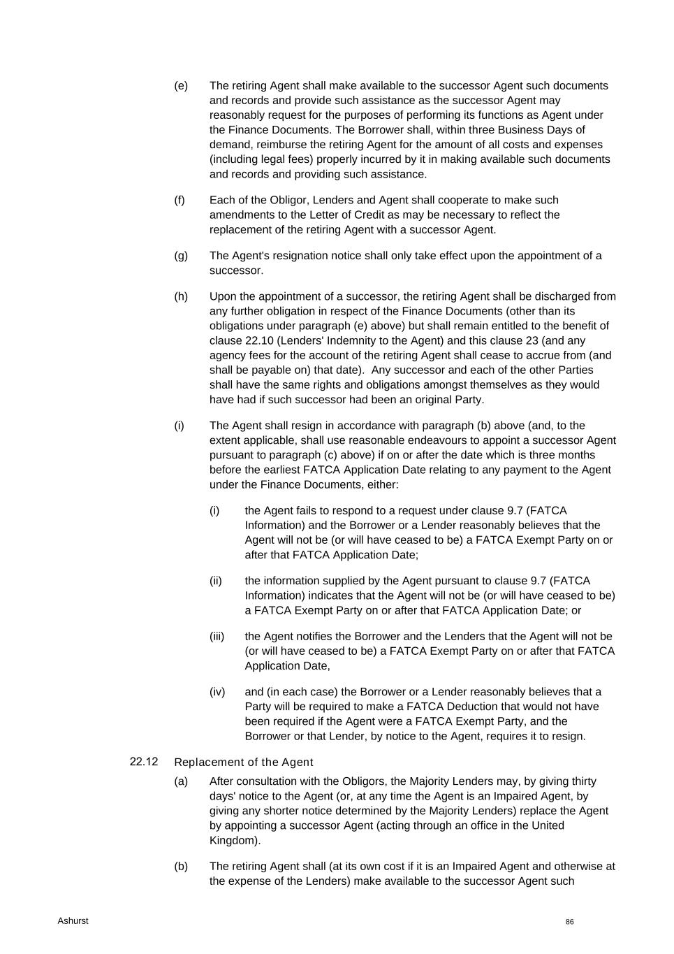 Ashurst 86 (e) The retiring Agent shall make available to the successor Agent such documents and records and provide such assistance as the successor Agent may reasonably request for the purposes of performing its functions as Agent under the Finance Documents. The Borrower shall, within three Business Days of demand, reimburse the retiring Agent for the amount of all costs and expenses (including legal fees) properly incurred by it in making available such documents and records and providing such assistance. (f) Each of the Obligor, Lenders and Agent shall cooperate to make such amendments to the Letter of Credit as may be necessary to reflect the replacement of the retiring Agent with a successor Agent. (g) The Agent's resignation notice shall only take effect upon the appointment of a successor. (h) Upon the appointment of a successor, the retiring Agent shall be discharged from any further obligation in respect of the Finance Documents (other than its obligations under paragraph (e) above) but shall remain entitled to the benefit of clause 22.10 (Lenders' Indemnity to the Agent) and this clause 23 (and any agency fees for the account of the retiring Agent shall cease to accrue from (and shall be payable on) that date). Any successor and each of the other Parties shall have the same rights and obligations amongst themselves as they would have had if such successor had been an original Party. (i) The Agent shall resign in accordance with paragraph (b) above (and, to the extent applicable, shall use reasonable endeavours to appoint a successor Agent pursuant to paragraph (c) above) if on or after the date which is three months before the earliest FATCA Application Date relating to any payment to the Agent under the Finance Documents, either: (i) the Agent fails to respond to a request under clause 9.7 (FATCA Information) and the Borrower or a Lender reasonably believes that the Agent will not be (or will have ceased to be) a FATCA Exempt Party on or after that FATCA Application Date; (ii) the information supplied by the Agent pursuant to clause 9.7 (FATCA Information) indicates that the Agent will not be (or will have ceased to be) a FATCA Exempt Party on or after that FATCA Application Date; or (iii) the Agent notifies the Borrower and the Lenders that the Agent will not be (or will have ceased to be) a FATCA Exempt Party on or after that FATCA Application Date, (iv) and (in each case) the Borrower or a Lender reasonably believes that a Party will be required to make a FATCA Deduction that would not have been required if the Agent were a FATCA Exempt Party, and the Borrower or that Lender, by notice to the Agent, requires it to resign. Replacement of the Agent (a) After consultation with the Obligors, the Majority Lenders may, by giving thirty days' notice to the Agent (or, at any time the Agent is an Impaired Agent, by giving any shorter notice determined by the Majority Lenders) replace the Agent by appointing a successor Agent (acting through an office in the United Kingdom). (b) The retiring Agent shall (at its own cost if it is an Impaired Agent and otherwise at the expense of the Lenders) make available to the successor Agent such