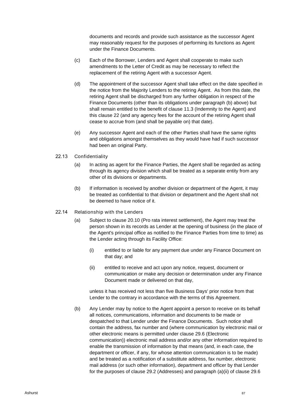 Ashurst 87 documents and records and provide such assistance as the successor Agent may reasonably request for the purposes of performing its functions as Agent under the Finance Documents. (c) Each of the Borrower, Lenders and Agent shall cooperate to make such amendments to the Letter of Credit as may be necessary to reflect the replacement of the retiring Agent with a successor Agent. (d) The appointment of the successor Agent shall take effect on the date specified in the notice from the Majority Lenders to the retiring Agent. As from this date, the retiring Agent shall be discharged from any further obligation in respect of the Finance Documents (other than its obligations under paragraph (b) above) but shall remain entitled to the benefit of clause 11.3 (Indemnity to the Agent) and this clause 22 (and any agency fees for the account of the retiring Agent shall cease to accrue from (and shall be payable on) that date). (e) Any successor Agent and each of the other Parties shall have the same rights and obligations amongst themselves as they would have had if such successor had been an original Party. Confidentiality (a) In acting as agent for the Finance Parties, the Agent shall be regarded as acting through its agency division which shall be treated as a separate entity from any other of its divisions or departments. (b) If information is received by another division or department of the Agent, it may be treated as confidential to that division or department and the Agent shall not be deemed to have notice of it. Relationship with the Lenders (a) Subject to clause 20.10 (Pro rata interest settlement), the Agent may treat the person shown in its records as Lender at the opening of business (in the place of the Agent's principal office as notified to the Finance Parties from time to time) as the Lender acting through its Facility Office: (i) entitled to or liable for any payment due under any Finance Document on that day; and (ii) entitled to receive and act upon any notice, request, document or communication or make any decision or determination under any Finance Document made or delivered on that day, unless it has received not less than five Business Days' prior notice from that Lender to the contrary in accordance with the terms of this Agreement. (b) Any Lender may by notice to the Agent appoint a person to receive on its behalf all notices, communications, information and documents to be made or despatched to that Lender under the Finance Documents. Such notice shall contain the address, fax number and (where communication by electronic mail or other electronic means is permitted under clause 29.6 (Electronic communication)) electronic mail address and/or any other information required to enable the transmission of information by that means (and, in each case, the department or officer, if any, for whose attention communication is to be made) and be treated as a notification of a substitute address, fax number, electronic mail address (or such other information), department and officer by that Lender for the purposes of clause 29.2 (Addresses) and paragraph (a)(ii) of clause 29.6