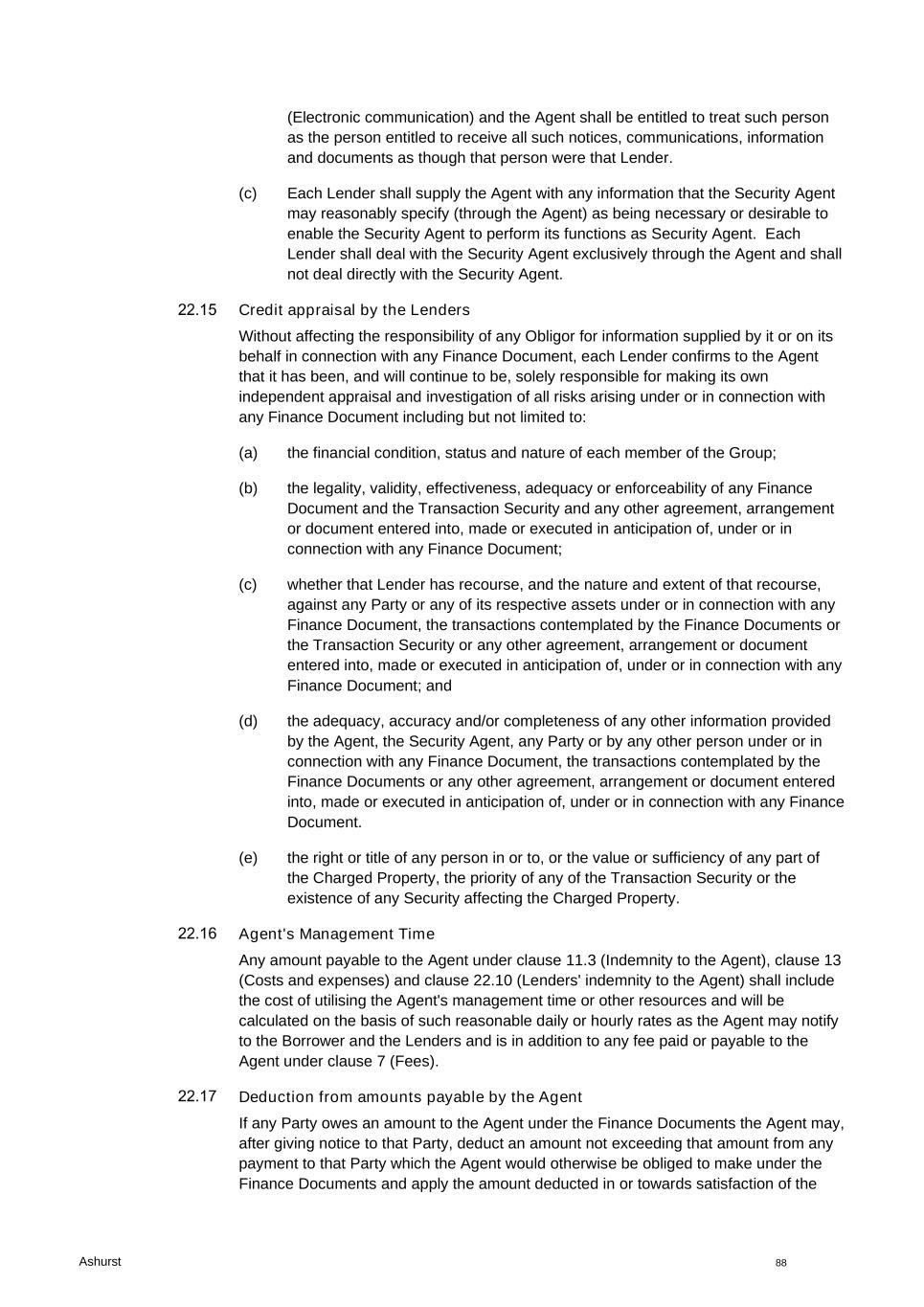 Ashurst 88 (Electronic communication) and the Agent shall be entitled to treat such person as the person entitled to receive all such notices, communications, information and documents as though that person were that Lender. (c) Each Lender shall supply the Agent with any information that the Security Agent may reasonably specify (through the Agent) as being necessary or desirable to enable the Security Agent to perform its functions as Security Agent. Each Lender shall deal with the Security Agent exclusively through the Agent and shall not deal directly with the Security Agent. Credit appraisal by the Lenders Without affecting the responsibility of any Obligor for information supplied by it or on its behalf in connection with any Finance Document, each Lender confirms to the Agent that it has been, and will continue to be, solely responsible for making its own independent appraisal and investigation of all risks arising under or in connection with any Finance Document including but not limited to: (a) the financial condition, status and nature of each member of the Group; (b) the legality, validity, effectiveness, adequacy or enforceability of any Finance Document and the Transaction Security and any other agreement, arrangement or document entered into, made or executed in anticipation of, under or in connection with any Finance Document; (c) whether that Lender has recourse, and the nature and extent of that recourse, against any Party or any of its respective assets under or in connection with any Finance Document, the transactions contemplated by the Finance Documents or the Transaction Security or any other agreement, arrangement or document entered into, made or executed in anticipation of, under or in connection with any Finance Document; and (d) the adequacy, accuracy and/or completeness of any other information provided by the Agent, the Security Agent, any Party or by any other person under or in connection with any Finance Document, the transactions contemplated by the Finance Documents or any other agreement, arrangement or document entered into, made or executed in anticipation of, under or in connection with any Finance Document. (e) the right or title of any person in or to, or the value or sufficiency of any part of the Charged Property, the priority of any of the Transaction Security or the existence of any Security affecting the Charged Property. Agent's Management Time Any amount payable to the Agent under clause 11.3 (Indemnity to the Agent), clause 13 (Costs and expenses) and clause 22.10 (Lenders' indemnity to the Agent) shall include the cost of utilising the Agent's management time or other resources and will be calculated on the basis of such reasonable daily or hourly rates as the Agent may notify to the Borrower and the Lenders and is in addition to any fee paid or payable to the Agent under clause 7 (Fees). Deduction from amounts payable by the Agent If any Party owes an amount to the Agent under the Finance Documents the Agent may, after giving notice to that Party, deduct an amount not exceeding that amount from any payment to that Party which the Agent would otherwise be obliged to make under the Finance Documents and apply the amount deducted in or towards satisfaction of the