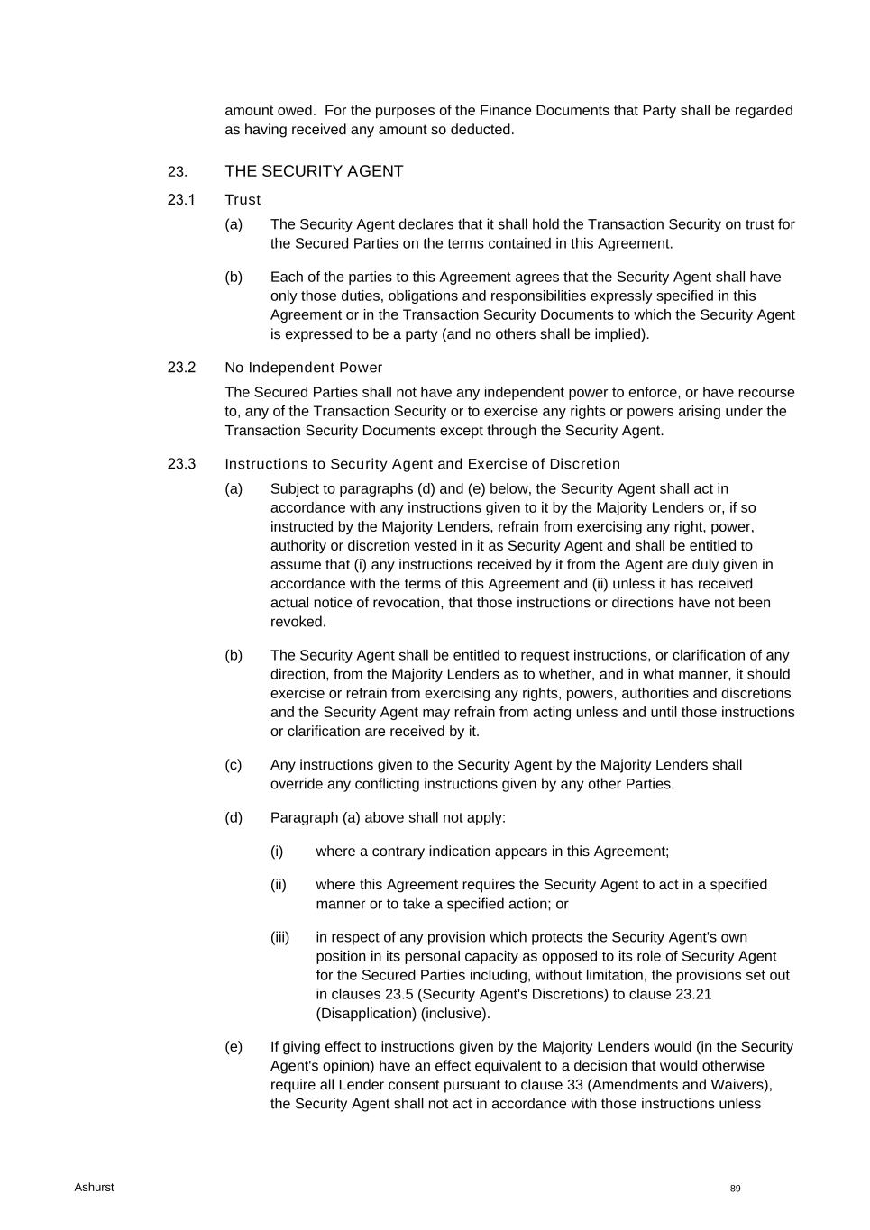 Ashurst 89 amount owed. For the purposes of the Finance Documents that Party shall be regarded as having received any amount so deducted. 23. THE SECURITY AGENT Trust (a) The Security Agent declares that it shall hold the Transaction Security on trust for the Secured Parties on the terms contained in this Agreement. (b) Each of the parties to this Agreement agrees that the Security Agent shall have only those duties, obligations and responsibilities expressly specified in this Agreement or in the Transaction Security Documents to which the Security Agent is expressed to be a party (and no others shall be implied). No Independent Power The Secured Parties shall not have any independent power to enforce, or have recourse to, any of the Transaction Security or to exercise any rights or powers arising under the Transaction Security Documents except through the Security Agent. Instructions to Security Agent and Exercise of Discretion (a) Subject to paragraphs (d) and (e) below, the Security Agent shall act in accordance with any instructions given to it by the Majority Lenders or, if so instructed by the Majority Lenders, refrain from exercising any right, power, authority or discretion vested in it as Security Agent and shall be entitled to assume that (i) any instructions received by it from the Agent are duly given in accordance with the terms of this Agreement and (ii) unless it has received actual notice of revocation, that those instructions or directions have not been revoked. (b) The Security Agent shall be entitled to request instructions, or clarification of any direction, from the Majority Lenders as to whether, and in what manner, it should exercise or refrain from exercising any rights, powers, authorities and discretions and the Security Agent may refrain from acting unless and until those instructions or clarification are received by it. (c) Any instructions given to the Security Agent by the Majority Lenders shall override any conflicting instructions given by any other Parties. (d) Paragraph (a) above shall not apply: (i) where a contrary indication appears in this Agreement; (ii) where this Agreement requires the Security Agent to act in a specified manner or to take a specified action; or (iii) in respect of any provision which protects the Security Agent's own position in its personal capacity as opposed to its role of Security Agent for the Secured Parties including, without limitation, the provisions set out in clauses 23.5 (Security Agent's Discretions) to clause 23.21 (Disapplication) (inclusive). (e) If giving effect to instructions given by the Majority Lenders would (in the Security Agent's opinion) have an effect equivalent to a decision that would otherwise require all Lender consent pursuant to clause 33 (Amendments and Waivers), the Security Agent shall not act in accordance with those instructions unless