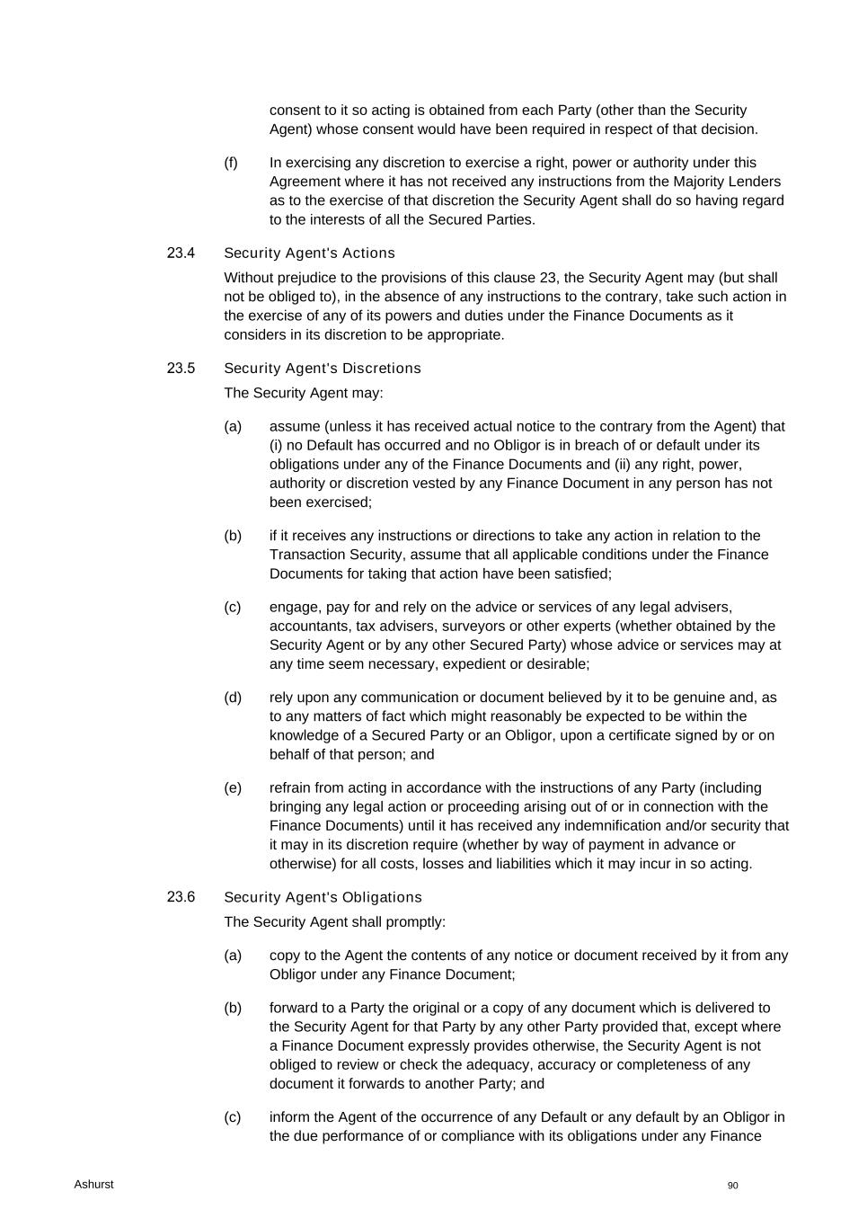 Ashurst 90 consent to it so acting is obtained from each Party (other than the Security Agent) whose consent would have been required in respect of that decision. (f) In exercising any discretion to exercise a right, power or authority under this Agreement where it has not received any instructions from the Majority Lenders as to the exercise of that discretion the Security Agent shall do so having regard to the interests of all the Secured Parties. Security Agent's Actions Without prejudice to the provisions of this clause 23, the Security Agent may (but shall not be obliged to), in the absence of any instructions to the contrary, take such action in the exercise of any of its powers and duties under the Finance Documents as it considers in its discretion to be appropriate. Security Agent's Discretions The Security Agent may: (a) assume (unless it has received actual notice to the contrary from the Agent) that (i) no Default has occurred and no Obligor is in breach of or default under its obligations under any of the Finance Documents and (ii) any right, power, authority or discretion vested by any Finance Document in any person has not been exercised; (b) if it receives any instructions or directions to take any action in relation to the Transaction Security, assume that all applicable conditions under the Finance Documents for taking that action have been satisfied; (c) engage, pay for and rely on the advice or services of any legal advisers, accountants, tax advisers, surveyors or other experts (whether obtained by the Security Agent or by any other Secured Party) whose advice or services may at any time seem necessary, expedient or desirable; (d) rely upon any communication or document believed by it to be genuine and, as to any matters of fact which might reasonably be expected to be within the knowledge of a Secured Party or an Obligor, upon a certificate signed by or on behalf of that person; and (e) refrain from acting in accordance with the instructions of any Party (including bringing any legal action or proceeding arising out of or in connection with the Finance Documents) until it has received any indemnification and/or security that it may in its discretion require (whether by way of payment in advance or otherwise) for all costs, losses and liabilities which it may incur in so acting. Security Agent's Obligations The Security Agent shall promptly: (a) copy to the Agent the contents of any notice or document received by it from any Obligor under any Finance Document; (b) forward to a Party the original or a copy of any document which is delivered to the Security Agent for that Party by any other Party provided that, except where a Finance Document expressly provides otherwise, the Security Agent is not obliged to review or check the adequacy, accuracy or completeness of any document it forwards to another Party; and (c) inform the Agent of the occurrence of any Default or any default by an Obligor in the due performance of or compliance with its obligations under any Finance