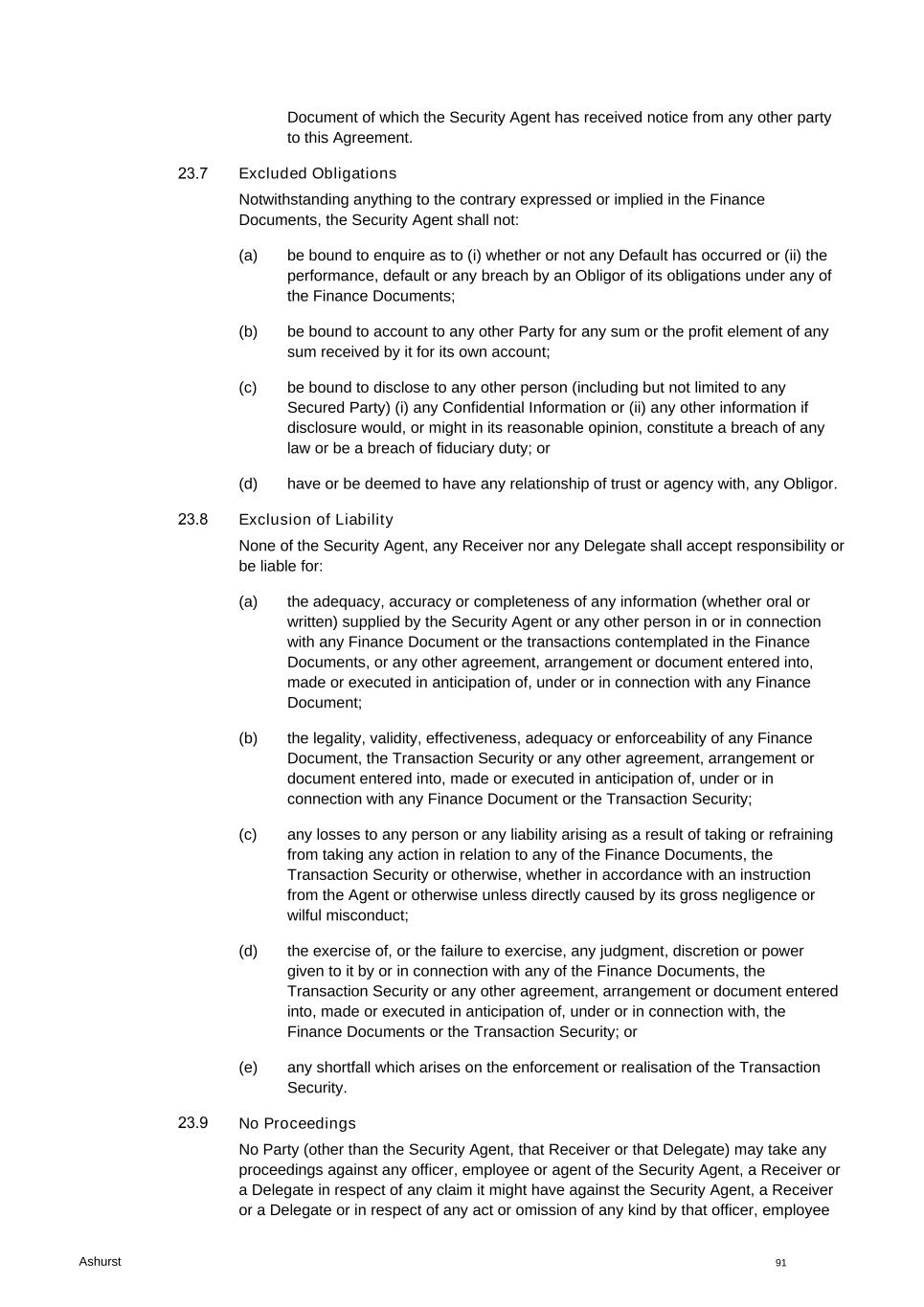 Ashurst 91 Document of which the Security Agent has received notice from any other party to this Agreement. Excluded Obligations Notwithstanding anything to the contrary expressed or implied in the Finance Documents, the Security Agent shall not: (a) be bound to enquire as to (i) whether or not any Default has occurred or (ii) the performance, default or any breach by an Obligor of its obligations under any of the Finance Documents; (b) be bound to account to any other Party for any sum or the profit element of any sum received by it for its own account; (c) be bound to disclose to any other person (including but not limited to any Secured Party) (i) any Confidential Information or (ii) any other information if disclosure would, or might in its reasonable opinion, constitute a breach of any law or be a breach of fiduciary duty; or (d) have or be deemed to have any relationship of trust or agency with, any Obligor. Exclusion of Liability None of the Security Agent, any Receiver nor any Delegate shall accept responsibility or be liable for: (a) the adequacy, accuracy or completeness of any information (whether oral or written) supplied by the Security Agent or any other person in or in connection with any Finance Document or the transactions contemplated in the Finance Documents, or any other agreement, arrangement or document entered into, made or executed in anticipation of, under or in connection with any Finance Document; (b) the legality, validity, effectiveness, adequacy or enforceability of any Finance Document, the Transaction Security or any other agreement, arrangement or document entered into, made or executed in anticipation of, under or in connection with any Finance Document or the Transaction Security; (c) any losses to any person or any liability arising as a result of taking or refraining from taking any action in relation to any of the Finance Documents, the Transaction Security or otherwise, whether in accordance with an instruction from the Agent or otherwise unless directly caused by its gross negligence or wilful misconduct; (d) the exercise of, or the failure to exercise, any judgment, discretion or power given to it by or in connection with any of the Finance Documents, the Transaction Security or any other agreement, arrangement or document entered into, made or executed in anticipation of, under or in connection with, the Finance Documents or the Transaction Security; or (e) any shortfall which arises on the enforcement or realisation of the Transaction Security. No Proceedings No Party (other than the Security Agent, that Receiver or that Delegate) may take any proceedings against any officer, employee or agent of the Security Agent, a Receiver or a Delegate in respect of any claim it might have against the Security Agent, a Receiver or a Delegate or in respect of any act or omission of any kind by that officer, employee