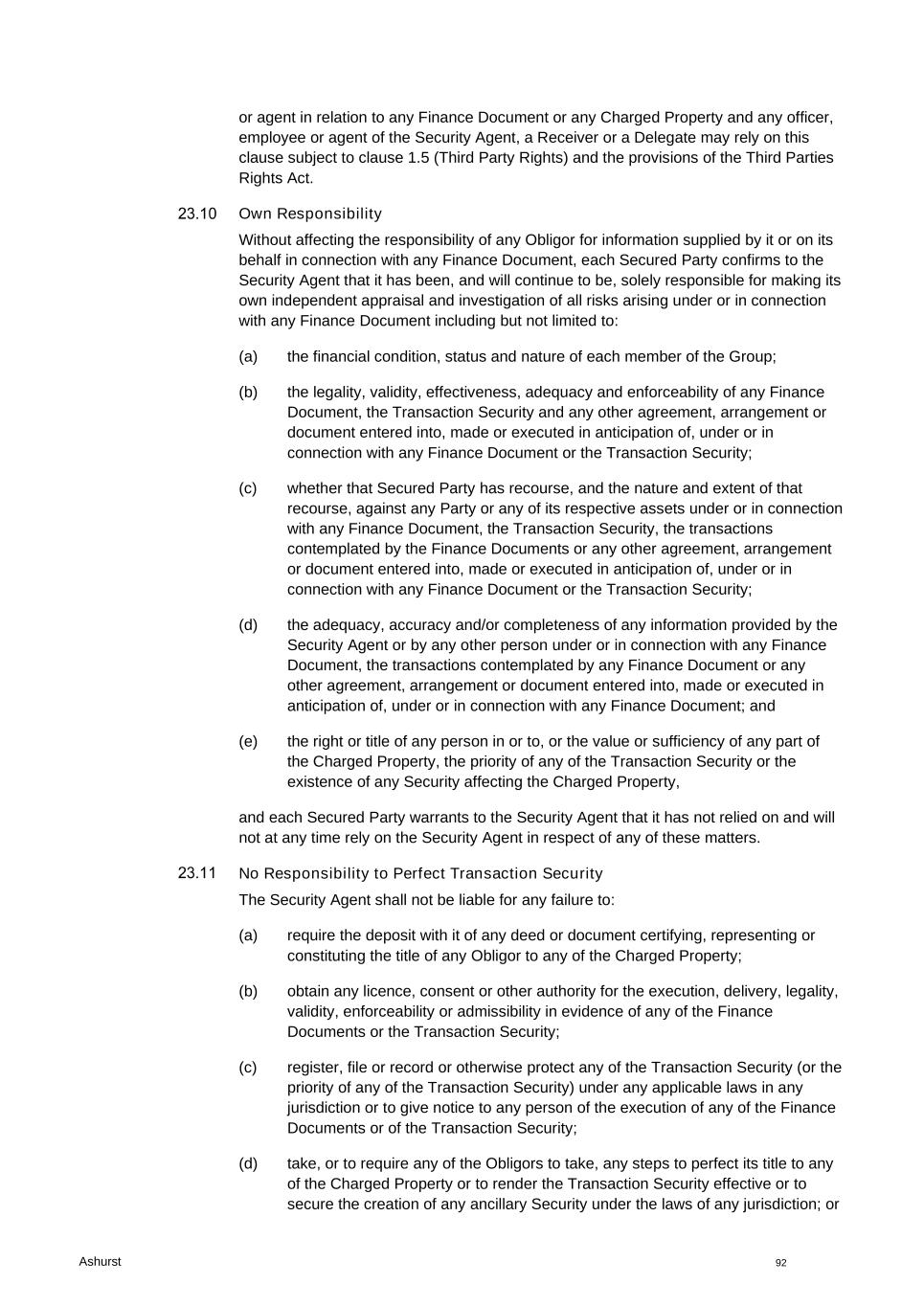 Ashurst 92 or agent in relation to any Finance Document or any Charged Property and any officer, employee or agent of the Security Agent, a Receiver or a Delegate may rely on this clause subject to clause 1.5 (Third Party Rights) and the provisions of the Third Parties Rights Act. Own Responsibility Without affecting the responsibility of any Obligor for information supplied by it or on its behalf in connection with any Finance Document, each Secured Party confirms to the Security Agent that it has been, and will continue to be, solely responsible for making its own independent appraisal and investigation of all risks arising under or in connection with any Finance Document including but not limited to: (a) the financial condition, status and nature of each member of the Group; (b) the legality, validity, effectiveness, adequacy and enforceability of any Finance Document, the Transaction Security and any other agreement, arrangement or document entered into, made or executed in anticipation of, under or in connection with any Finance Document or the Transaction Security; (c) whether that Secured Party has recourse, and the nature and extent of that recourse, against any Party or any of its respective assets under or in connection with any Finance Document, the Transaction Security, the transactions contemplated by the Finance Documents or any other agreement, arrangement or document entered into, made or executed in anticipation of, under or in connection with any Finance Document or the Transaction Security; (d) the adequacy, accuracy and/or completeness of any information provided by the Security Agent or by any other person under or in connection with any Finance Document, the transactions contemplated by any Finance Document or any other agreement, arrangement or document entered into, made or executed in anticipation of, under or in connection with any Finance Document; and (e) the right or title of any person in or to, or the value or sufficiency of any part of the Charged Property, the priority of any of the Transaction Security or the existence of any Security affecting the Charged Property, and each Secured Party warrants to the Security Agent that it has not relied on and will not at any time rely on the Security Agent in respect of any of these matters. No Responsibility to Perfect Transaction Security The Security Agent shall not be liable for any failure to: (a) require the deposit with it of any deed or document certifying, representing or constituting the title of any Obligor to any of the Charged Property; (b) obtain any licence, consent or other authority for the execution, delivery, legality, validity, enforceability or admissibility in evidence of any of the Finance Documents or the Transaction Security; (c) register, file or record or otherwise protect any of the Transaction Security (or the priority of any of the Transaction Security) under any applicable laws in any jurisdiction or to give notice to any person of the execution of any of the Finance Documents or of the Transaction Security; (d) take, or to require any of the Obligors to take, any steps to perfect its title to any of the Charged Property or to render the Transaction Security effective or to secure the creation of any ancillary Security under the laws of any jurisdiction; or
