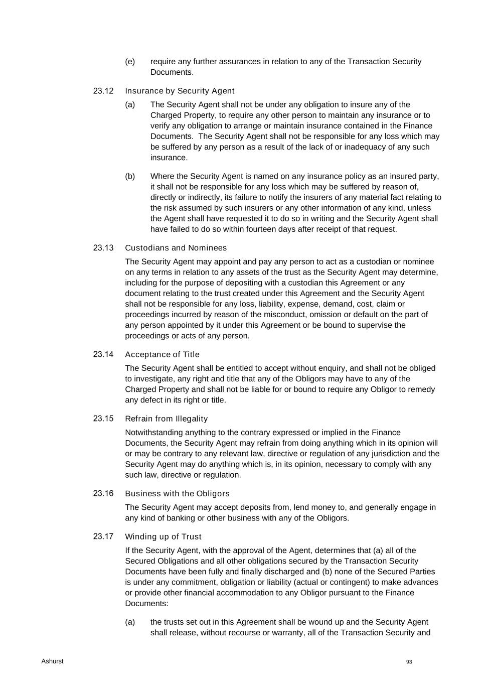 Ashurst 93 (e) require any further assurances in relation to any of the Transaction Security Documents. Insurance by Security Agent (a) The Security Agent shall not be under any obligation to insure any of the Charged Property, to require any other person to maintain any insurance or to verify any obligation to arrange or maintain insurance contained in the Finance Documents. The Security Agent shall not be responsible for any loss which may be suffered by any person as a result of the lack of or inadequacy of any such insurance. (b) Where the Security Agent is named on any insurance policy as an insured party, it shall not be responsible for any loss which may be suffered by reason of, directly or indirectly, its failure to notify the insurers of any material fact relating to the risk assumed by such insurers or any other information of any kind, unless the Agent shall have requested it to do so in writing and the Security Agent shall have failed to do so within fourteen days after receipt of that request. Custodians and Nominees The Security Agent may appoint and pay any person to act as a custodian or nominee on any terms in relation to any assets of the trust as the Security Agent may determine, including for the purpose of depositing with a custodian this Agreement or any document relating to the trust created under this Agreement and the Security Agent shall not be responsible for any loss, liability, expense, demand, cost, claim or proceedings incurred by reason of the misconduct, omission or default on the part of any person appointed by it under this Agreement or be bound to supervise the proceedings or acts of any person. Acceptance of Title The Security Agent shall be entitled to accept without enquiry, and shall not be obliged to investigate, any right and title that any of the Obligors may have to any of the Charged Property and shall not be liable for or bound to require any Obligor to remedy any defect in its right or title. Refrain from Illegality Notwithstanding anything to the contrary expressed or implied in the Finance Documents, the Security Agent may refrain from doing anything which in its opinion will or may be contrary to any relevant law, directive or regulation of any jurisdiction and the Security Agent may do anything which is, in its opinion, necessary to comply with any such law, directive or regulation. Business with the Obligors The Security Agent may accept deposits from, lend money to, and generally engage in any kind of banking or other business with any of the Obligors. Winding up of Trust If the Security Agent, with the approval of the Agent, determines that (a) all of the Secured Obligations and all other obligations secured by the Transaction Security Documents have been fully and finally discharged and (b) none of the Secured Parties is under any commitment, obligation or liability (actual or contingent) to make advances or provide other financial accommodation to any Obligor pursuant to the Finance Documents: (a) the trusts set out in this Agreement shall be wound up and the Security Agent shall release, without recourse or warranty, all of the Transaction Security and