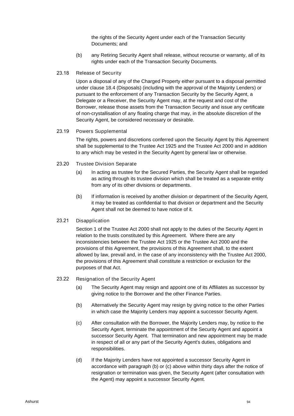 Ashurst 94 the rights of the Security Agent under each of the Transaction Security Documents; and (b) any Retiring Security Agent shall release, without recourse or warranty, all of its rights under each of the Transaction Security Documents. Release of Security Upon a disposal of any of the Charged Property either pursuant to a disposal permitted under clause 18.4 (Disposals) (including with the approval of the Majority Lenders) or pursuant to the enforcement of any Transaction Security by the Security Agent, a Delegate or a Receiver, the Security Agent may, at the request and cost of the Borrower, release those assets from the Transaction Security and issue any certificate of non-crystallisation of any floating charge that may, in the absolute discretion of the Security Agent, be considered necessary or desirable. Powers Supplemental The rights, powers and discretions conferred upon the Security Agent by this Agreement shall be supplemental to the Trustee Act 1925 and the Trustee Act 2000 and in addition to any which may be vested in the Security Agent by general law or otherwise. Trustee Division Separate (a) In acting as trustee for the Secured Parties, the Security Agent shall be regarded as acting through its trustee division which shall be treated as a separate entity from any of its other divisions or departments. (b) If information is received by another division or department of the Security Agent, it may be treated as confidential to that division or department and the Security Agent shall not be deemed to have notice of it. Disapplication Section 1 of the Trustee Act 2000 shall not apply to the duties of the Security Agent in relation to the trusts constituted by this Agreement. Where there are any inconsistencies between the Trustee Act 1925 or the Trustee Act 2000 and the provisions of this Agreement, the provisions of this Agreement shall, to the extent allowed by law, prevail and, in the case of any inconsistency with the Trustee Act 2000, the provisions of this Agreement shall constitute a restriction or exclusion for the purposes of that Act. Resignation of the Security Agent (a) The Security Agent may resign and appoint one of its Affiliates as successor by giving notice to the Borrower and the other Finance Parties. (b) Alternatively the Security Agent may resign by giving notice to the other Parties in which case the Majority Lenders may appoint a successor Security Agent. (c) After consultation with the Borrower, the Majority Lenders may, by notice to the Security Agent, terminate the appointment of the Security Agent and appoint a successor Security Agent. That termination and new appointment may be made in respect of all or any part of the Security Agent's duties, obligations and responsibilities. (d) If the Majority Lenders have not appointed a successor Security Agent in accordance with paragraph (b) or (c) above within thirty days after the notice of resignation or termination was given, the Security Agent (after consultation with the Agent) may appoint a successor Security Agent.