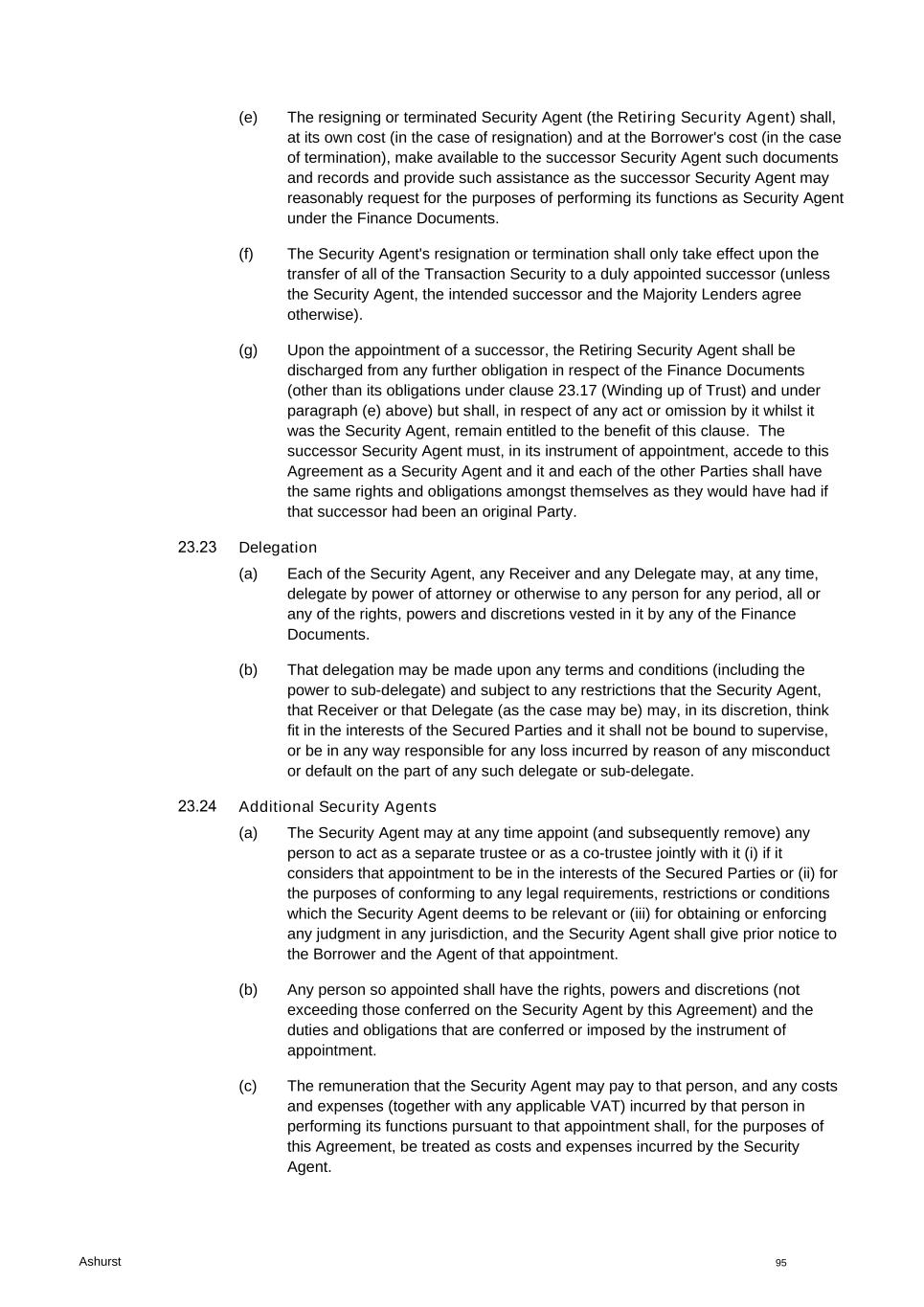 Ashurst 95 (e) The resigning or terminated Security Agent (the Retiring Security Agent) shall, at its own cost (in the case of resignation) and at the Borrower's cost (in the case of termination), make available to the successor Security Agent such documents and records and provide such assistance as the successor Security Agent may reasonably request for the purposes of performing its functions as Security Agent under the Finance Documents. (f) The Security Agent's resignation or termination shall only take effect upon the transfer of all of the Transaction Security to a duly appointed successor (unless the Security Agent, the intended successor and the Majority Lenders agree otherwise). (g) Upon the appointment of a successor, the Retiring Security Agent shall be discharged from any further obligation in respect of the Finance Documents (other than its obligations under clause 23.17 (Winding up of Trust) and under paragraph (e) above) but shall, in respect of any act or omission by it whilst it was the Security Agent, remain entitled to the benefit of this clause. The successor Security Agent must, in its instrument of appointment, accede to this Agreement as a Security Agent and it and each of the other Parties shall have the same rights and obligations amongst themselves as they would have had if that successor had been an original Party. Delegation (a) Each of the Security Agent, any Receiver and any Delegate may, at any time, delegate by power of attorney or otherwise to any person for any period, all or any of the rights, powers and discretions vested in it by any of the Finance Documents. (b) That delegation may be made upon any terms and conditions (including the power to sub-delegate) and subject to any restrictions that the Security Agent, that Receiver or that Delegate (as the case may be) may, in its discretion, think fit in the interests of the Secured Parties and it shall not be bound to supervise, or be in any way responsible for any loss incurred by reason of any misconduct or default on the part of any such delegate or sub-delegate. Additional Security Agents (a) The Security Agent may at any time appoint (and subsequently remove) any person to act as a separate trustee or as a co-trustee jointly with it (i) if it considers that appointment to be in the interests of the Secured Parties or (ii) for the purposes of conforming to any legal requirements, restrictions or conditions which the Security Agent deems to be relevant or (iii) for obtaining or enforcing any judgment in any jurisdiction, and the Security Agent shall give prior notice to the Borrower and the Agent of that appointment. (b) Any person so appointed shall have the rights, powers and discretions (not exceeding those conferred on the Security Agent by this Agreement) and the duties and obligations that are conferred or imposed by the instrument of appointment. (c) The remuneration that the Security Agent may pay to that person, and any costs and expenses (together with any applicable VAT) incurred by that person in performing its functions pursuant to that appointment shall, for the purposes of this Agreement, be treated as costs and expenses incurred by the Security Agent.