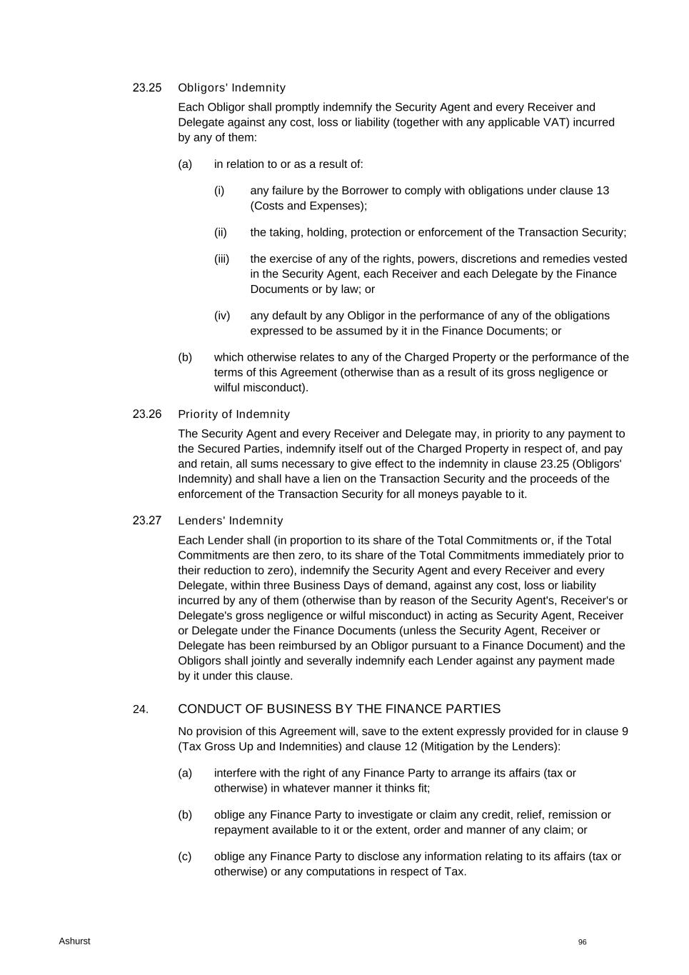 Ashurst 96 Obligors' Indemnity Each Obligor shall promptly indemnify the Security Agent and every Receiver and Delegate against any cost, loss or liability (together with any applicable VAT) incurred by any of them: (a) in relation to or as a result of: (i) any failure by the Borrower to comply with obligations under clause 13 (Costs and Expenses); (ii) the taking, holding, protection or enforcement of the Transaction Security; (iii) the exercise of any of the rights, powers, discretions and remedies vested in the Security Agent, each Receiver and each Delegate by the Finance Documents or by law; or (iv) any default by any Obligor in the performance of any of the obligations expressed to be assumed by it in the Finance Documents; or (b) which otherwise relates to any of the Charged Property or the performance of the terms of this Agreement (otherwise than as a result of its gross negligence or wilful misconduct). Priority of Indemnity The Security Agent and every Receiver and Delegate may, in priority to any payment to the Secured Parties, indemnify itself out of the Charged Property in respect of, and pay and retain, all sums necessary to give effect to the indemnity in clause 23.25 (Obligors' Indemnity) and shall have a lien on the Transaction Security and the proceeds of the enforcement of the Transaction Security for all moneys payable to it. Lenders' Indemnity Each Lender shall (in proportion to its share of the Total Commitments or, if the Total Commitments are then zero, to its share of the Total Commitments immediately prior to their reduction to zero), indemnify the Security Agent and every Receiver and every Delegate, within three Business Days of demand, against any cost, loss or liability incurred by any of them (otherwise than by reason of the Security Agent's, Receiver's or Delegate's gross negligence or wilful misconduct) in acting as Security Agent, Receiver or Delegate under the Finance Documents (unless the Security Agent, Receiver or Delegate has been reimbursed by an Obligor pursuant to a Finance Document) and the Obligors shall jointly and severally indemnify each Lender against any payment made by it under this clause. 24. CONDUCT OF BUSINESS BY THE FINANCE PARTIES No provision of this Agreement will, save to the extent expressly provided for in clause 9 (Tax Gross Up and Indemnities) and clause 12 (Mitigation by the Lenders): (a) interfere with the right of any Finance Party to arrange its affairs (tax or otherwise) in whatever manner it thinks fit; (b) oblige any Finance Party to investigate or claim any credit, relief, remission or repayment available to it or the extent, order and manner of any claim; or (c) oblige any Finance Party to disclose any information relating to its affairs (tax or otherwise) or any computations in respect of Tax.