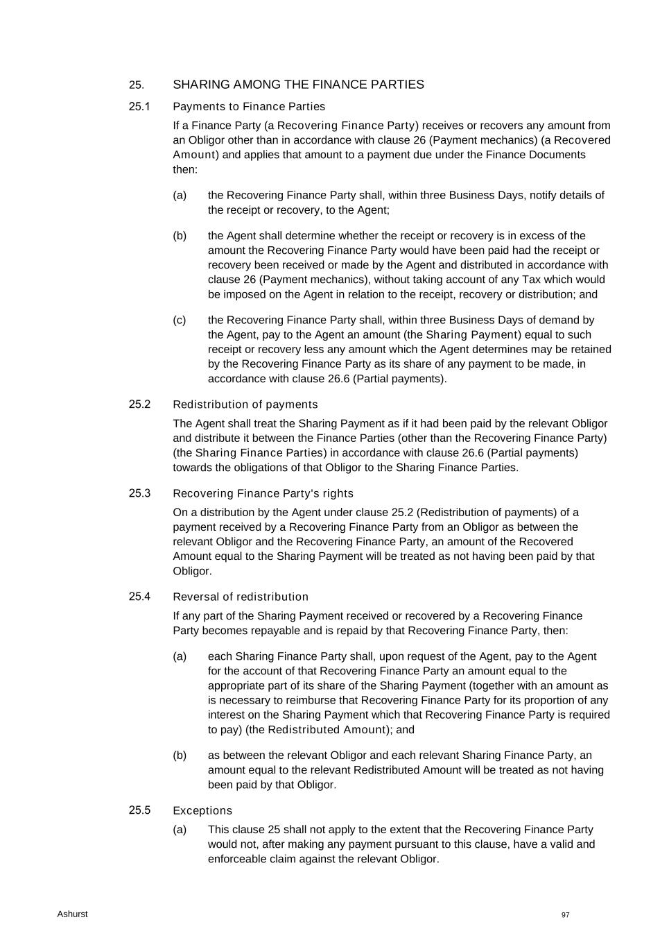 Ashurst 97 25. SHARING AMONG THE FINANCE PARTIES Payments to Finance Parties If a Finance Party (a Recovering Finance Party) receives or recovers any amount from an Obligor other than in accordance with clause 26 (Payment mechanics) (a Recovered Amount) and applies that amount to a payment due under the Finance Documents then: (a) the Recovering Finance Party shall, within three Business Days, notify details of the receipt or recovery, to the Agent; (b) the Agent shall determine whether the receipt or recovery is in excess of the amount the Recovering Finance Party would have been paid had the receipt or recovery been received or made by the Agent and distributed in accordance with clause 26 (Payment mechanics), without taking account of any Tax which would be imposed on the Agent in relation to the receipt, recovery or distribution; and (c) the Recovering Finance Party shall, within three Business Days of demand by the Agent, pay to the Agent an amount (the Sharing Payment) equal to such receipt or recovery less any amount which the Agent determines may be retained by the Recovering Finance Party as its share of any payment to be made, in accordance with clause 26.6 (Partial payments). Redistribution of payments The Agent shall treat the Sharing Payment as if it had been paid by the relevant Obligor and distribute it between the Finance Parties (other than the Recovering Finance Party) (the Sharing Finance Parties) in accordance with clause 26.6 (Partial payments) towards the obligations of that Obligor to the Sharing Finance Parties. Recovering Finance Party's rights On a distribution by the Agent under clause 25.2 (Redistribution of payments) of a payment received by a Recovering Finance Party from an Obligor as between the relevant Obligor and the Recovering Finance Party, an amount of the Recovered Amount equal to the Sharing Payment will be treated as not having been paid by that Obligor. Reversal of redistribution If any part of the Sharing Payment received or recovered by a Recovering Finance Party becomes repayable and is repaid by that Recovering Finance Party, then: (a) each Sharing Finance Party shall, upon request of the Agent, pay to the Agent for the account of that Recovering Finance Party an amount equal to the appropriate part of its share of the Sharing Payment (together with an amount as is necessary to reimburse that Recovering Finance Party for its proportion of any interest on the Sharing Payment which that Recovering Finance Party is required to pay) (the Redistributed Amount); and (b) as between the relevant Obligor and each relevant Sharing Finance Party, an amount equal to the relevant Redistributed Amount will be treated as not having been paid by that Obligor. Exceptions (a) This clause 25 shall not apply to the extent that the Recovering Finance Party would not, after making any payment pursuant to this clause, have a valid and enforceable claim against the relevant Obligor.