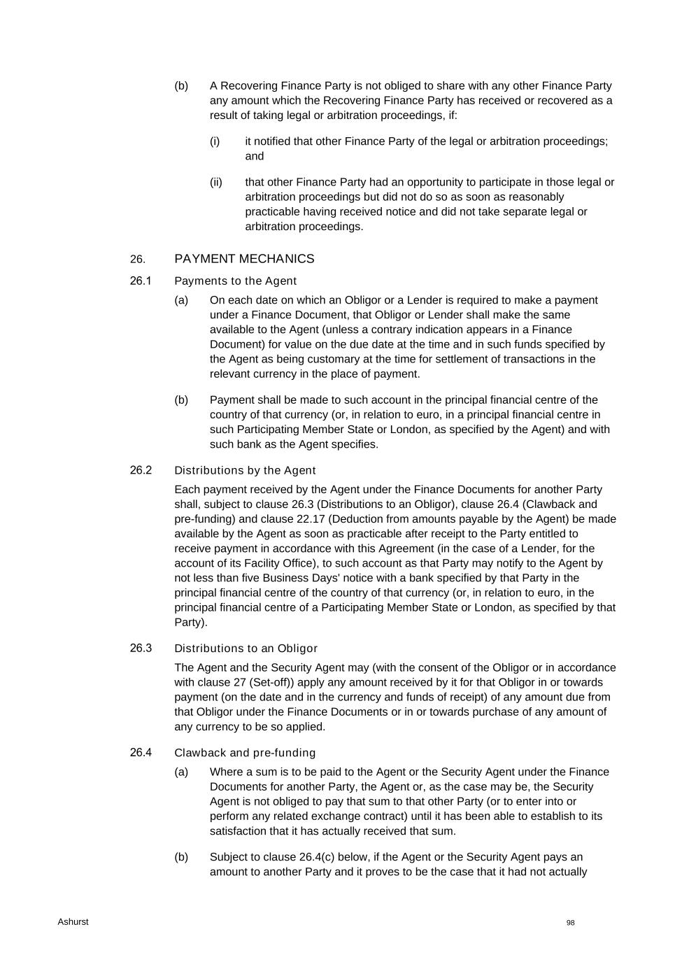 Ashurst 98 (b) A Recovering Finance Party is not obliged to share with any other Finance Party any amount which the Recovering Finance Party has received or recovered as a result of taking legal or arbitration proceedings, if: (i) it notified that other Finance Party of the legal or arbitration proceedings; and (ii) that other Finance Party had an opportunity to participate in those legal or arbitration proceedings but did not do so as soon as reasonably practicable having received notice and did not take separate legal or arbitration proceedings. 26. PAYMENT MECHANICS Payments to the Agent (a) On each date on which an Obligor or a Lender is required to make a payment under a Finance Document, that Obligor or Lender shall make the same available to the Agent (unless a contrary indication appears in a Finance Document) for value on the due date at the time and in such funds specified by the Agent as being customary at the time for settlement of transactions in the relevant currency in the place of payment. (b) Payment shall be made to such account in the principal financial centre of the country of that currency (or, in relation to euro, in a principal financial centre in such Participating Member State or London, as specified by the Agent) and with such bank as the Agent specifies. Distributions by the Agent Each payment received by the Agent under the Finance Documents for another Party shall, subject to clause 26.3 (Distributions to an Obligor), clause 26.4 (Clawback and pre-funding) and clause 22.17 (Deduction from amounts payable by the Agent) be made available by the Agent as soon as practicable after receipt to the Party entitled to receive payment in accordance with this Agreement (in the case of a Lender, for the account of its Facility Office), to such account as that Party may notify to the Agent by not less than five Business Days' notice with a bank specified by that Party in the principal financial centre of the country of that currency (or, in relation to euro, in the principal financial centre of a Participating Member State or London, as specified by that Party). Distributions to an Obligor The Agent and the Security Agent may (with the consent of the Obligor or in accordance with clause 27 (Set-off)) apply any amount received by it for that Obligor in or towards payment (on the date and in the currency and funds of receipt) of any amount due from that Obligor under the Finance Documents or in or towards purchase of any amount of any currency to be so applied. Clawback and pre-funding (a) Where a sum is to be paid to the Agent or the Security Agent under the Finance Documents for another Party, the Agent or, as the case may be, the Security Agent is not obliged to pay that sum to that other Party (or to enter into or perform any related exchange contract) until it has been able to establish to its satisfaction that it has actually received that sum. (b) Subject to clause 26.4(c) below, if the Agent or the Security Agent pays an amount to another Party and it proves to be the case that it had not actually