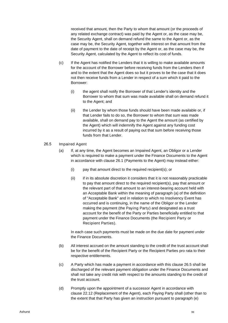 Ashurst 99 received that amount, then the Party to whom that amount (or the proceeds of any related exchange contract) was paid by the Agent or, as the case may be, the Security Agent, shall on demand refund the same to the Agent or, as the case may be, the Security Agent, together with interest on that amount from the date of payment to the date of receipt by the Agent or, as the case may be, the Security Agent, calculated by the Agent to reflect its cost of funds. (c) If the Agent has notified the Lenders that it is willing to make available amounts for the account of the Borrower before receiving funds from the Lenders then if and to the extent that the Agent does so but it proves to be the case that it does not then receive funds from a Lender in respect of a sum which it paid to the Borrower: (i) the agent shall notify the Borrower of that Lender's identity and the Borrower to whom that sum was made available shall on demand refund it to the Agent; and (ii) the Lender by whom those funds should have been made available or, if that Lender fails to do so, the Borrower to whom that sum was made available, shall on demand pay to the Agent the amount (as certified by the Agent) which will indemnify the Agent against any funding cost incurred by it as a result of paying out that sum before receiving those funds from that Lender. Impaired Agent (a) If, at any time, the Agent becomes an Impaired Agent, an Obligor or a Lender which is required to make a payment under the Finance Documents to the Agent in accordance with clause 26.1 (Payments to the Agent) may instead either: (i) pay that amount direct to the required recipient(s); or (ii) if in its absolute discretion it considers that it is not reasonably practicable to pay that amount direct to the required recipient(s), pay that amount or the relevant part of that amount to an interest-bearing account held with an Acceptable Bank within the meaning of paragraph (a) of the definition of "Acceptable Bank" and in relation to which no Insolvency Event has occurred and is continuing, in the name of the Obligor or the Lender making the payment (the Paying Party) and designated as a trust account for the benefit of the Party or Parties beneficially entitled to that payment under the Finance Documents (the Recipient Party or Recipient Parties). In each case such payments must be made on the due date for payment under the Finance Documents. (b) All interest accrued on the amount standing to the credit of the trust account shall be for the benefit of the Recipient Party or the Recipient Parties pro rata to their respective entitlements. (c) A Party which has made a payment in accordance with this clause 26.5 shall be discharged of the relevant payment obligation under the Finance Documents and shall not take any credit risk with respect to the amounts standing to the credit of the trust account. (d) Promptly upon the appointment of a successor Agent in accordance with clause 22.12 (Replacement of the Agent), each Paying Party shall (other than to the extent that that Party has given an instruction pursuant to paragraph (e)