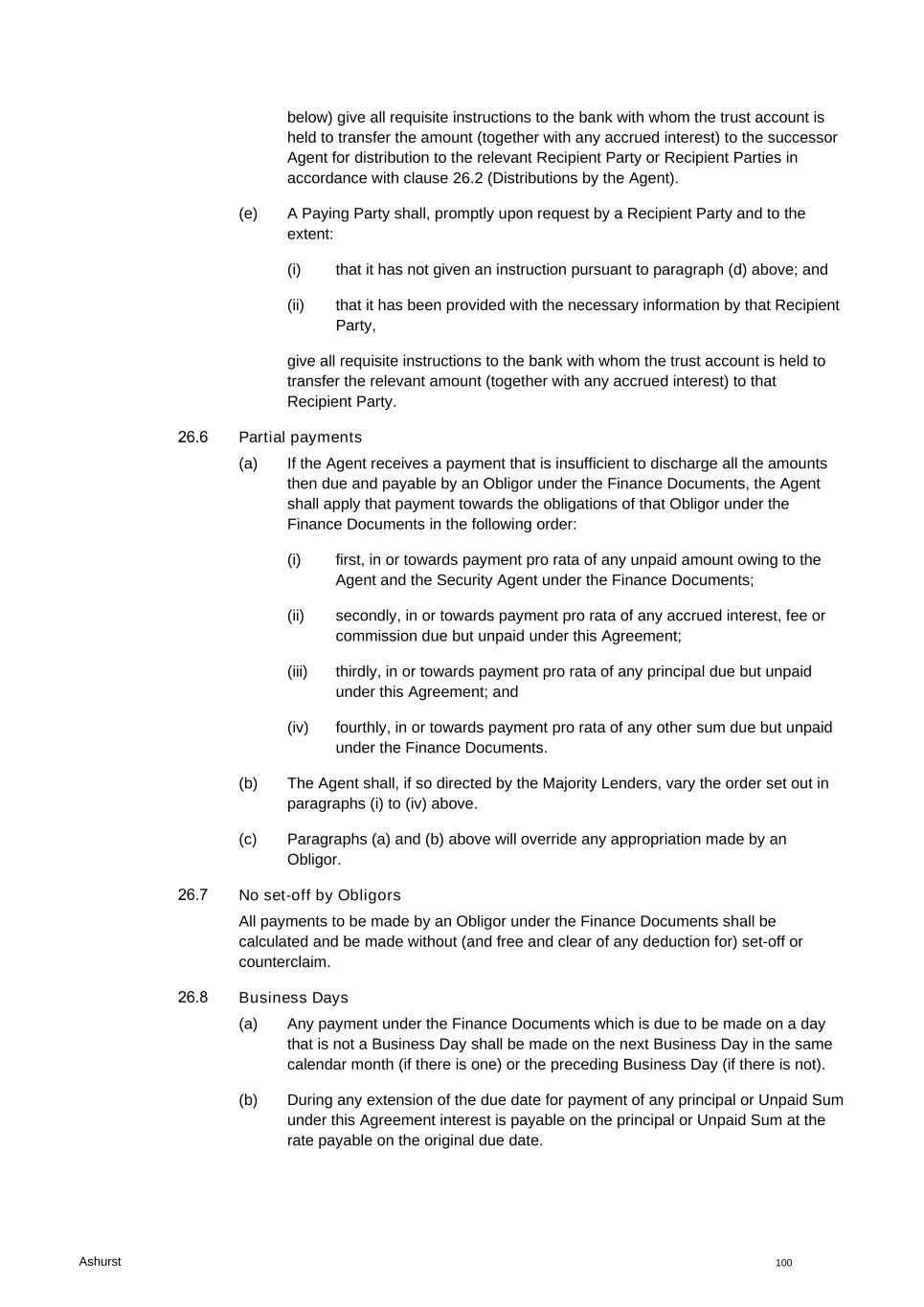 Ashurst 100 below) give all requisite instructions to the bank with whom the trust account is held to transfer the amount (together with any accrued interest) to the successor Agent for distribution to the relevant Recipient Party or Recipient Parties in accordance with clause 26.2 (Distributions by the Agent). (e) A Paying Party shall, promptly upon request by a Recipient Party and to the extent: (i) that it has not given an instruction pursuant to paragraph (d) above; and (ii) that it has been provided with the necessary information by that Recipient Party, give all requisite instructions to the bank with whom the trust account is held to transfer the relevant amount (together with any accrued interest) to that Recipient Party. Partial payments (a) If the Agent receives a payment that is insufficient to discharge all the amounts then due and payable by an Obligor under the Finance Documents, the Agent shall apply that payment towards the obligations of that Obligor under the Finance Documents in the following order: (i) first, in or towards payment pro rata of any unpaid amount owing to the Agent and the Security Agent under the Finance Documents; (ii) secondly, in or towards payment pro rata of any accrued interest, fee or commission due but unpaid under this Agreement; (iii) thirdly, in or towards payment pro rata of any principal due but unpaid under this Agreement; and (iv) fourthly, in or towards payment pro rata of any other sum due but unpaid under the Finance Documents. (b) The Agent shall, if so directed by the Majority Lenders, vary the order set out in paragraphs (i) to (iv) above. (c) Paragraphs (a) and (b) above will override any appropriation made by an Obligor. No set-off by Obligors All payments to be made by an Obligor under the Finance Documents shall be calculated and be made without (and free and clear of any deduction for) set-off or counterclaim. Business Days (a) Any payment under the Finance Documents which is due to be made on a day that is not a Business Day shall be made on the next Business Day in the same calendar month (if there is one) or the preceding Business Day (if there is not). (b) During any extension of the due date for payment of any principal or Unpaid Sum under this Agreement interest is payable on the principal or Unpaid Sum at the rate payable on the original due date.