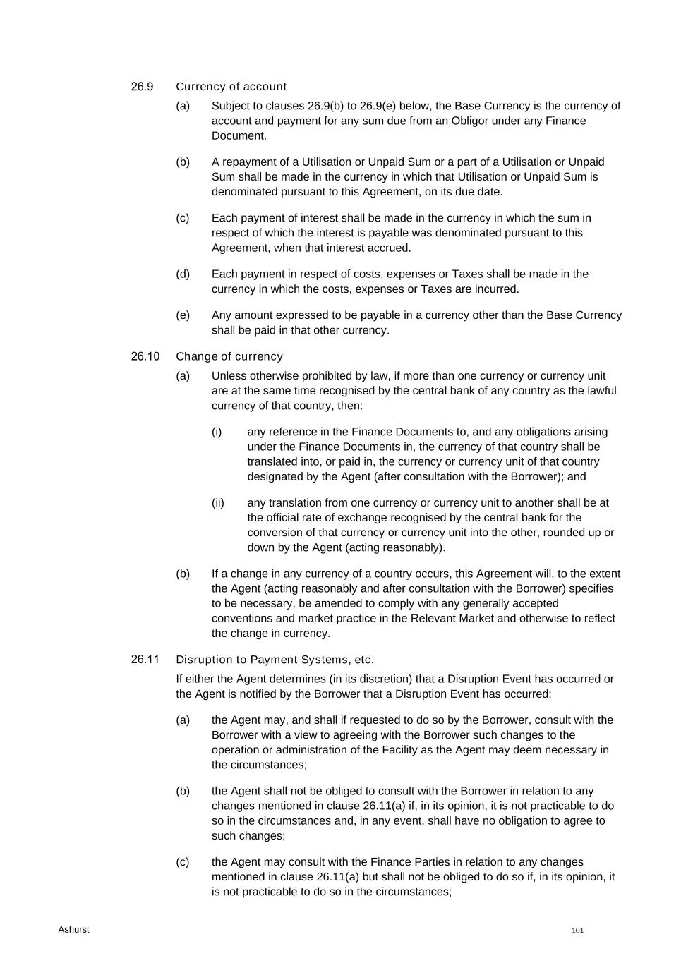Ashurst 101 Currency of account (a) Subject to clauses 26.9(b) to 26.9(e) below, the Base Currency is the currency of account and payment for any sum due from an Obligor under any Finance Document. (b) A repayment of a Utilisation or Unpaid Sum or a part of a Utilisation or Unpaid Sum shall be made in the currency in which that Utilisation or Unpaid Sum is denominated pursuant to this Agreement, on its due date. (c) Each payment of interest shall be made in the currency in which the sum in respect of which the interest is payable was denominated pursuant to this Agreement, when that interest accrued. (d) Each payment in respect of costs, expenses or Taxes shall be made in the currency in which the costs, expenses or Taxes are incurred. (e) Any amount expressed to be payable in a currency other than the Base Currency shall be paid in that other currency. Change of currency (a) Unless otherwise prohibited by law, if more than one currency or currency unit are at the same time recognised by the central bank of any country as the lawful currency of that country, then: (i) any reference in the Finance Documents to, and any obligations arising under the Finance Documents in, the currency of that country shall be translated into, or paid in, the currency or currency unit of that country designated by the Agent (after consultation with the Borrower); and (ii) any translation from one currency or currency unit to another shall be at the official rate of exchange recognised by the central bank for the conversion of that currency or currency unit into the other, rounded up or down by the Agent (acting reasonably). (b) If a change in any currency of a country occurs, this Agreement will, to the extent the Agent (acting reasonably and after consultation with the Borrower) specifies to be necessary, be amended to comply with any generally accepted conventions and market practice in the Relevant Market and otherwise to reflect the change in currency. Disruption to Payment Systems, etc. If either the Agent determines (in its discretion) that a Disruption Event has occurred or the Agent is notified by the Borrower that a Disruption Event has occurred: (a) the Agent may, and shall if requested to do so by the Borrower, consult with the Borrower with a view to agreeing with the Borrower such changes to the operation or administration of the Facility as the Agent may deem necessary in the circumstances; (b) the Agent shall not be obliged to consult with the Borrower in relation to any changes mentioned in clause 26.11(a) if, in its opinion, it is not practicable to do so in the circumstances and, in any event, shall have no obligation to agree to such changes; (c) the Agent may consult with the Finance Parties in relation to any changes mentioned in clause 26.11(a) but shall not be obliged to do so if, in its opinion, it is not practicable to do so in the circumstances;