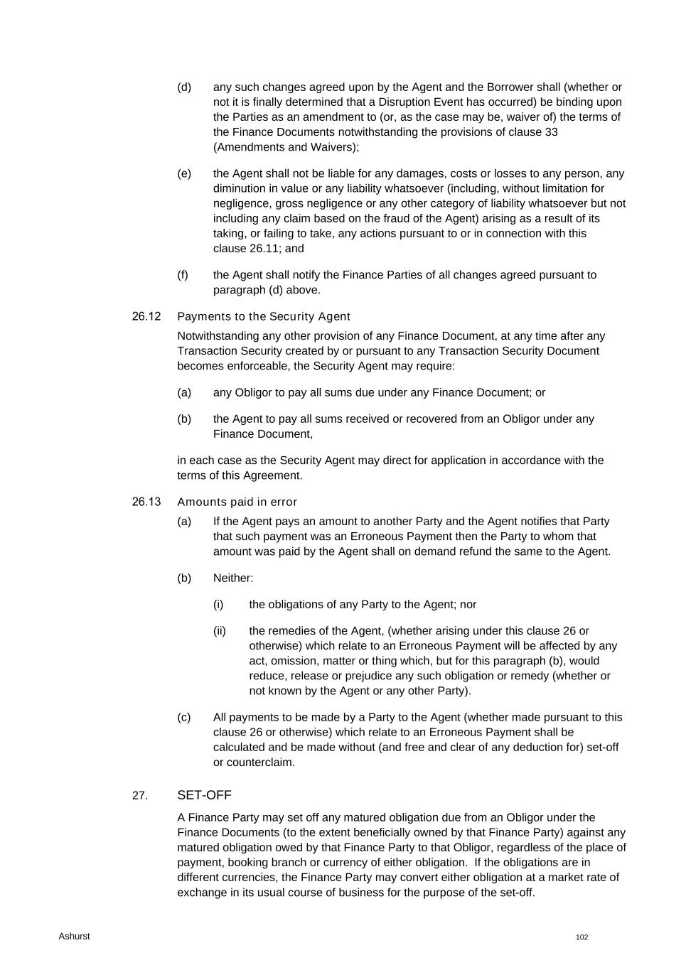 Ashurst 102 (d) any such changes agreed upon by the Agent and the Borrower shall (whether or not it is finally determined that a Disruption Event has occurred) be binding upon the Parties as an amendment to (or, as the case may be, waiver of) the terms of the Finance Documents notwithstanding the provisions of clause 33 (Amendments and Waivers); (e) the Agent shall not be liable for any damages, costs or losses to any person, any diminution in value or any liability whatsoever (including, without limitation for negligence, gross negligence or any other category of liability whatsoever but not including any claim based on the fraud of the Agent) arising as a result of its taking, or failing to take, any actions pursuant to or in connection with this clause 26.11; and (f) the Agent shall notify the Finance Parties of all changes agreed pursuant to paragraph (d) above. Payments to the Security Agent Notwithstanding any other provision of any Finance Document, at any time after any Transaction Security created by or pursuant to any Transaction Security Document becomes enforceable, the Security Agent may require: (a) any Obligor to pay all sums due under any Finance Document; or (b) the Agent to pay all sums received or recovered from an Obligor under any Finance Document, in each case as the Security Agent may direct for application in accordance with the terms of this Agreement. Amounts paid in error (a) If the Agent pays an amount to another Party and the Agent notifies that Party that such payment was an Erroneous Payment then the Party to whom that amount was paid by the Agent shall on demand refund the same to the Agent. (b) Neither: (i) the obligations of any Party to the Agent; nor (ii) the remedies of the Agent, (whether arising under this clause 26 or otherwise) which relate to an Erroneous Payment will be affected by any act, omission, matter or thing which, but for this paragraph (b), would reduce, release or prejudice any such obligation or remedy (whether or not known by the Agent or any other Party). (c) All payments to be made by a Party to the Agent (whether made pursuant to this clause 26 or otherwise) which relate to an Erroneous Payment shall be calculated and be made without (and free and clear of any deduction for) set-off or counterclaim. 27. SET-OFF A Finance Party may set off any matured obligation due from an Obligor under the Finance Documents (to the extent beneficially owned by that Finance Party) against any matured obligation owed by that Finance Party to that Obligor, regardless of the place of payment, booking branch or currency of either obligation. If the obligations are in different currencies, the Finance Party may convert either obligation at a market rate of exchange in its usual course of business for the purpose of the set-off.