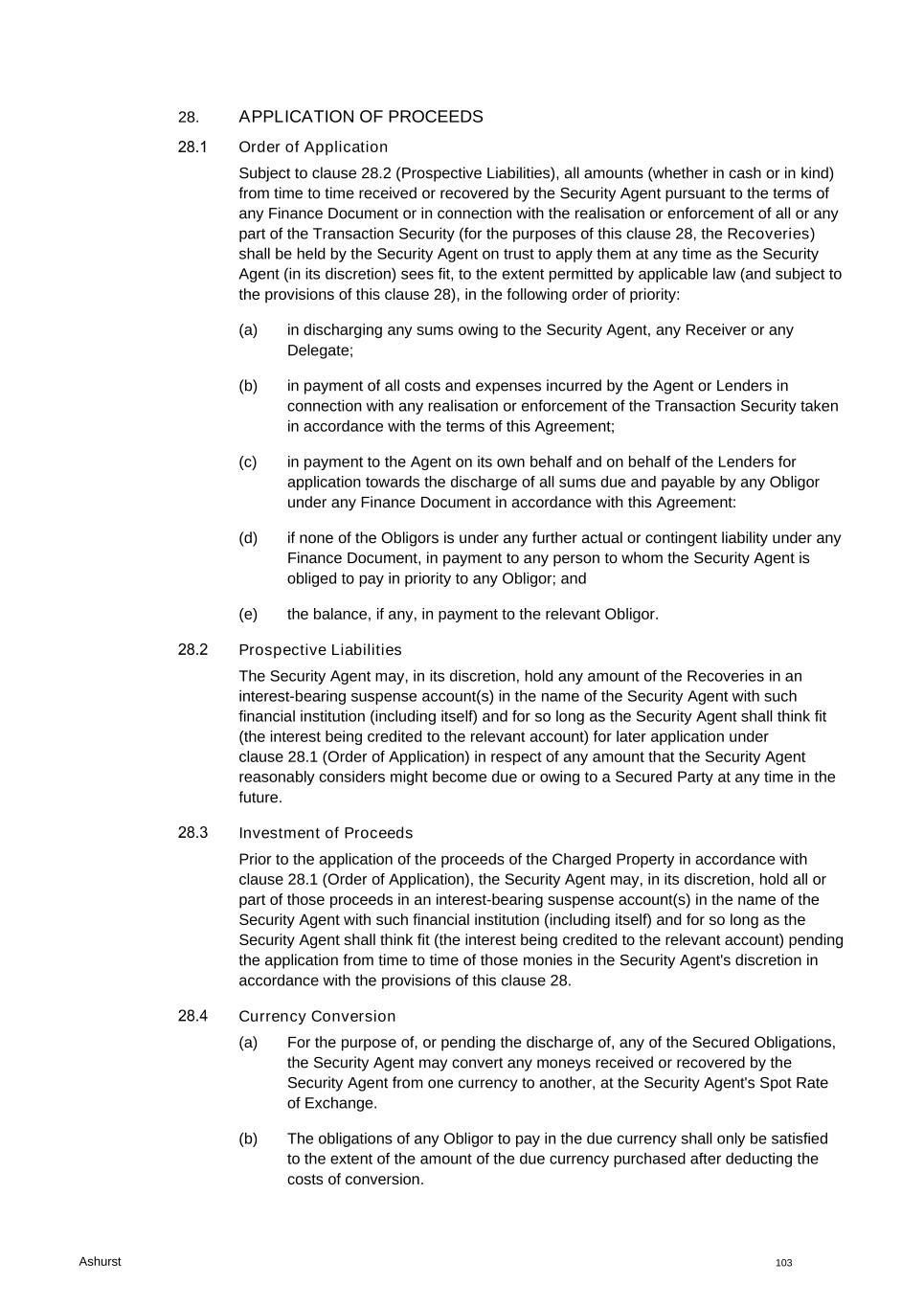 Ashurst 103 28. APPLICATION OF PROCEEDS Order of Application Subject to clause 28.2 (Prospective Liabilities), all amounts (whether in cash or in kind) from time to time received or recovered by the Security Agent pursuant to the terms of any Finance Document or in connection with the realisation or enforcement of all or any part of the Transaction Security (for the purposes of this clause 28, the Recoveries) shall be held by the Security Agent on trust to apply them at any time as the Security Agent (in its discretion) sees fit, to the extent permitted by applicable law (and subject to the provisions of this clause 28), in the following order of priority: (a) in discharging any sums owing to the Security Agent, any Receiver or any Delegate; (b) in payment of all costs and expenses incurred by the Agent or Lenders in connection with any realisation or enforcement of the Transaction Security taken in accordance with the terms of this Agreement; (c) in payment to the Agent on its own behalf and on behalf of the Lenders for application towards the discharge of all sums due and payable by any Obligor under any Finance Document in accordance with this Agreement: (d) if none of the Obligors is under any further actual or contingent liability under any Finance Document, in payment to any person to whom the Security Agent is obliged to pay in priority to any Obligor; and (e) the balance, if any, in payment to the relevant Obligor. Prospective Liabilities The Security Agent may, in its discretion, hold any amount of the Recoveries in an interest-bearing suspense account(s) in the name of the Security Agent with such financial institution (including itself) and for so long as the Security Agent shall think fit (the interest being credited to the relevant account) for later application under clause 28.1 (Order of Application) in respect of any amount that the Security Agent reasonably considers might become due or owing to a Secured Party at any time in the future. Investment of Proceeds Prior to the application of the proceeds of the Charged Property in accordance with clause 28.1 (Order of Application), the Security Agent may, in its discretion, hold all or part of those proceeds in an interest-bearing suspense account(s) in the name of the Security Agent with such financial institution (including itself) and for so long as the Security Agent shall think fit (the interest being credited to the relevant account) pending the application from time to time of those monies in the Security Agent's discretion in accordance with the provisions of this clause 28. Currency Conversion (a) For the purpose of, or pending the discharge of, any of the Secured Obligations, the Security Agent may convert any moneys received or recovered by the Security Agent from one currency to another, at the Security Agent's Spot Rate of Exchange. (b) The obligations of any Obligor to pay in the due currency shall only be satisfied to the extent of the amount of the due currency purchased after deducting the costs of conversion.