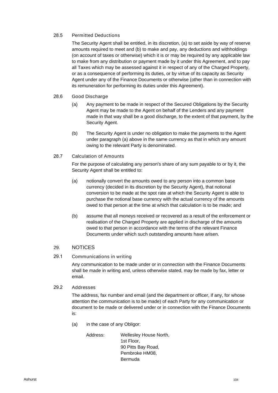 Ashurst 104 Permitted Deductions The Security Agent shall be entitled, in its discretion, (a) to set aside by way of reserve amounts required to meet and (b) to make and pay, any deductions and withholdings (on account of taxes or otherwise) which it is or may be required by any applicable law to make from any distribution or payment made by it under this Agreement, and to pay all Taxes which may be assessed against it in respect of any of the Charged Property, or as a consequence of performing its duties, or by virtue of its capacity as Security Agent under any of the Finance Documents or otherwise (other than in connection with its remuneration for performing its duties under this Agreement). Good Discharge (a) Any payment to be made in respect of the Secured Obligations by the Security Agent may be made to the Agent on behalf of the Lenders and any payment made in that way shall be a good discharge, to the extent of that payment, by the Security Agent. (b) The Security Agent is under no obligation to make the payments to the Agent under paragraph (a) above in the same currency as that in which any amount owing to the relevant Party is denominated. Calculation of Amounts For the purpose of calculating any person's share of any sum payable to or by it, the Security Agent shall be entitled to: (a) notionally convert the amounts owed to any person into a common base currency (decided in its discretion by the Security Agent), that notional conversion to be made at the spot rate at which the Security Agent is able to purchase the notional base currency with the actual currency of the amounts owed to that person at the time at which that calculation is to be made; and (b) assume that all moneys received or recovered as a result of the enforcement or realisation of the Charged Property are applied in discharge of the amounts owed to that person in accordance with the terms of the relevant Finance Documents under which such outstanding amounts have arisen. 29. NOTICES Communications in writing Any communication to be made under or in connection with the Finance Documents shall be made in writing and, unless otherwise stated, may be made by fax, letter or email. Addresses The address, fax number and email (and the department or officer, if any, for whose attention the communication is to be made) of each Party for any communication or document to be made or delivered under or in connection with the Finance Documents is: (a) in the case of any Obligor: Address: Wellesley House North, 1st Floor, 90 Pitts Bay Road, Pembroke HM08, Bermuda